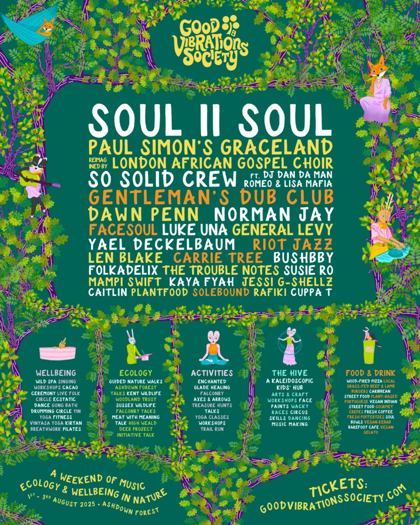 Music pulses through the weekend, with headline acts shaking up the vibe on Sunday from legendary Soul II Soul, Saturday bringing a breathtaking reimagined Graceland experience by the London African Gospel Choir, and Friday igniting the party with garage-garage icons So Solid Crew. Between sets, explore spoken-word talks on ecology and conservation, guided forest walks, playful art installations, and lively workshops—everything from cacao ceremonies and sound healing to inspiring conversations on rewilding our relationship with nature.