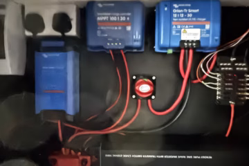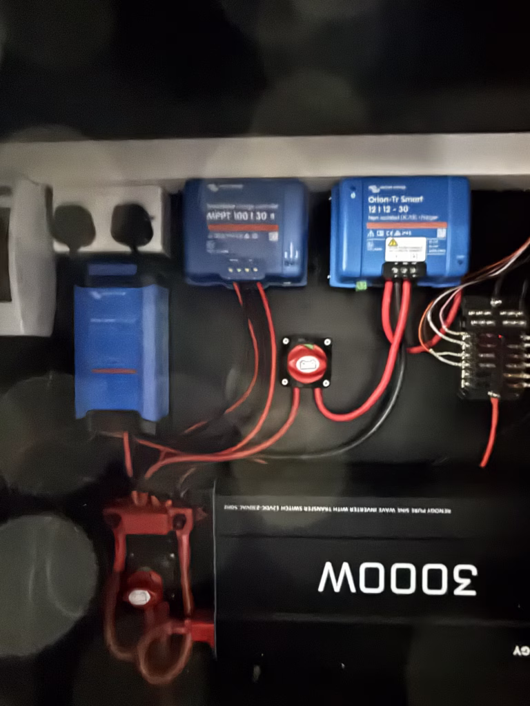 🔋 Off-grid electrical setup: solar panels, inverter, DC to DC charger