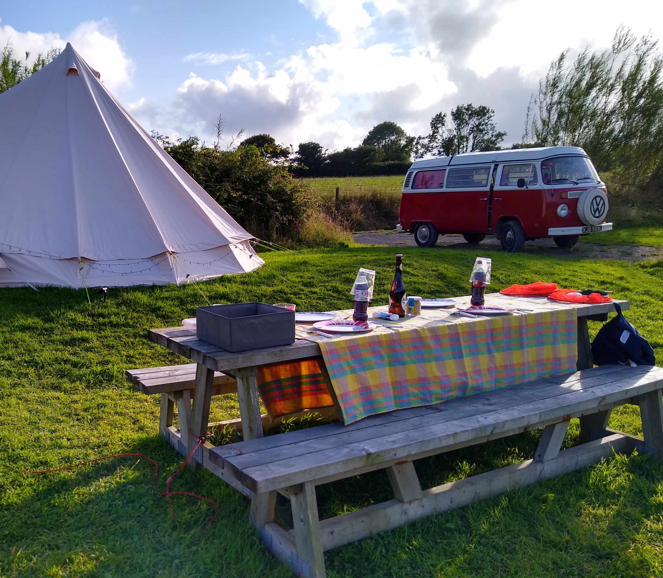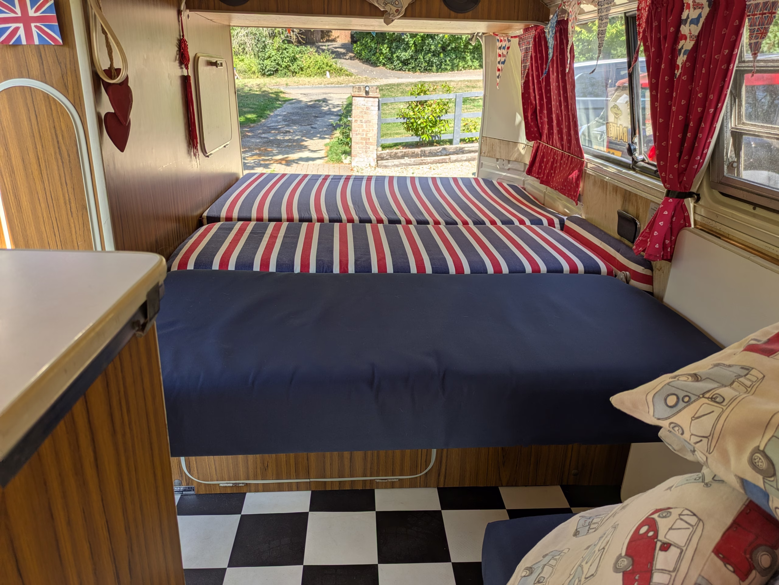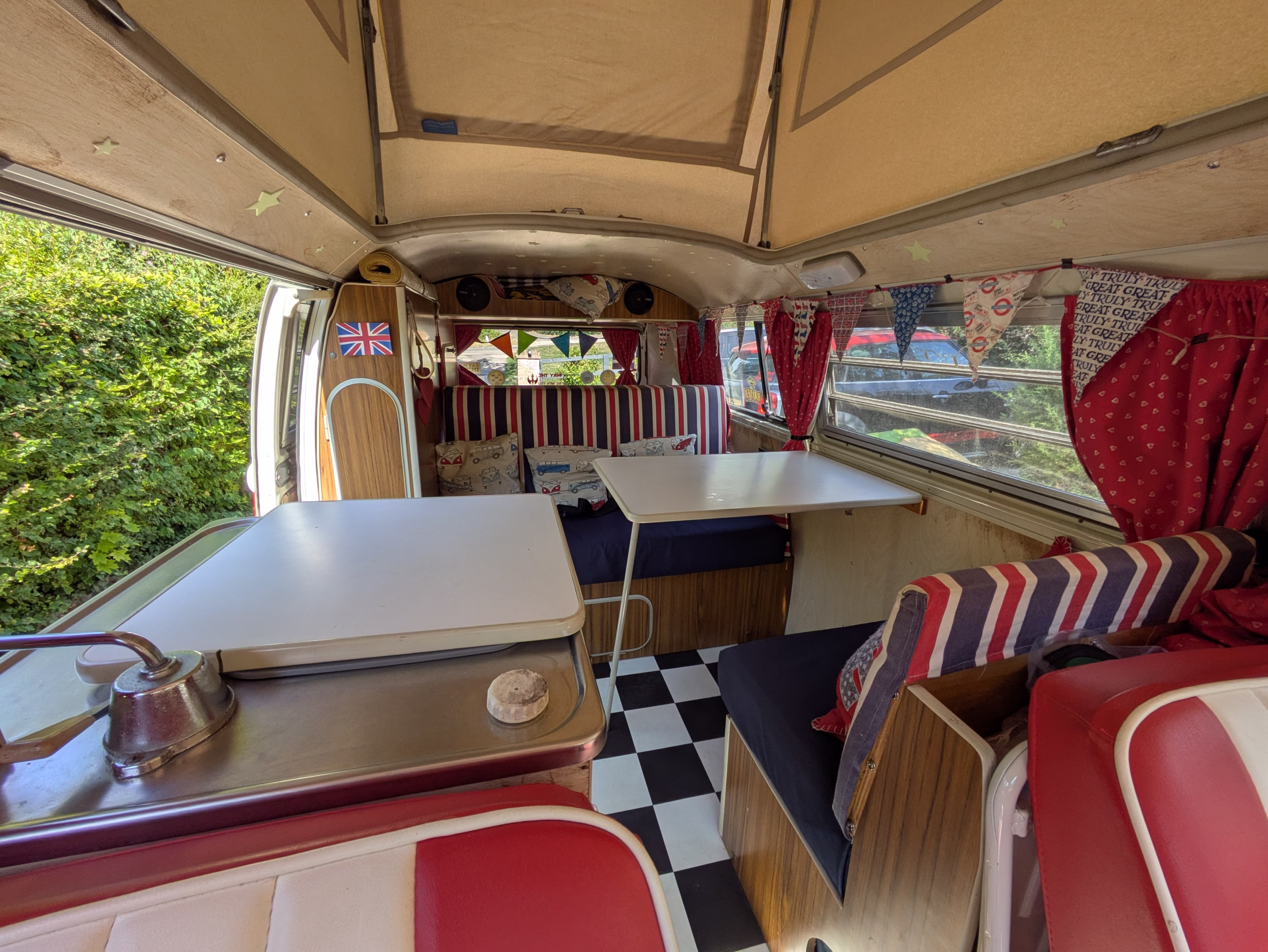 Ready for the whole family with the original rock-and-roll double bed, a double bed in the pop-top, and the original single bunk frame is available (just needs a new canvas to be perfect), and if you have more than four to sleep, then just hook up the Outwell drive away awning she comes with (included in the price).