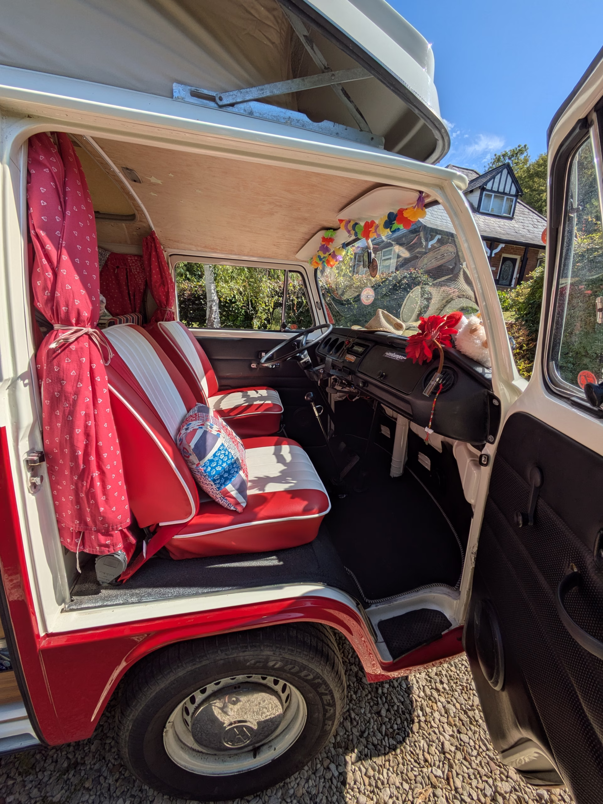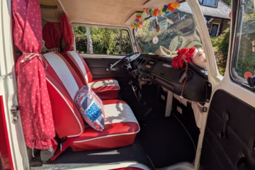 When we first got her we had her resprayed inside and out. Insulation and new carpets were added, together with new flooring. At the end of 2015/beginning of 2016 she underwent a full engine rebuild, including twin Dellorto carbs, expertly handled by The VW Camper Company in Banbury. She has covered only 6,000 reliable miles since. Over the years with us she has had a new clutch, starter motor and electronic ignition fitted, together with an oil temperature gauge and an electric fuel pump, all helping to make her a reliable and easy to maintain van.