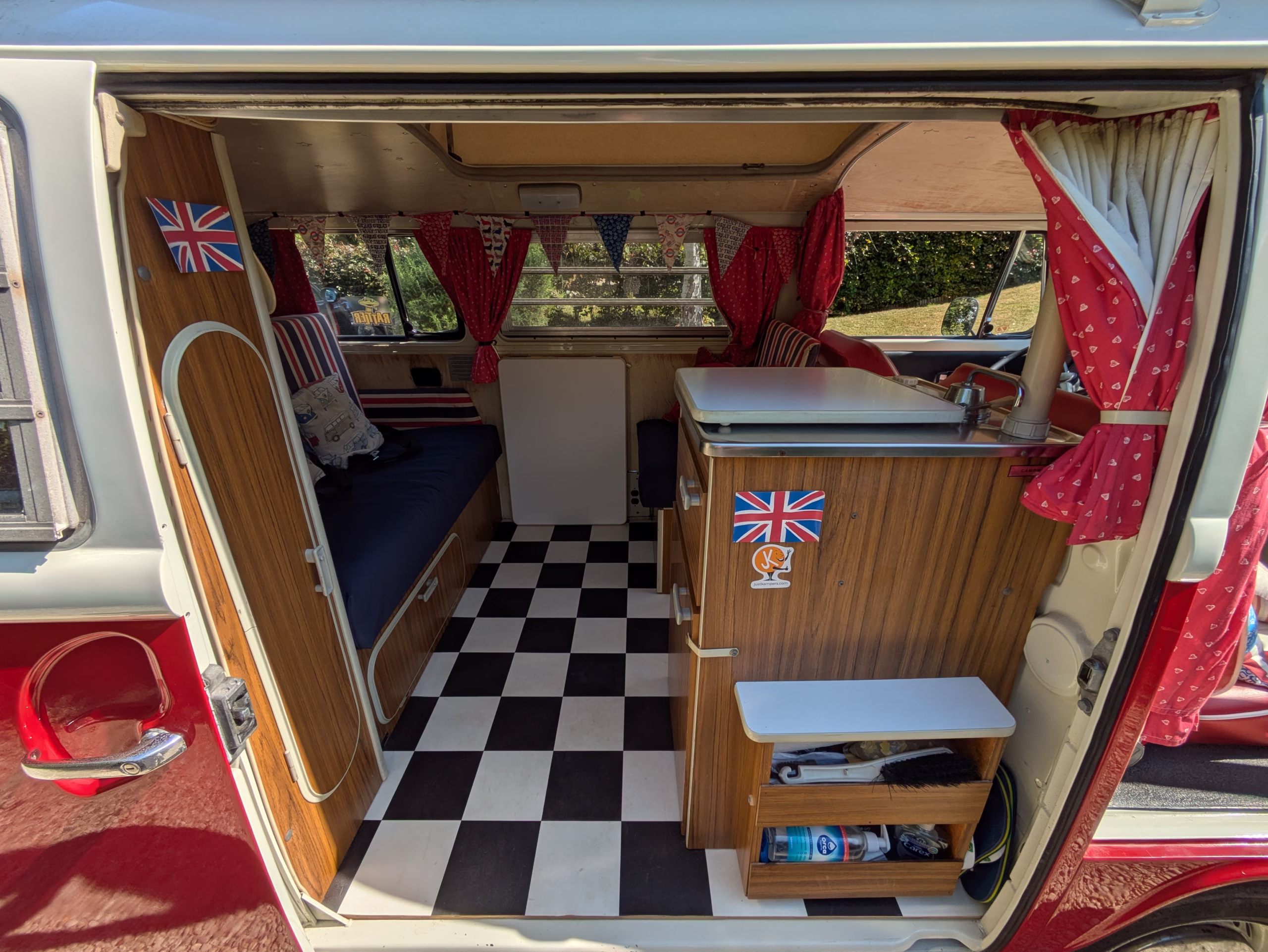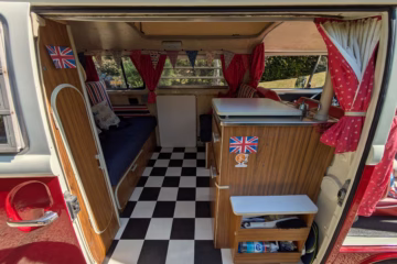 We have purposefully preserved Ruby’s original charm. Inside, you’ll find the iconic original Westfalia furniture layout with original cabinets, icebox and sink, albeit with our own take on furnishing fabrics. Because she was a California spec, she never had internal gas appliances and we have kept her like this, cooking and washing up outside the van.