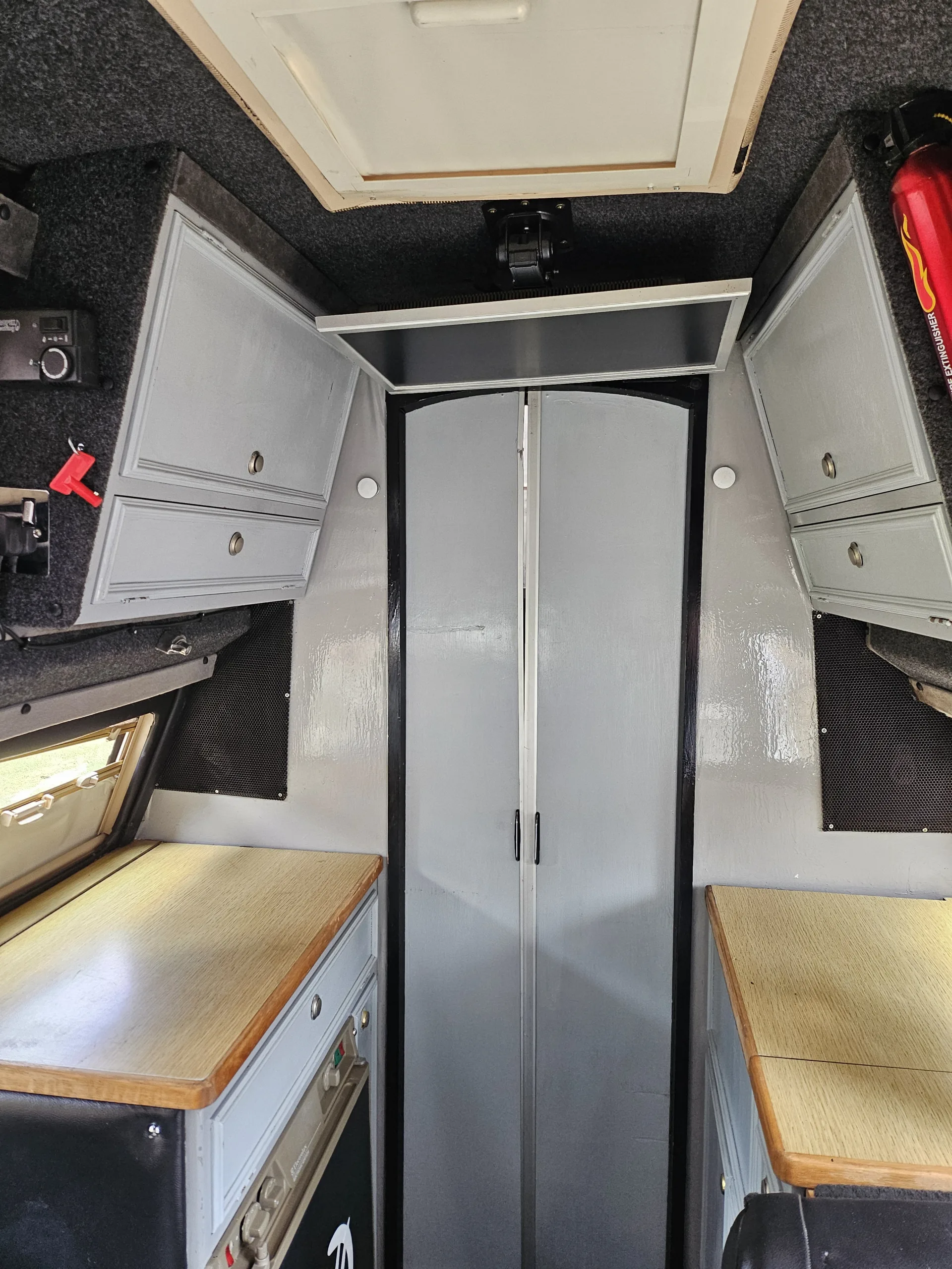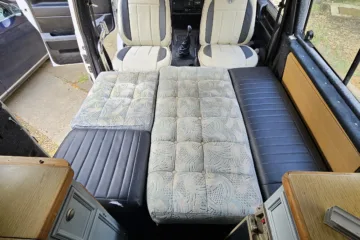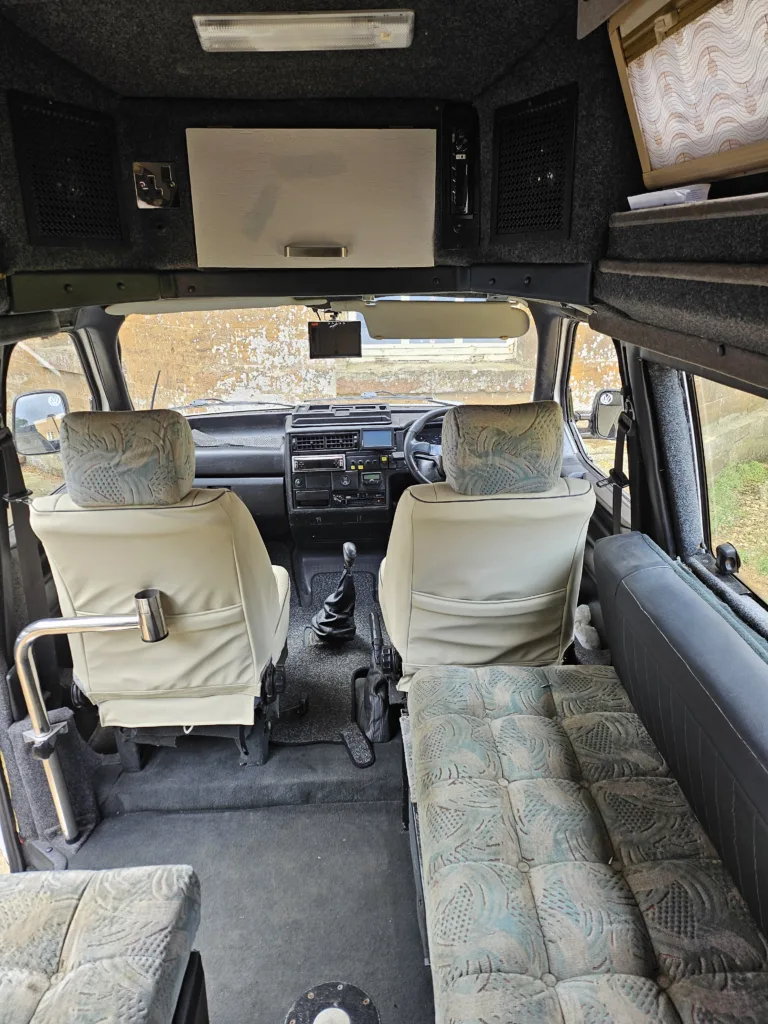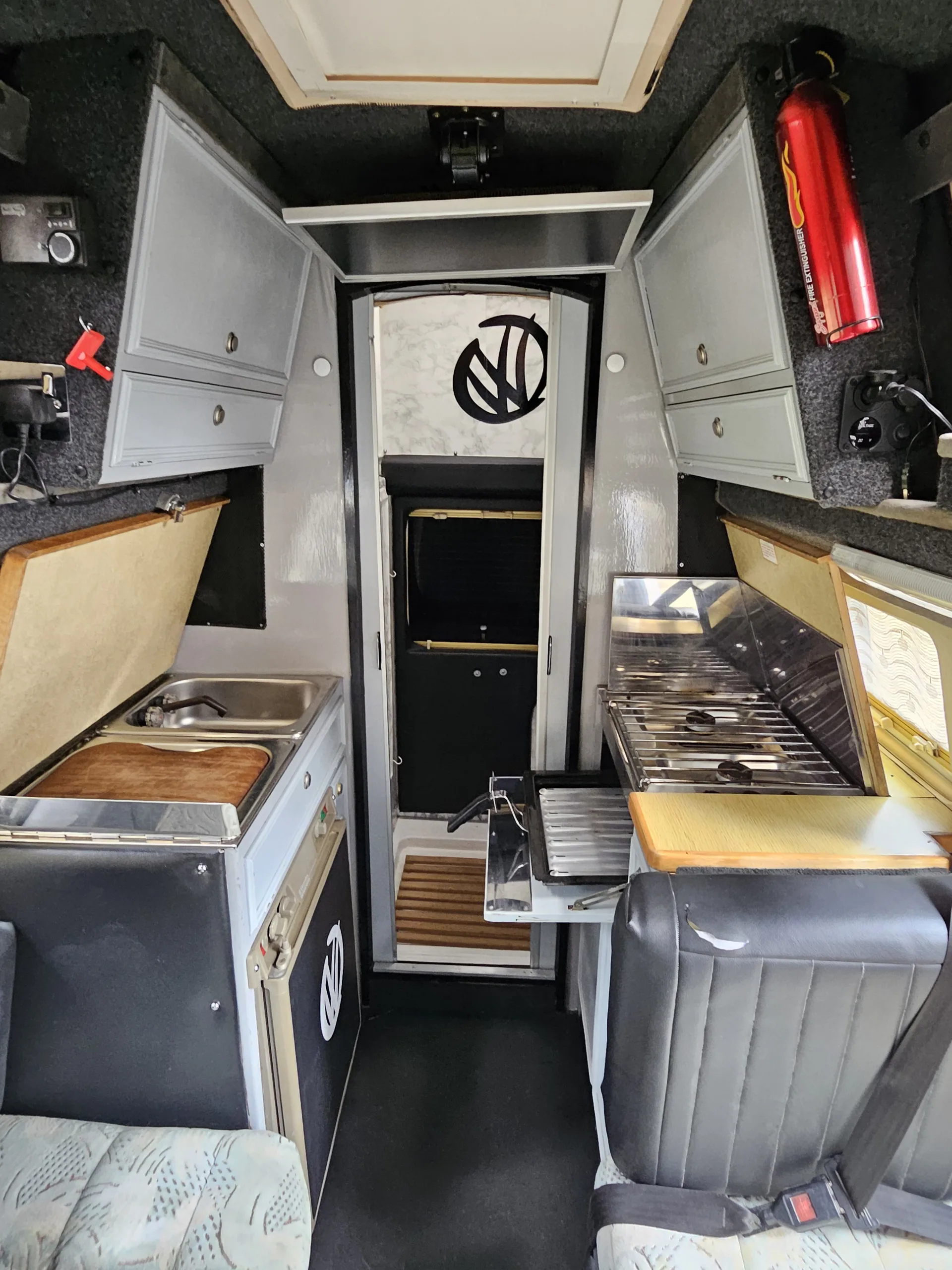 * Seating: Front seats have new fake leather covers and swivel. Rear seats convert into a double bed. Plenty of storage cupboards and drawers, with black carpeting throughout.