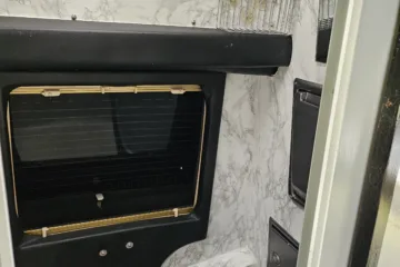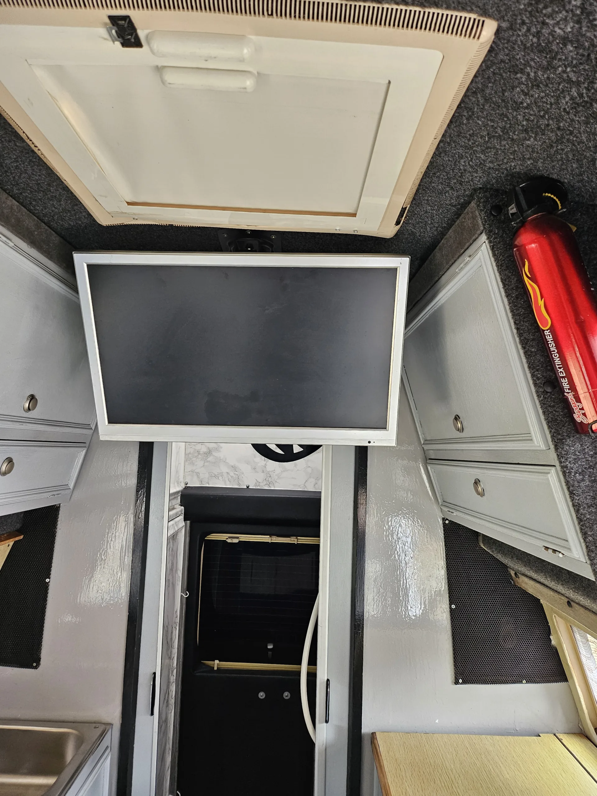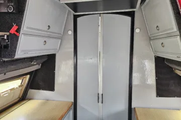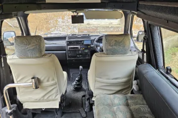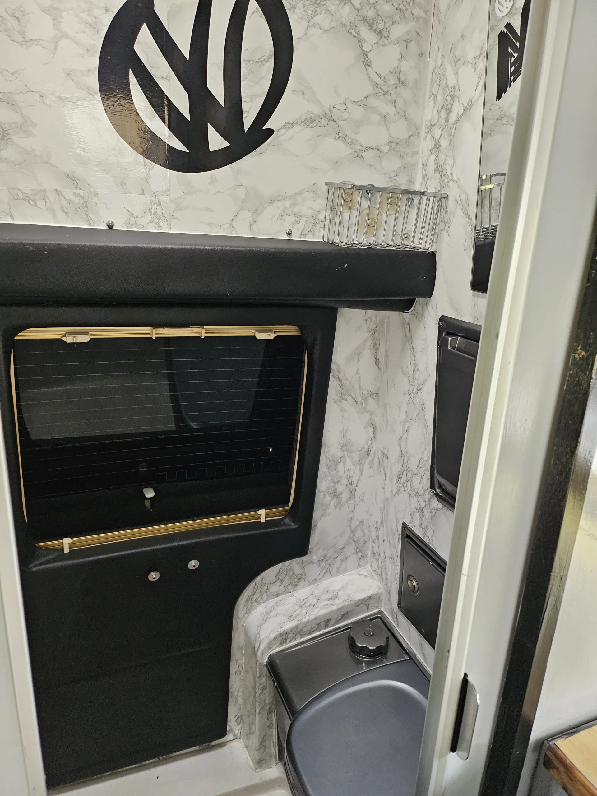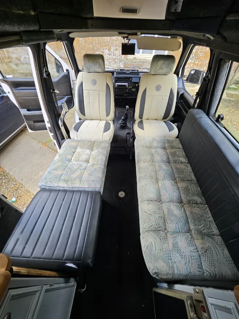 * Seating: Front seats have new fake leather covers and swivel. Rear seats convert into a double bed. Plenty of storage cupboards and drawers, with black carpeting throughout.