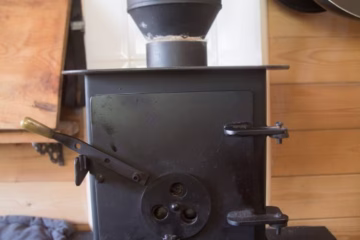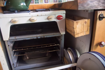 In the back, there is a double bed (with deep storage down the side of it) and two portholes above the cab. And then there’s also an L-shaped sofa and there is stairs (up to the bed area) which are also cupboards. As well as 7 or 8 apple crate cupboards that run along the top corners of the van. There is deep storage under the L shaped sofa too. There is a wardrobe (with extra storage) and a brand new wood burner in the van which I recently fitted/upgraded and tiled behind. There is a twin gas cooker which also has an oven and a toaster grill bit. This is hooked up to a large gas bottle which sits at the very rear of the van (outside). There are two sliding windows (one on each side of the van with blinds/mesh screens). There’s also a workbench/ table that folds out on the wall. And underneath there’s an ottoman which is moveable to be your seating. This can also become a double bed by the L-shaped sofa. A small person/child can definitely sleep on that sofa (a tall adult might be a bit of a tight squeeze).