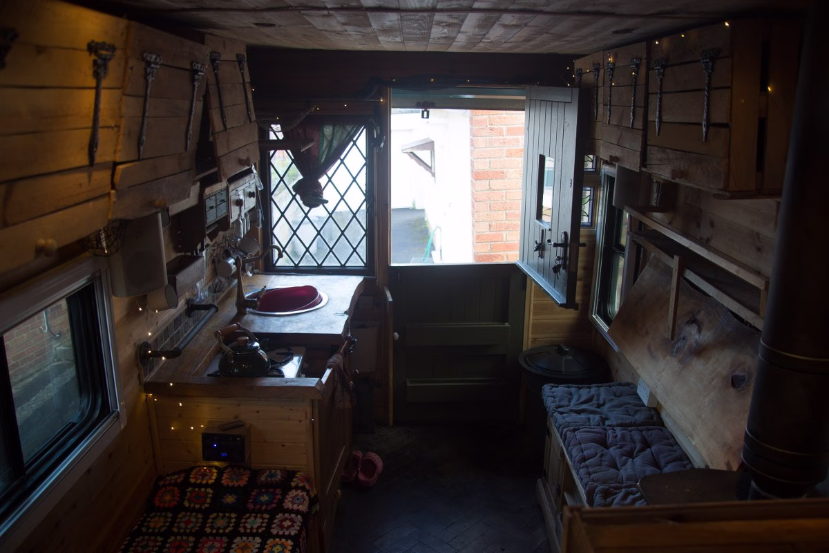 The floor is done in a herringbone style with reclaimed Mahogony wood. The back rear wall has stable door and x2 stained glass windows. The large Tudor window on the back wall opens and has a dead bolt. The sink for the kitchen is on demand so it will only run when you open the tap (it’s a shurflo pump which are really high quality pumps that should last a lifetime if you’re not silly with it)