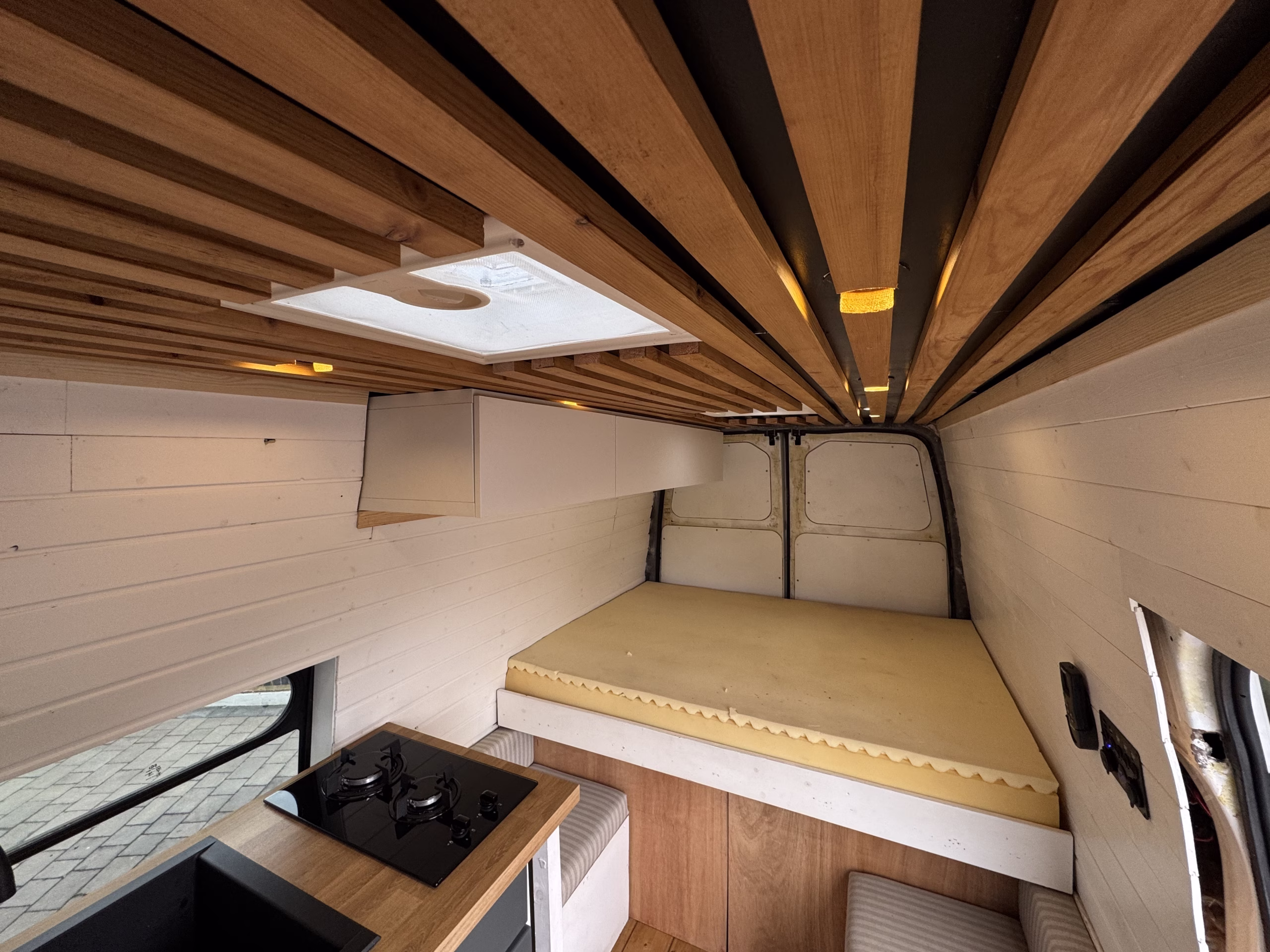 The van features a comfortable double bed designed with a smart extendable section, giving you extra length when needed. This means you can sleep fully stretched out without compromise, while still keeping valuable living space during the day.