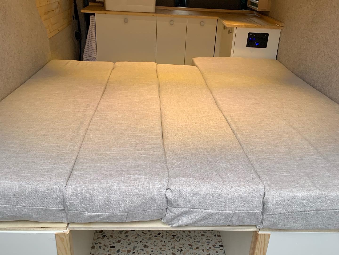 We custom built 2 benches from extra light ply wood which have loads of storage and a large cool box with is included in the sale. They are painted in Farrell and Ball paint. The seating has a memory foam topper which makes a super comfy bed. The seating covers are easily removed for washing. The 2 benches convert into a large bed.