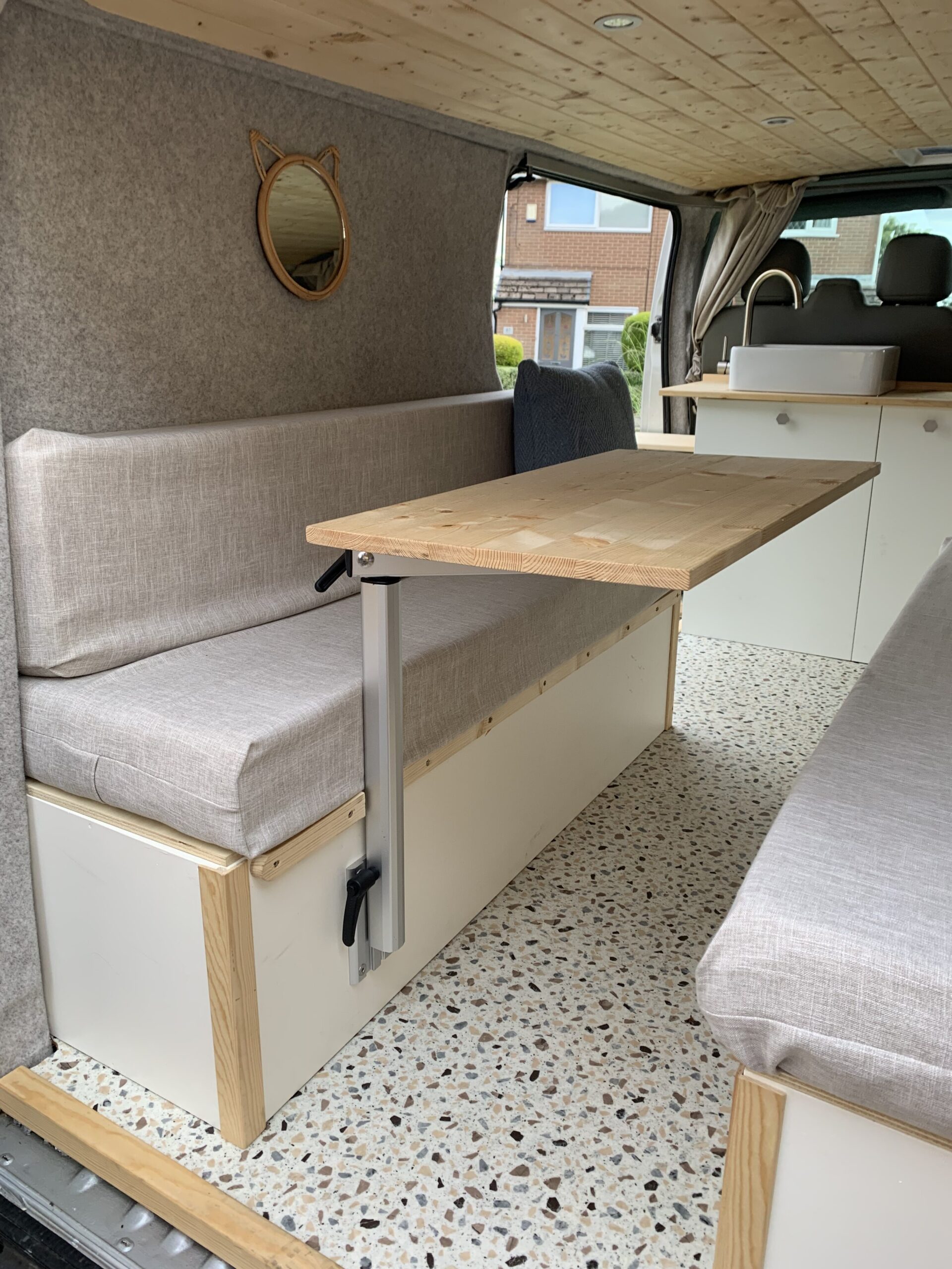 The flooring is a durable vinyl and covers whole of the floor of the van including under the benches and kitchen.
