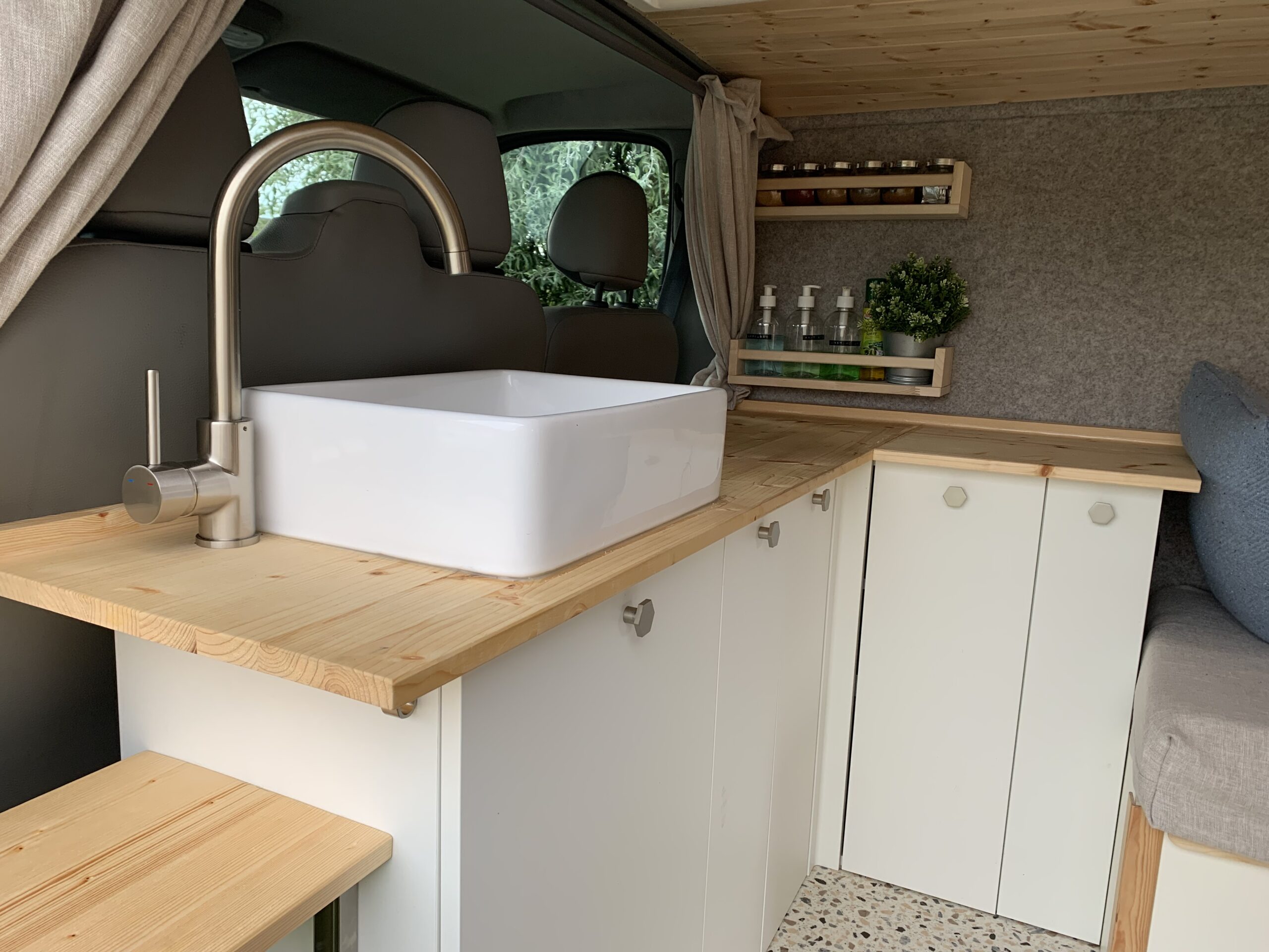 It has a corner kitchen with counter sink tap and water pump clean water and grey water bottles under the sink. There are 3 cupboards for additional storage for kitchen bits etc. There is a lift up table for outside cooking on the side of the kitchen.