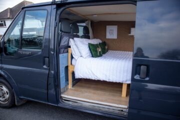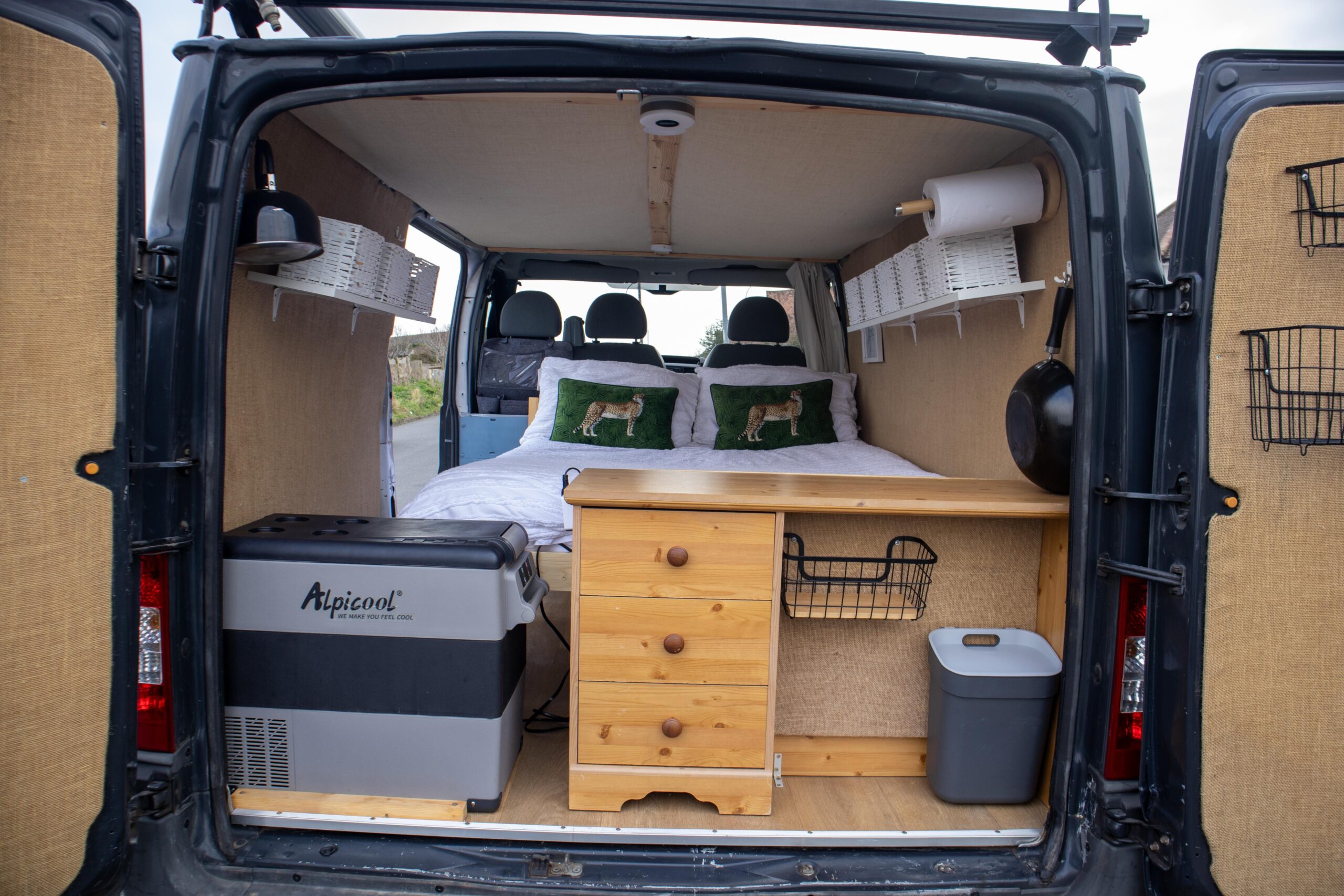 It has a fixed double bed, is insulated and has solar power set up- as well as a fridge, cooker and everything else you need to enjoy van life!