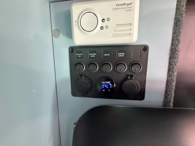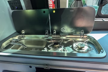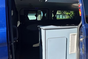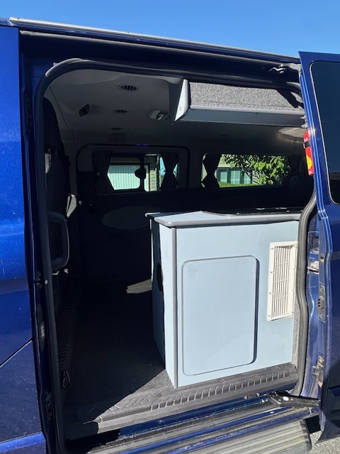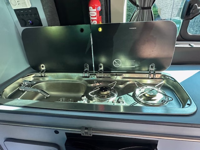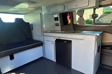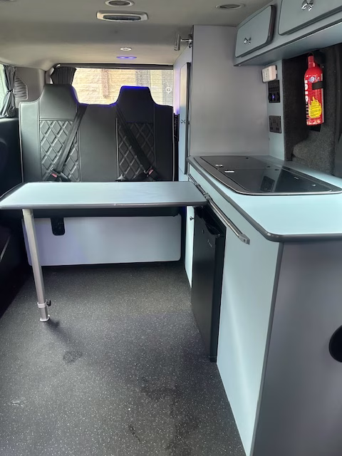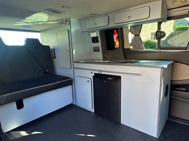 Kitchen and cupboard storage unit in light blue ply (set on the nearside of the van due to the large rear aircon unit being at the back on the nearside), with 2 cupboards and 2 overhead cupboards. 2 Burner Dometic integrated Hob with auto ignition and single tap Sink, 6kg calor propane bottle, additional 12v battery, water pump, 2 x 10 litre fresh and waste water carriers, Smad 2 way absorbtion fridge (12v & 240V), 2 x 240v sockets with USB charging points, 240v electric hook up and control unit, 3 x 12v lighting, plus LED light strip at base of kitchen unit, vinyl flooring, blackout curtains for middle, rear and tailgate windows and 3 x silver screens for front windows.