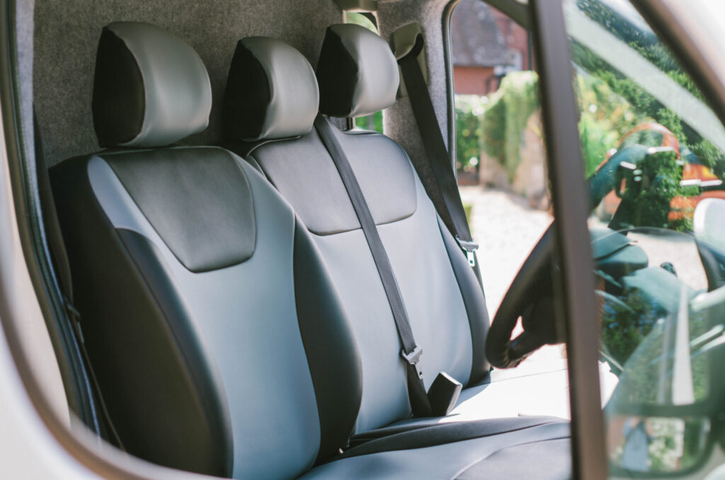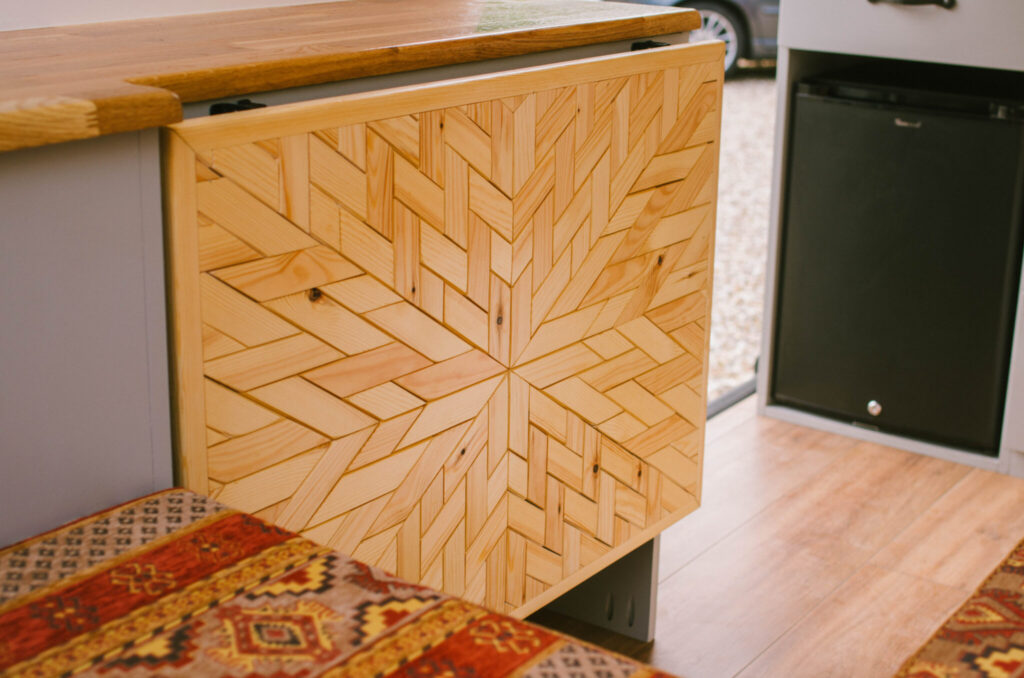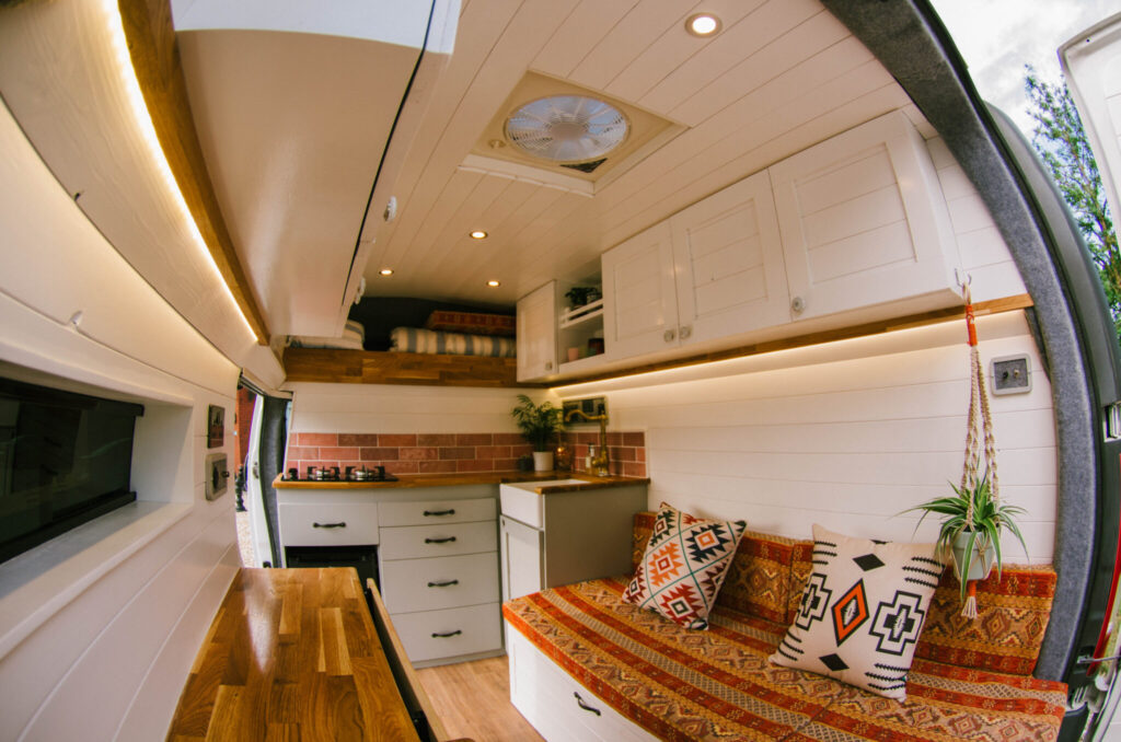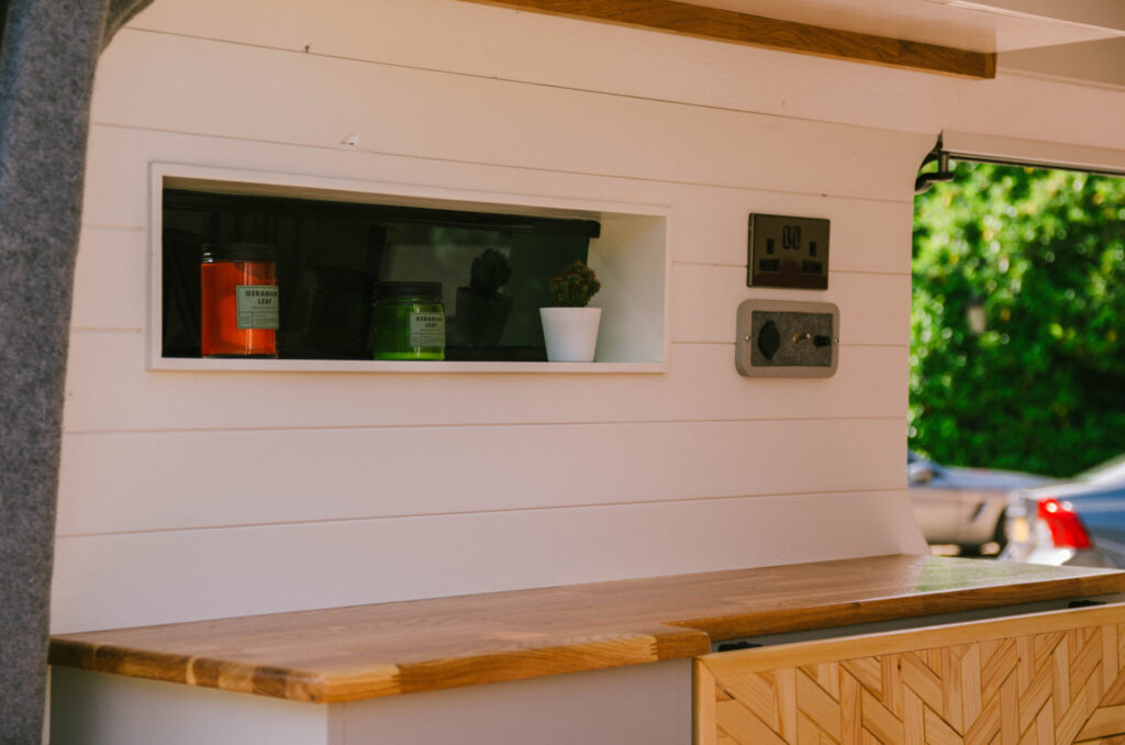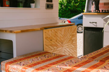 Inside the van is a custom-made L-shaped sitting area with a beautiful bespoke fold-out table. This sitting area pulls out to form a bed measuring 1.80m x 1.20m.