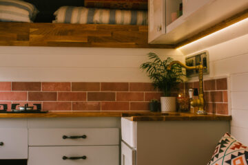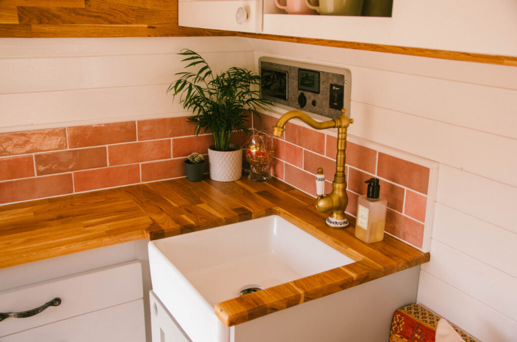 There is a modern electrical system in the van. Some of the main features of this system include a 250W solar panel & a switch charge relay, 240v outlets, dimmable led lights, led strip lighting, USB/USB C outlets, intelligent battery monitor, and a 40L fridge. This conversion has a double gas burner in black glass that is fed by a refillable 6.0kg (11.5L) Gaslow tank. The conversion also features a Fiamma Turbo Premium roof vent with an extractor fan that can be operated in both directions to draw air into or out of the campervan. There is also a ceramic Belfast sink and traditional styled brass tap fed by an electric water pump, as well as underslung fresh water and grey water tanks.