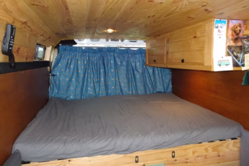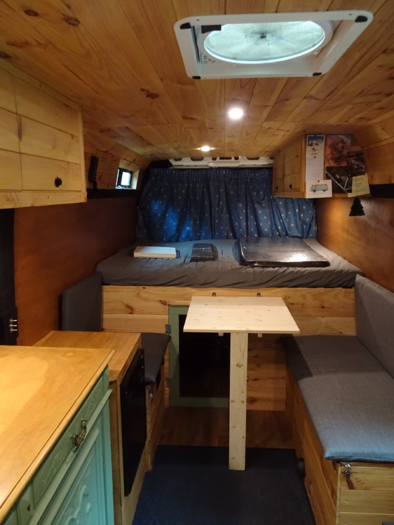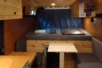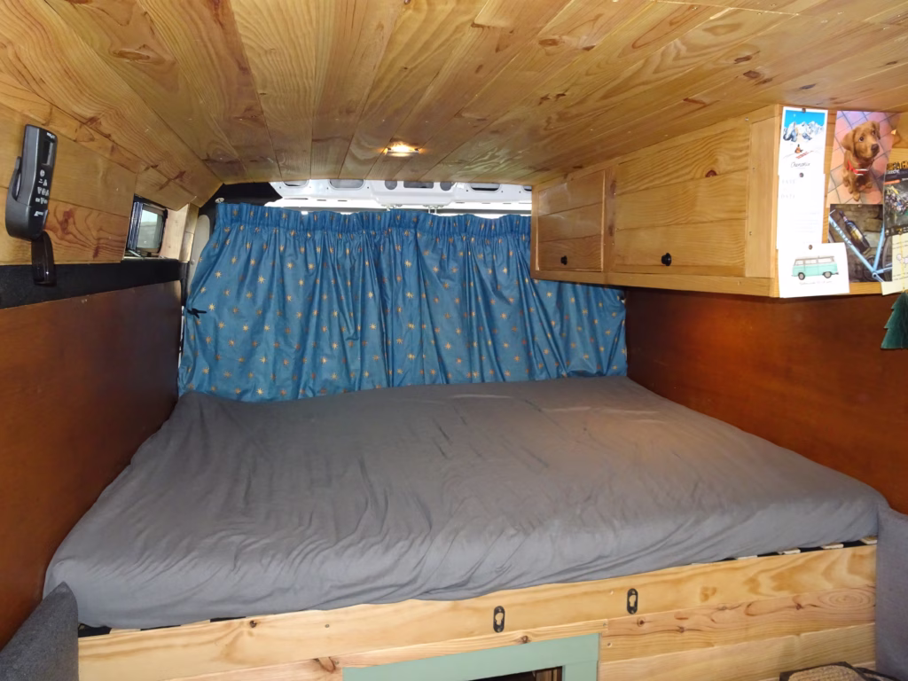 Fixed double at rear of van. Full double bed dimensions, so comfortably suitable for 2 people (maybe with a kid too if you’re a small family!)