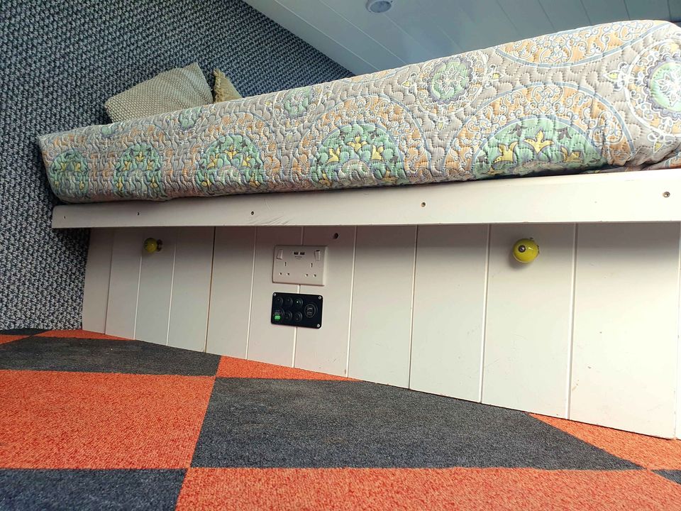 Attractive white wood panelled ceiling. Lots of under bed storage which is accessible from the rear and from inside. Has a self-charging 12/240v leisure battery, curtains, LED lights, USB ports. Awning also included, with removable sleep pod.