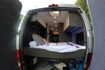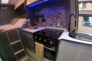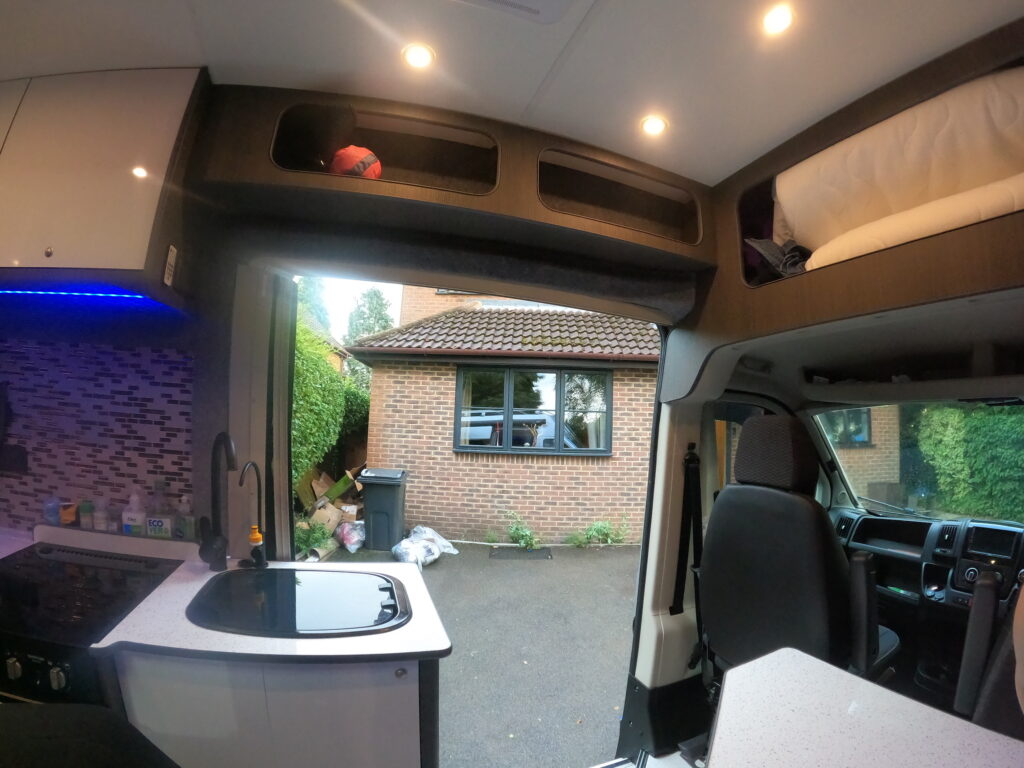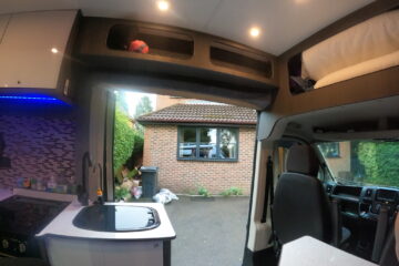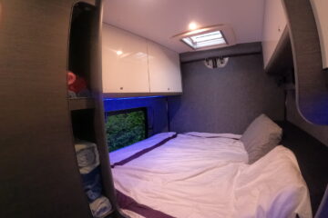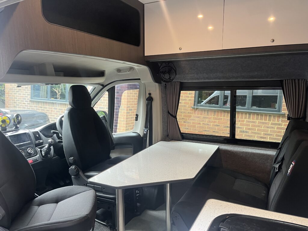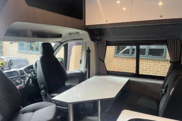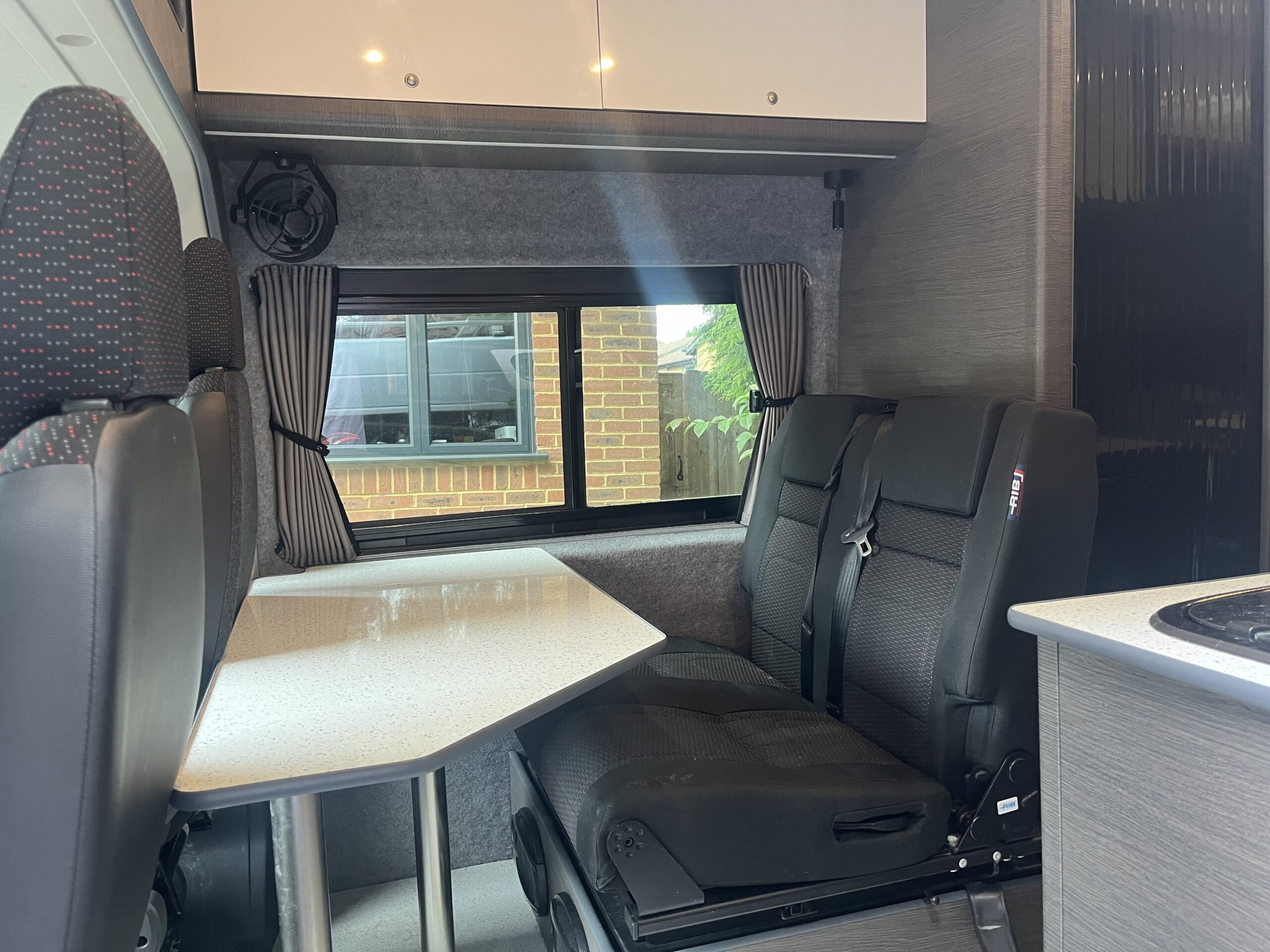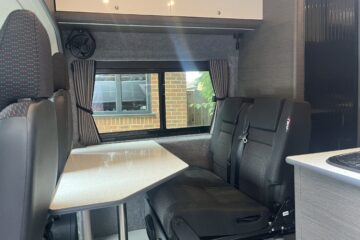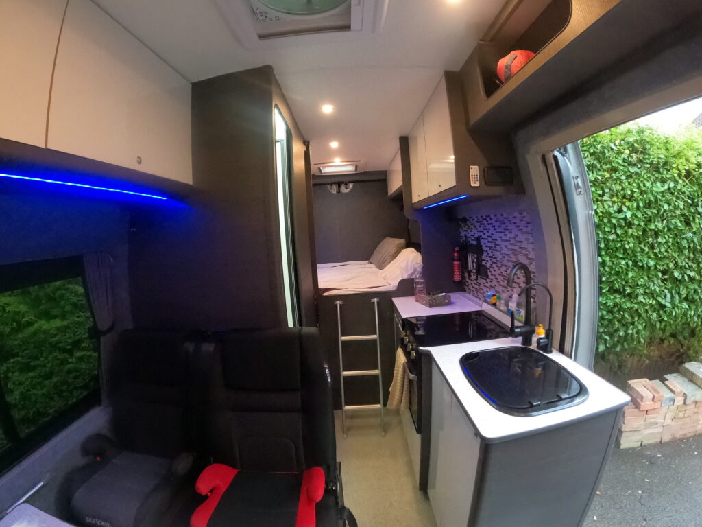 The driver and passenger seats both swivel to provide 4-person dining around the table, which can be left in place whilst travelling which the kids love. The front seats convert in to a second bed in just a few minutes, suitable for sleeping 2 kids or 1 adult. More lighting and USB sockets are also available here for charging including a mains socket.
