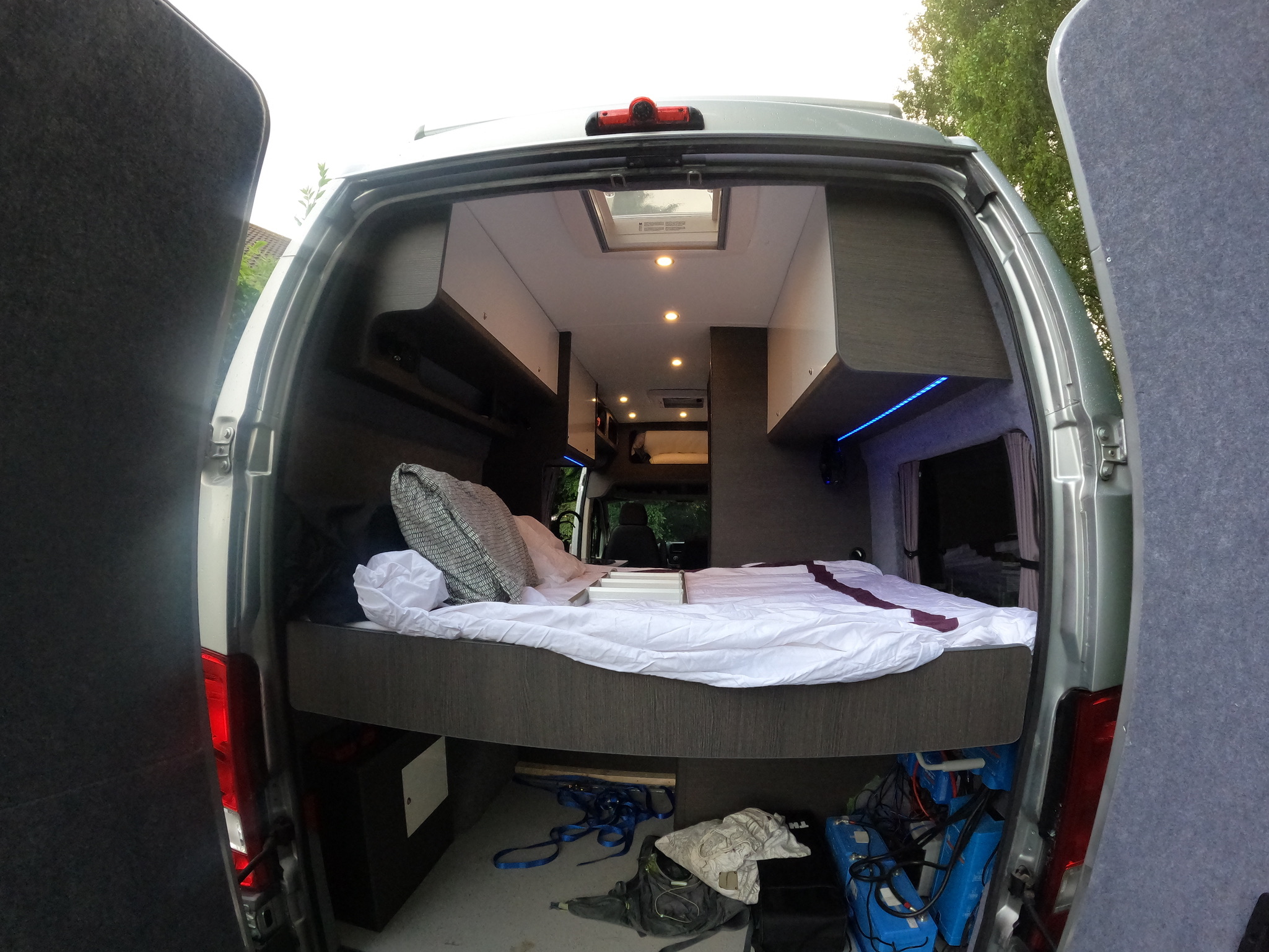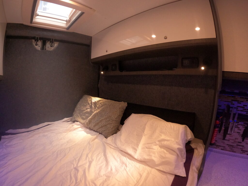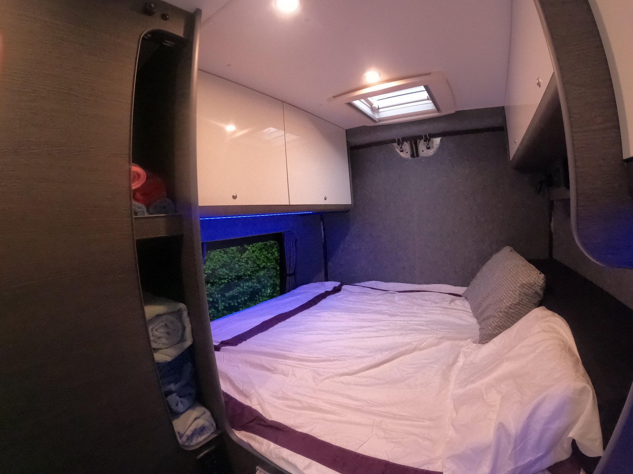 An extremely spacious and comfortable fixed rear bed with plenty of clothes storage overhead, reading lights and USB sockets for charging all your phones/tablets/etc.