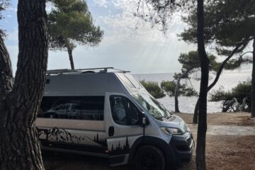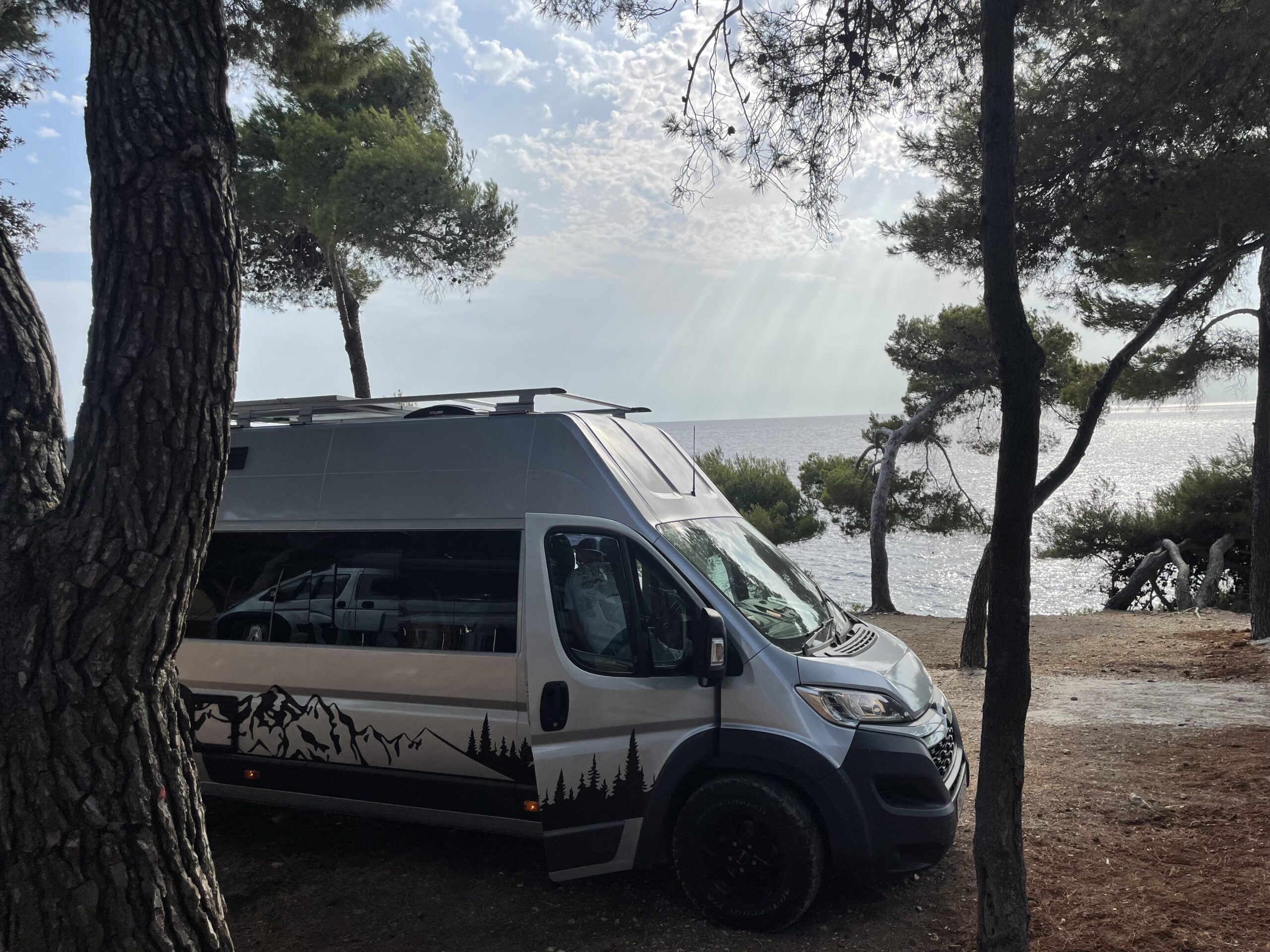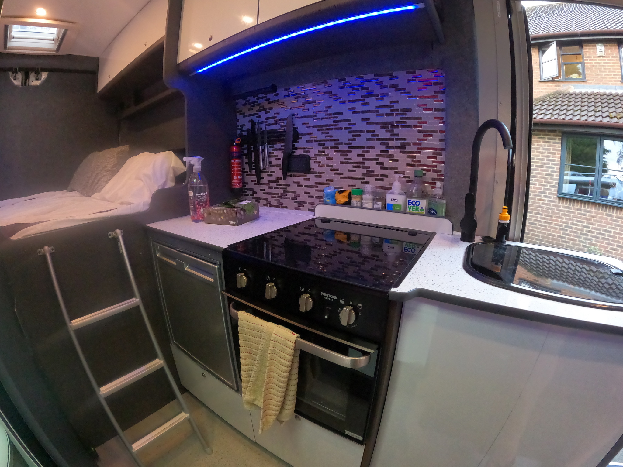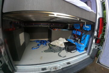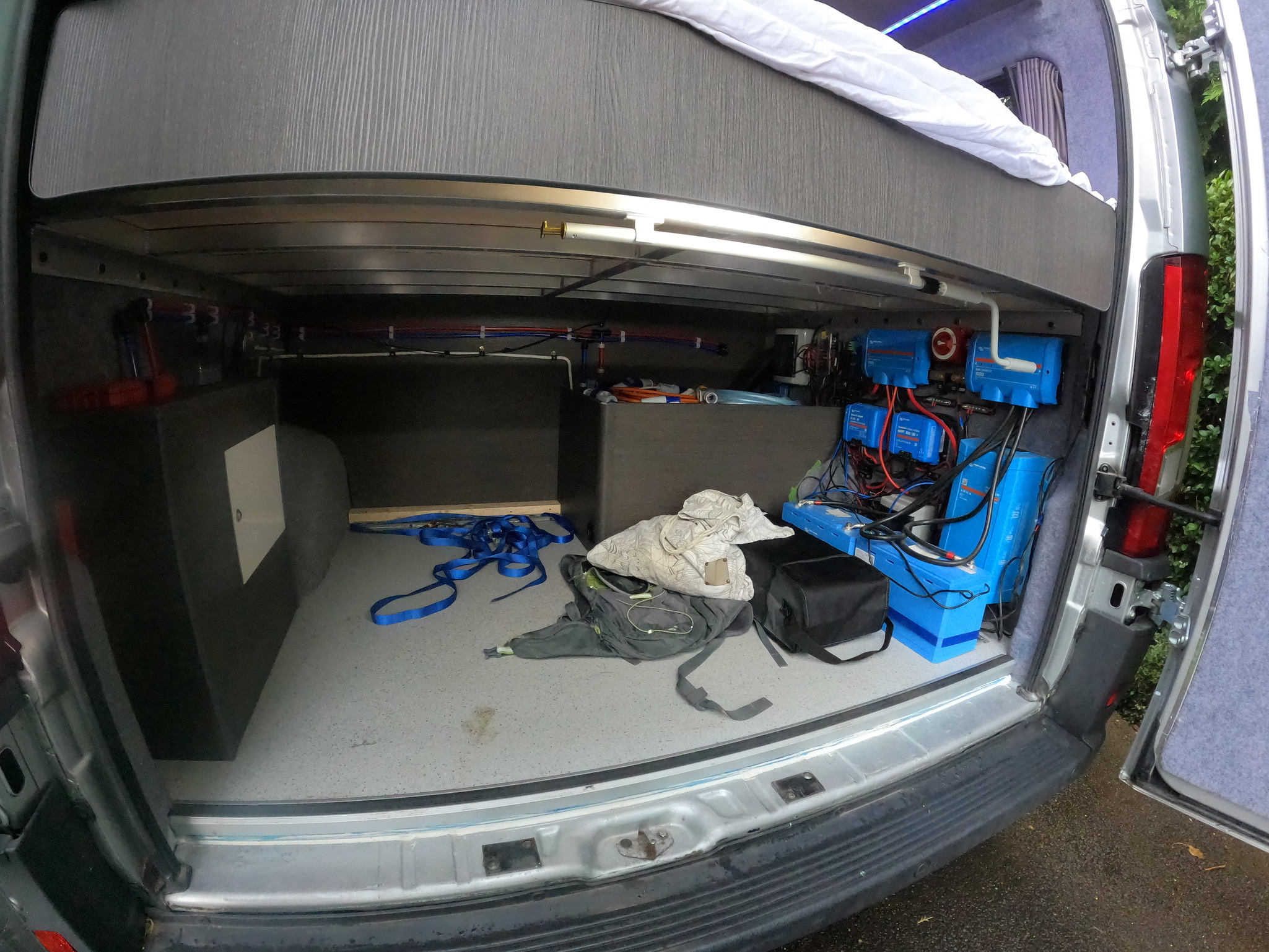 – Victron Lithium off grid 350W solar and battery set up, mains inverter, with the ability to hook up to mains electric at campsite as well as charge from the engine via DC-DC – never worry about power!