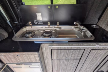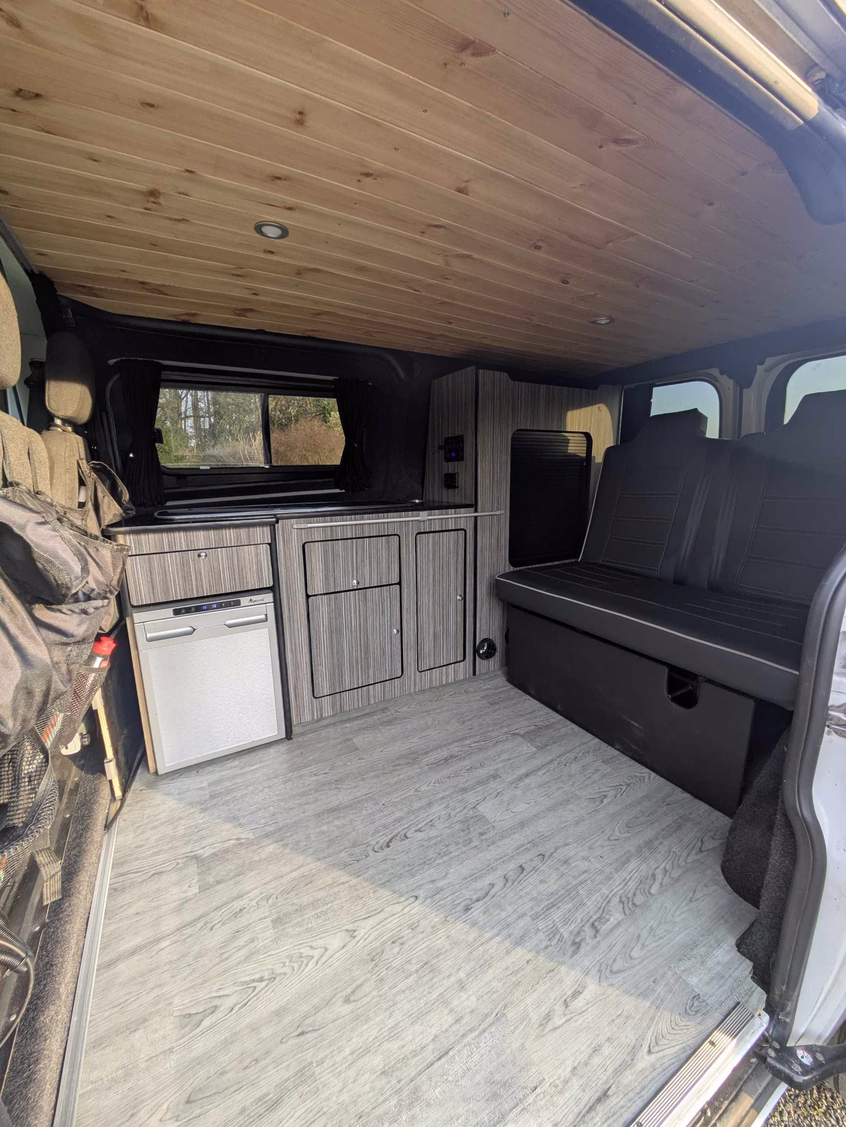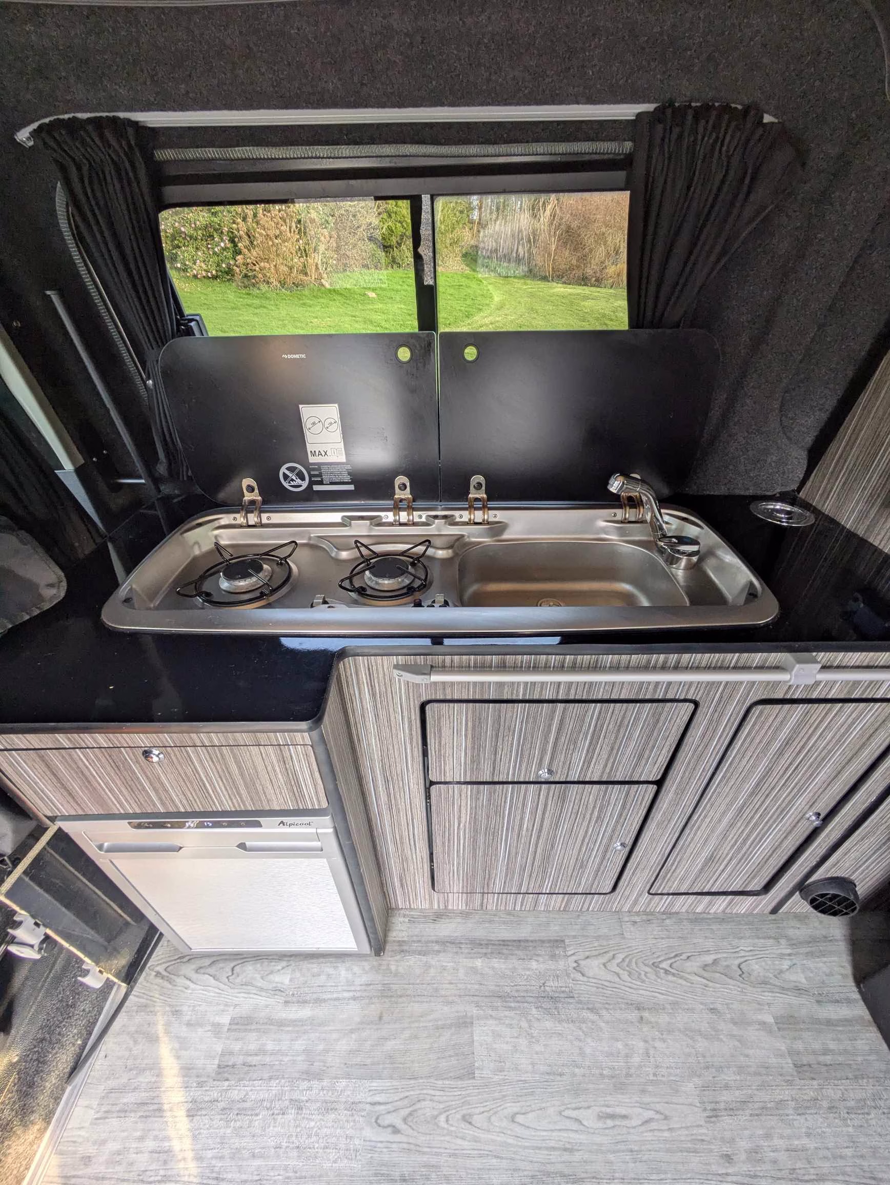 Fully Equipped Kitchen: Alpicool fridge/freezer and Dometic twin-hob/sink combo with 12 volt submersible whale pump with fresh and grey water containers. Currently connected to a 6kg butane gas bottle.