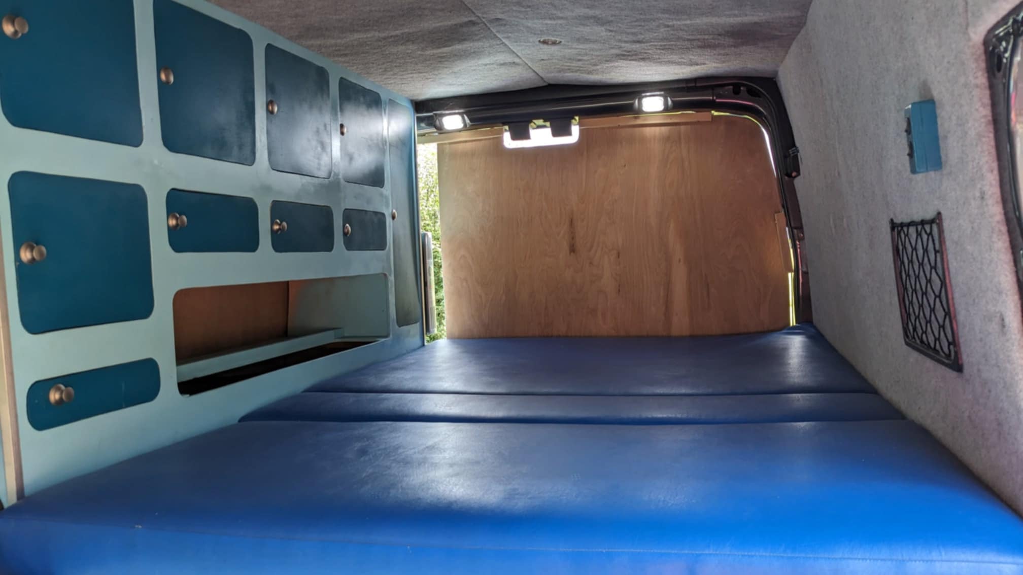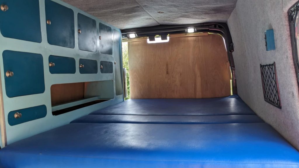 Standard double bed at the rear of the van running lengthwise along the van. Cupboards next to bed making up the rest of the width of the van.