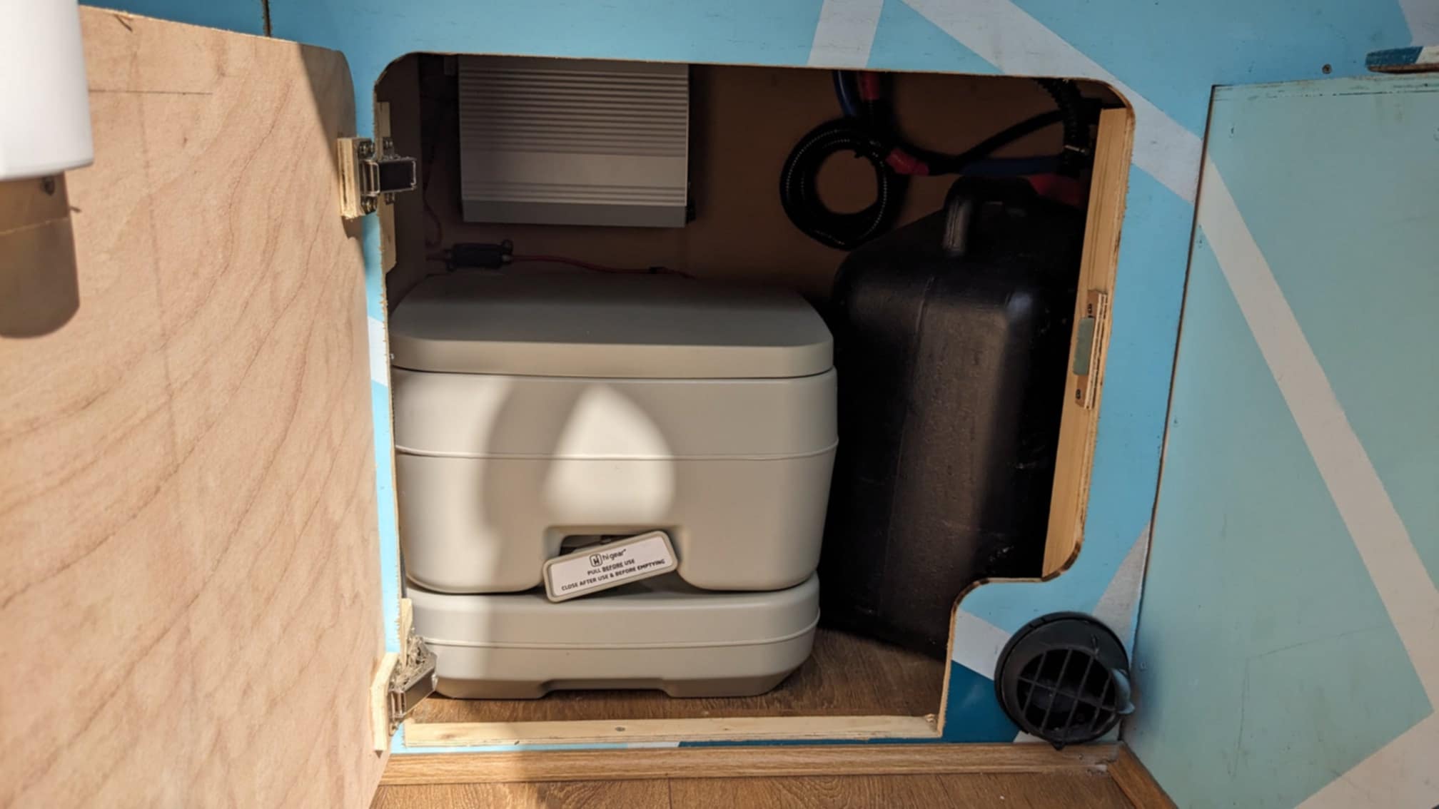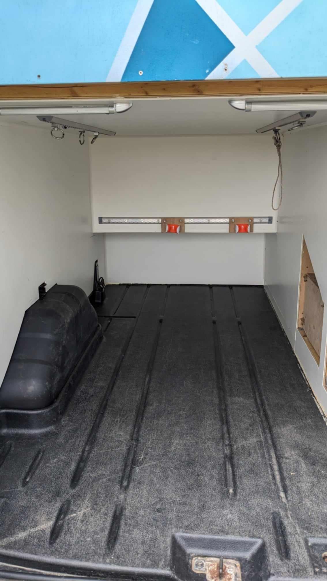 Wet storage cupboard for wetsuits, kites, windsurf sails. Drains to outside of van.