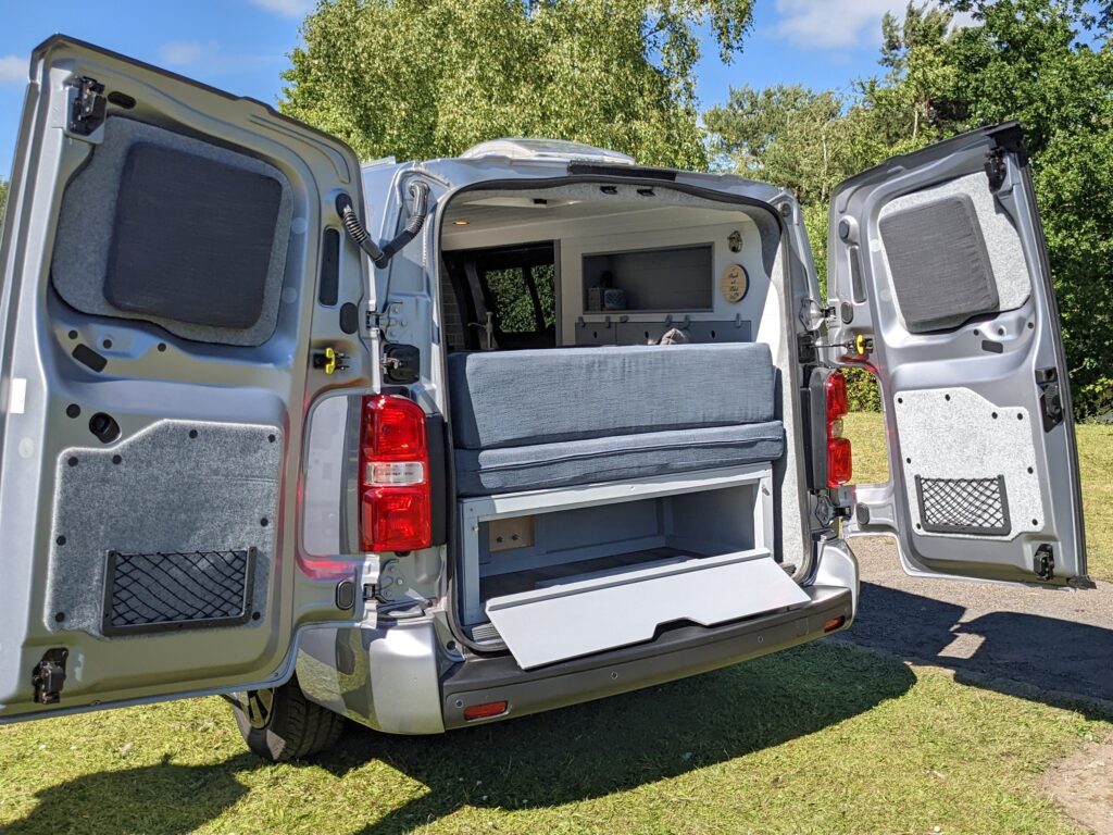 – 1 large storage unit beneath rear seating area (accessible from barn doors, via a drop down door) – a “boot” which easily stores the camping necessaries.