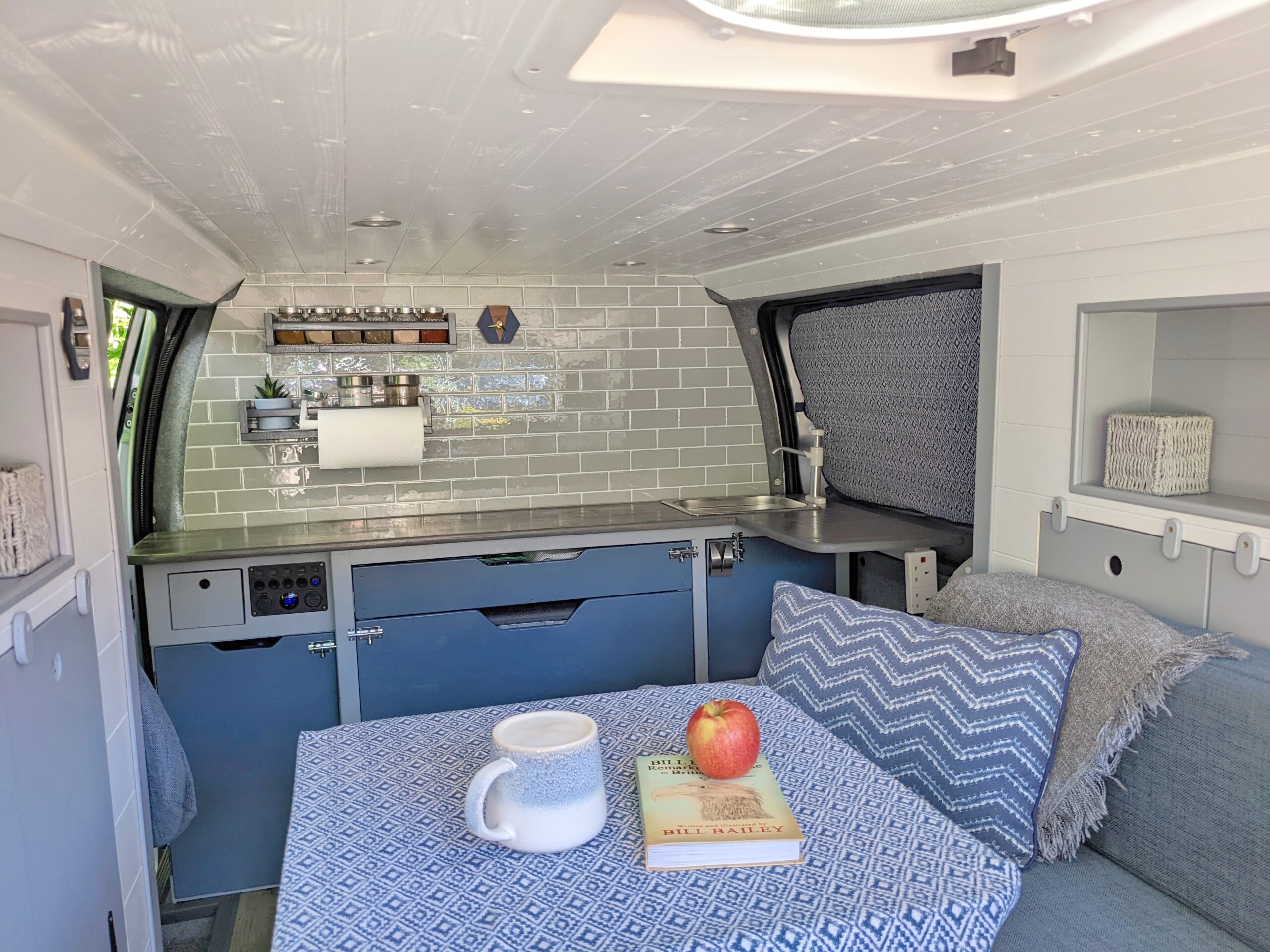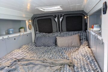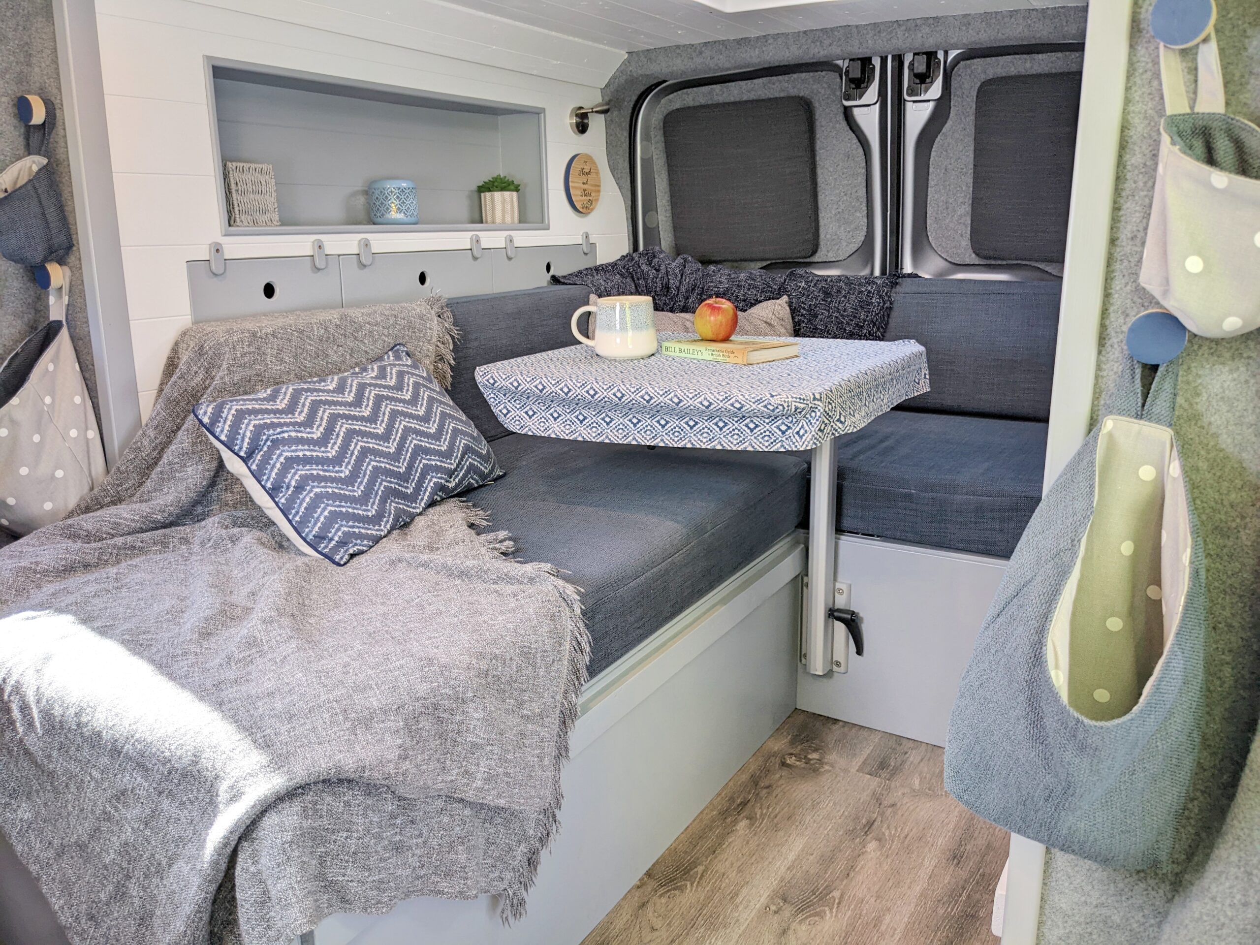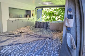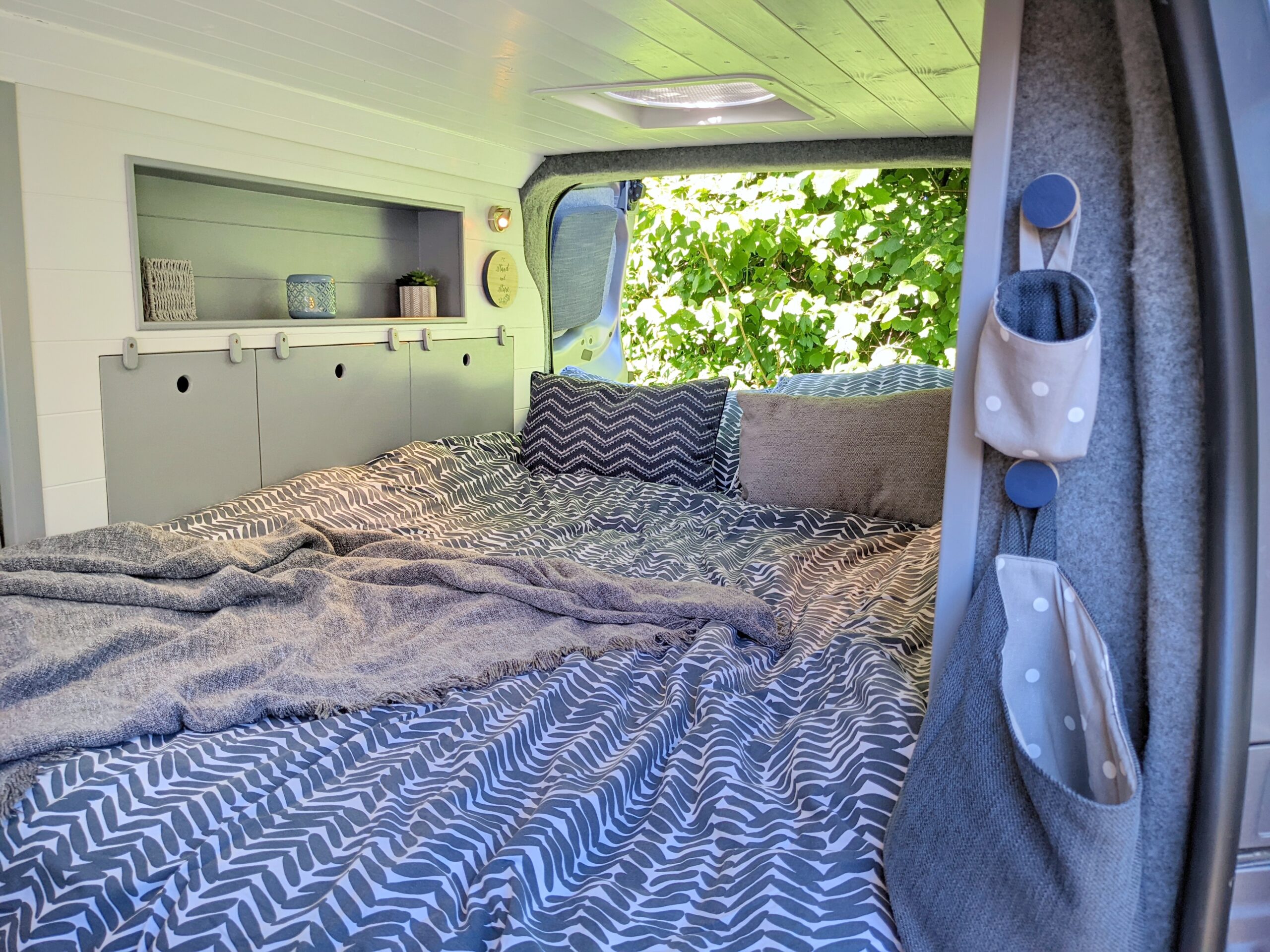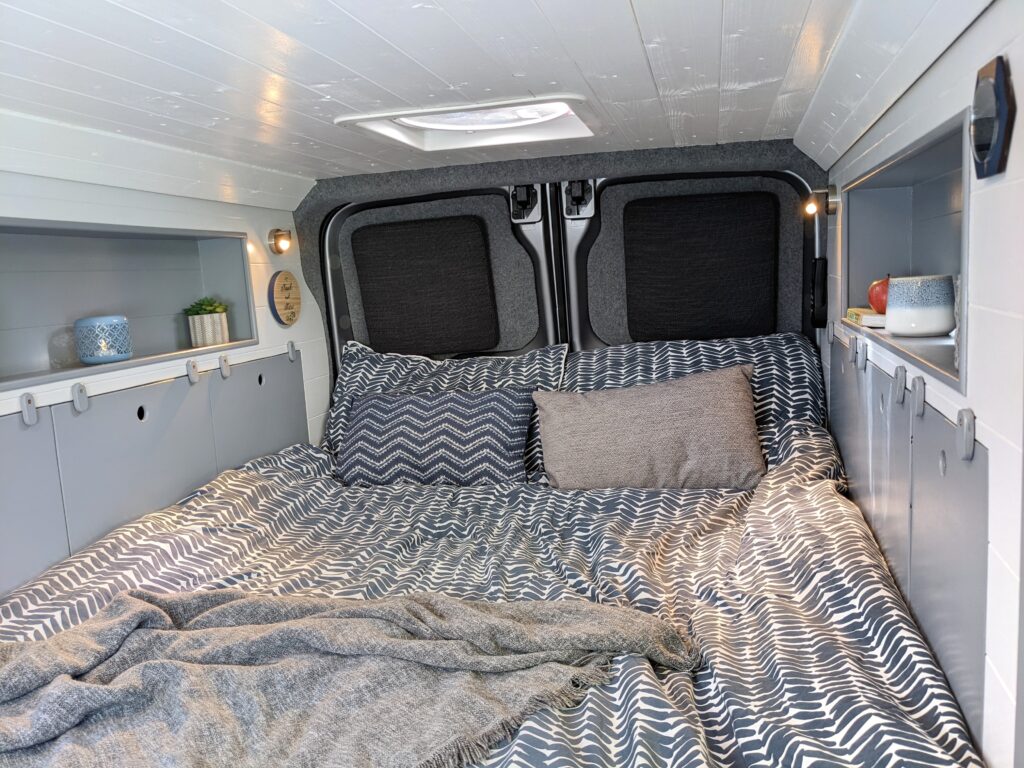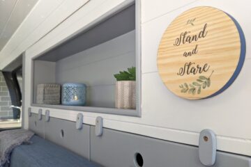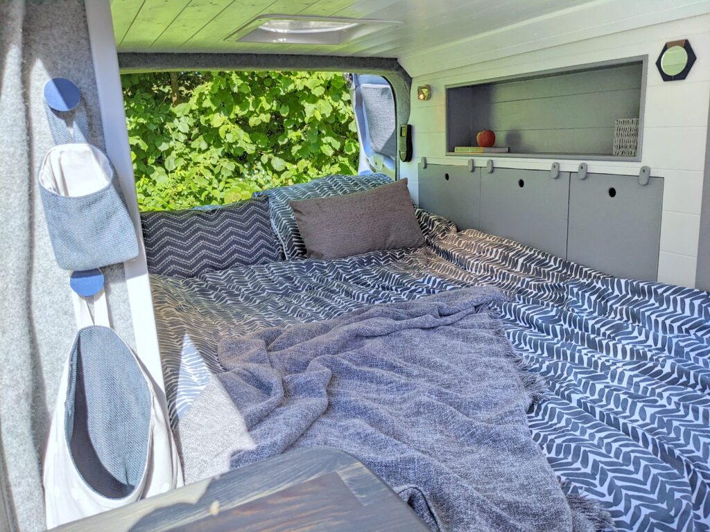 – Long cubby shelf to each side of van, perfect bedside storage for books, cup of coffee or to prop a tablet to watch Netflix with a glass of red!