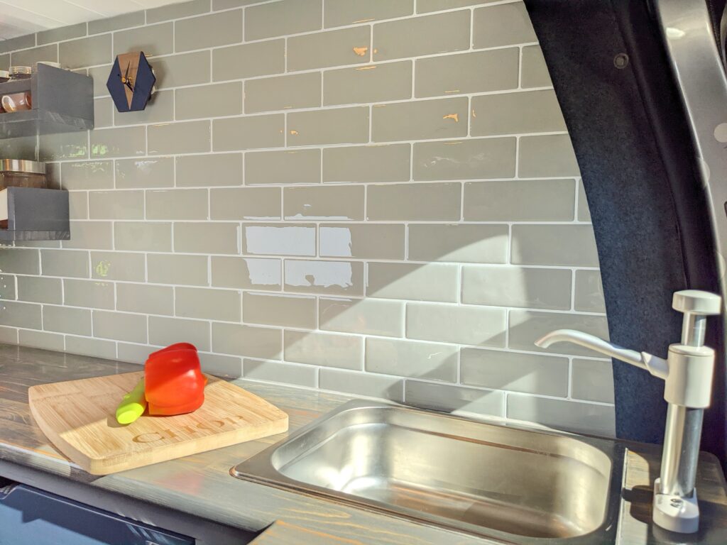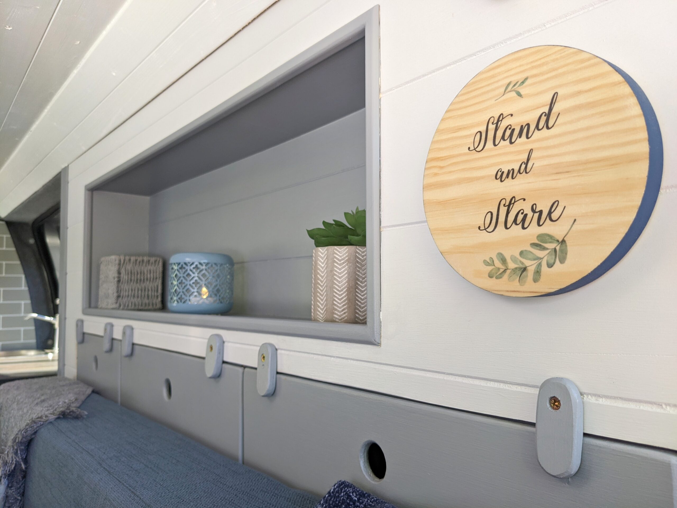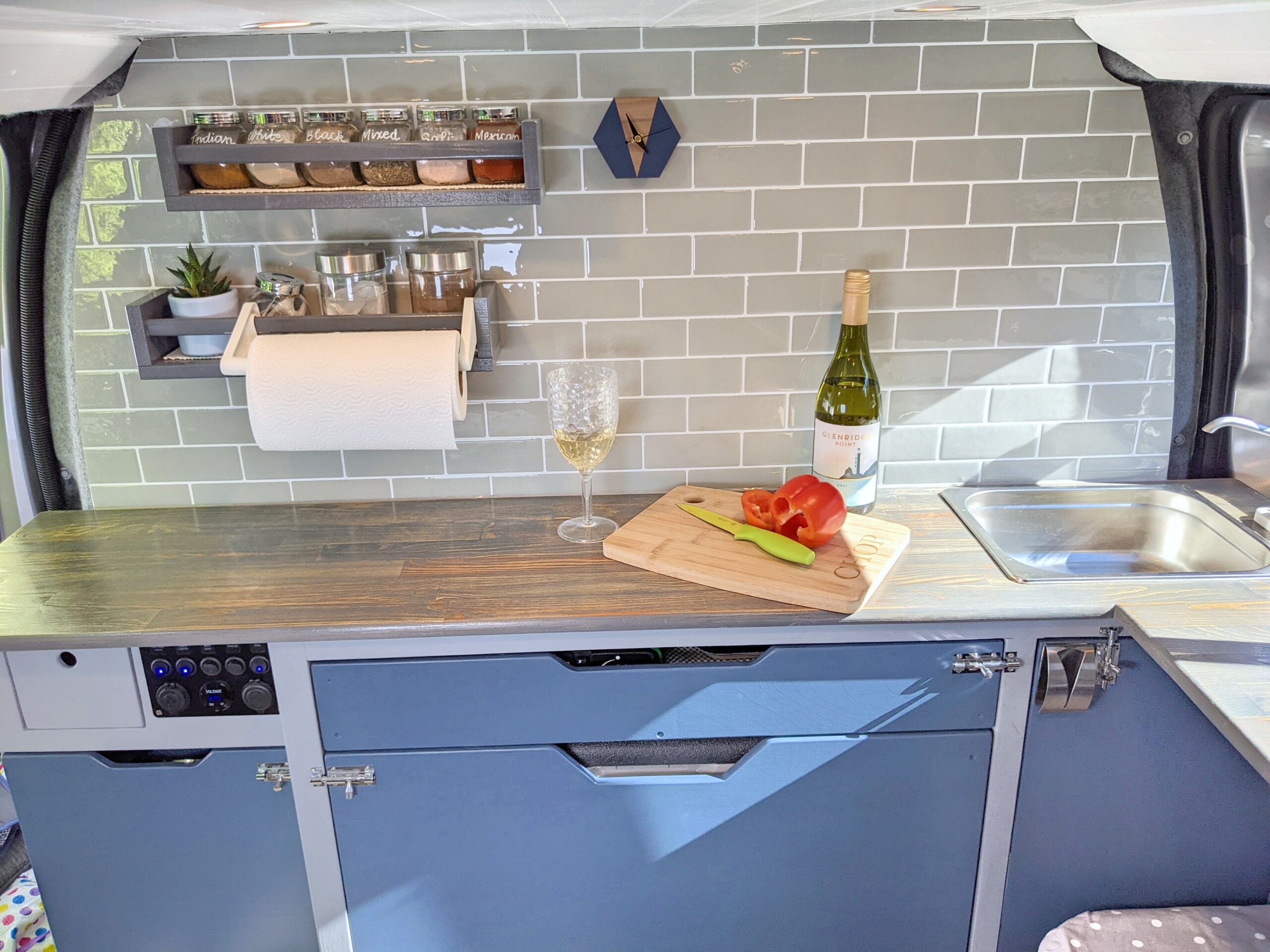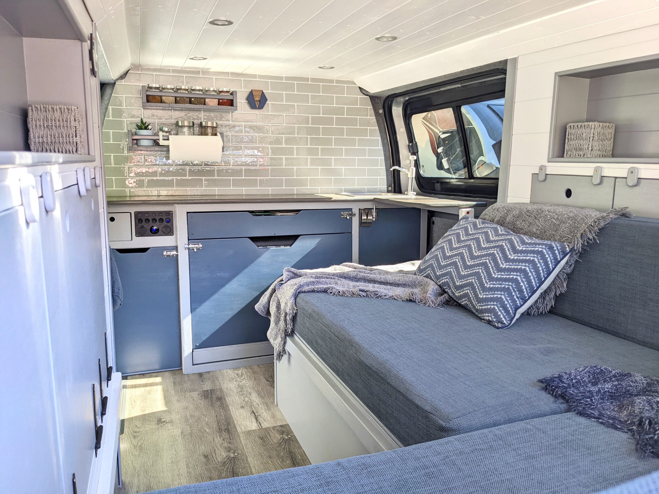 – Long cubby shelf to each side of van, perfect bedside storage for books, cup of coffee or to prop a tablet to watch Netflix with a glass of red!