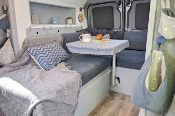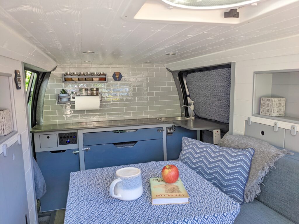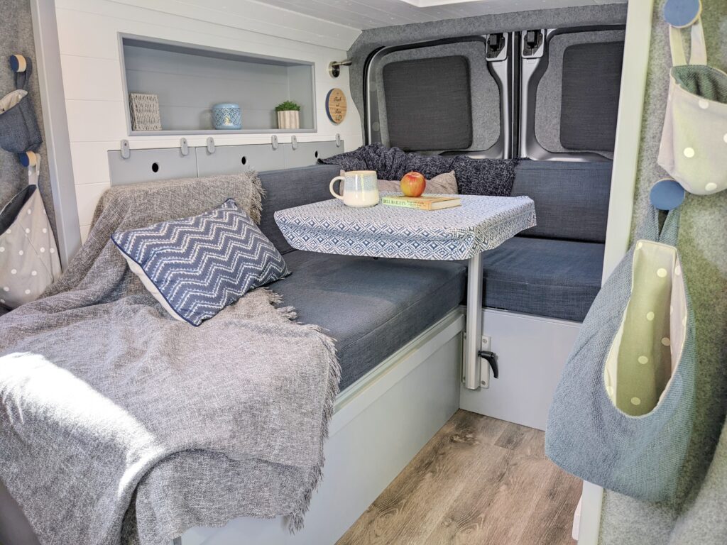 – 1 large storage unit beneath side seating area (accessible from inside van) – easily stores a double duvet, pillows, the table and lots of extras.