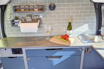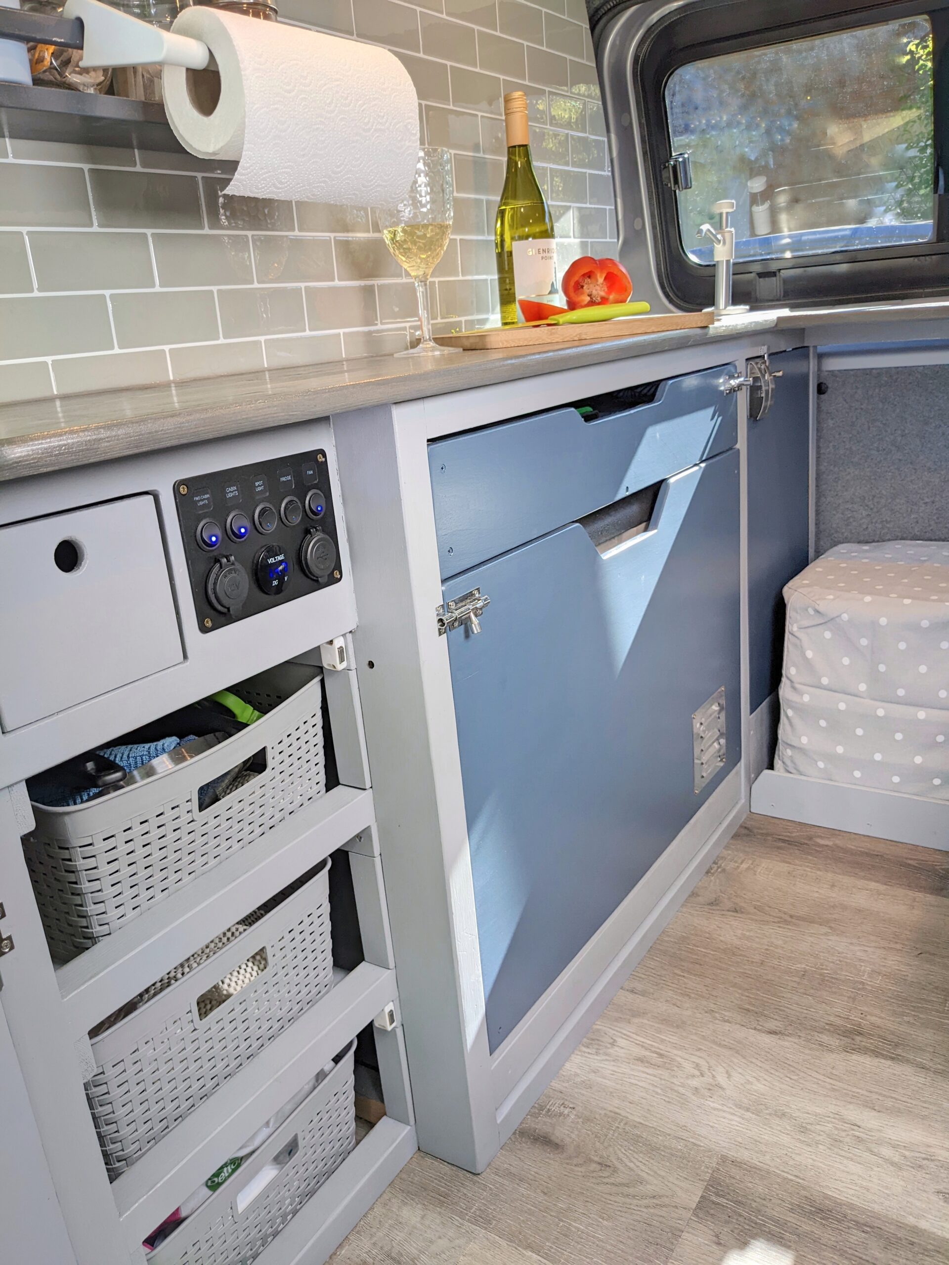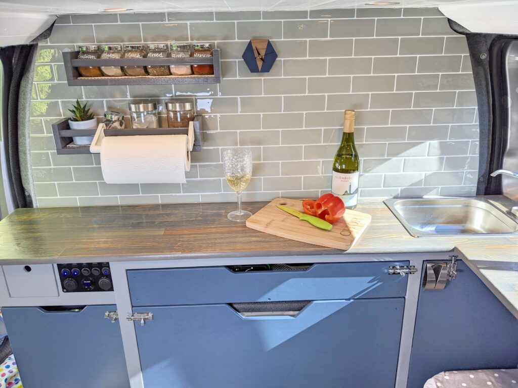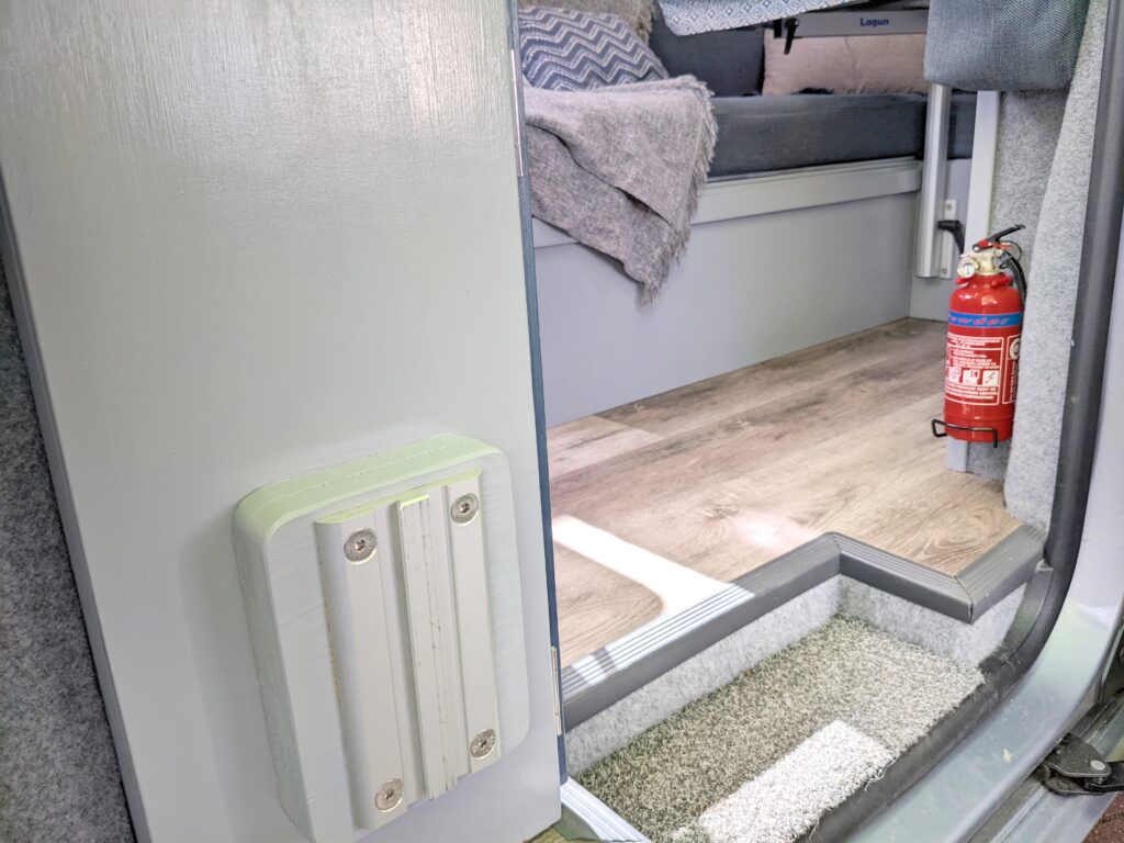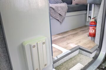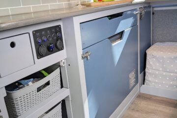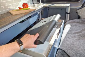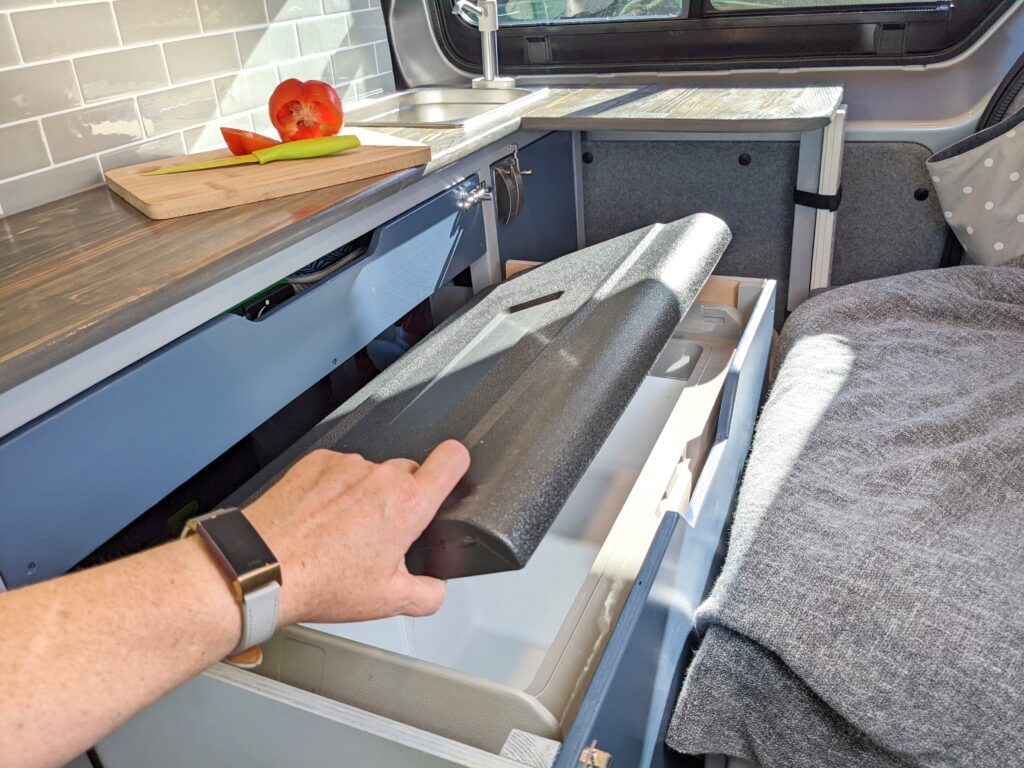 – Wide under-counter drawer with cutlery storage and space to store a single burner cartridge stove (Kept a mobile hob so that it is possible to cook both inside and on a fine day, outside on the Lagun arm mounted table/worktop. Lagun mounting plates are located in both the seated area for use as a table and in the passenger side doorway for use as a cooking platform).