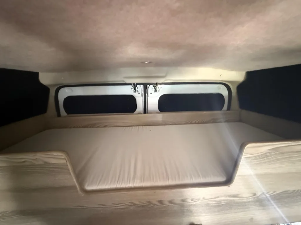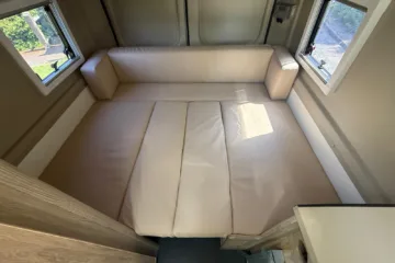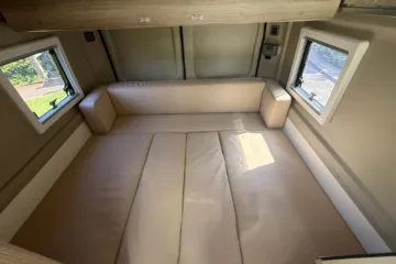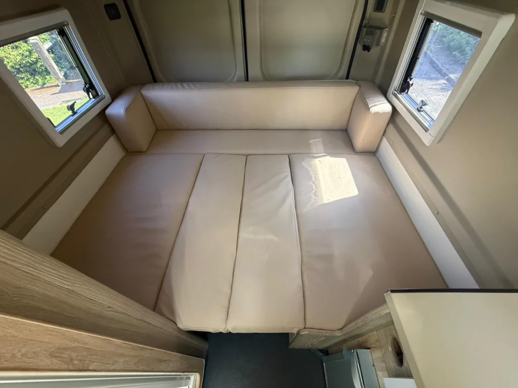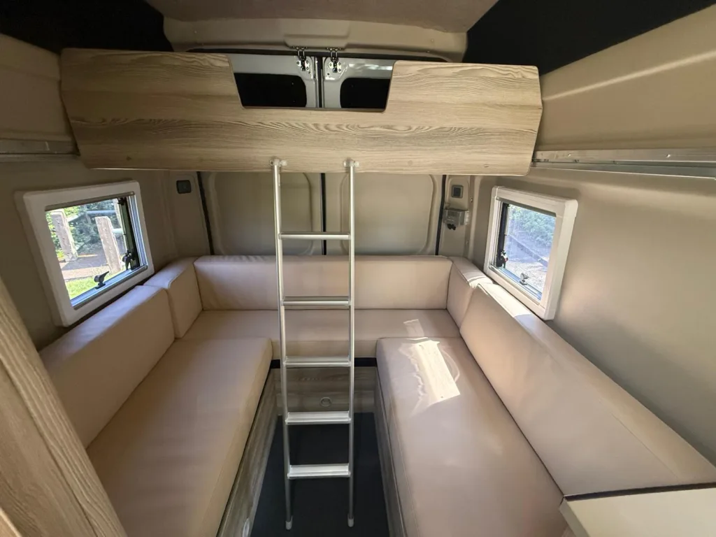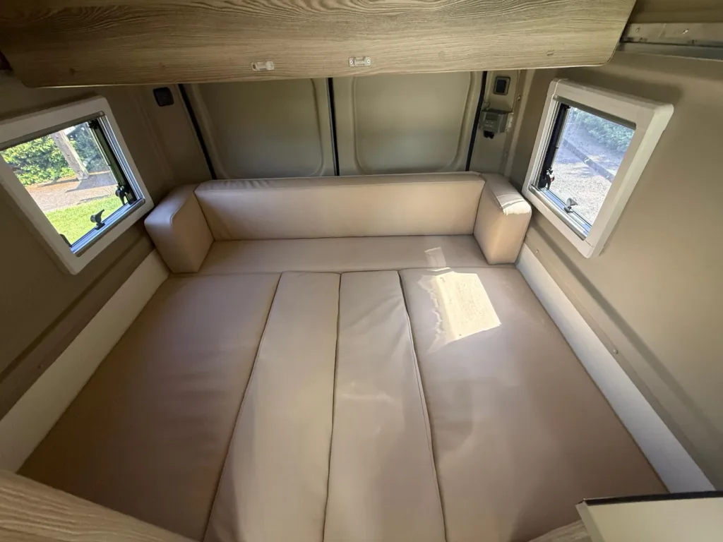 U shape to rear of vehicle which is 5foot length from rear forwards and width of 6foot 2 across rear of van so a good size double bed and it just slides out and cushions drop in which makes bed up, above this at rear there is a little bunk above u shape which is 2foot wide and 1.7meters accross width of van handy for a child or as extra storage so 2/3birth with a little child