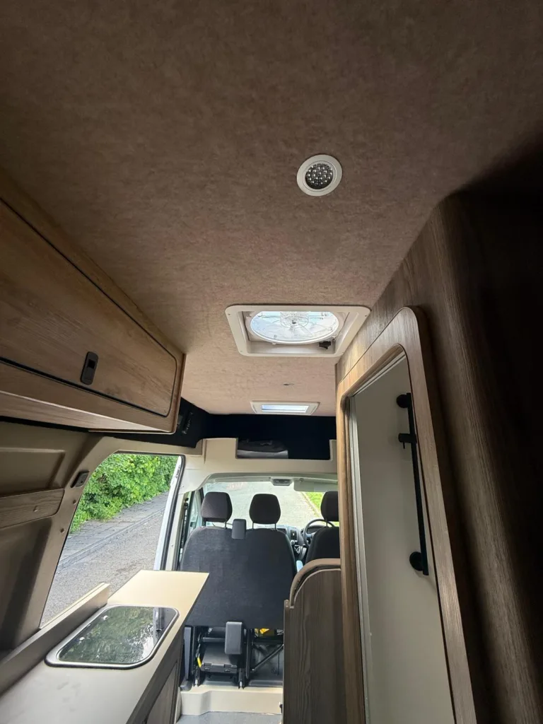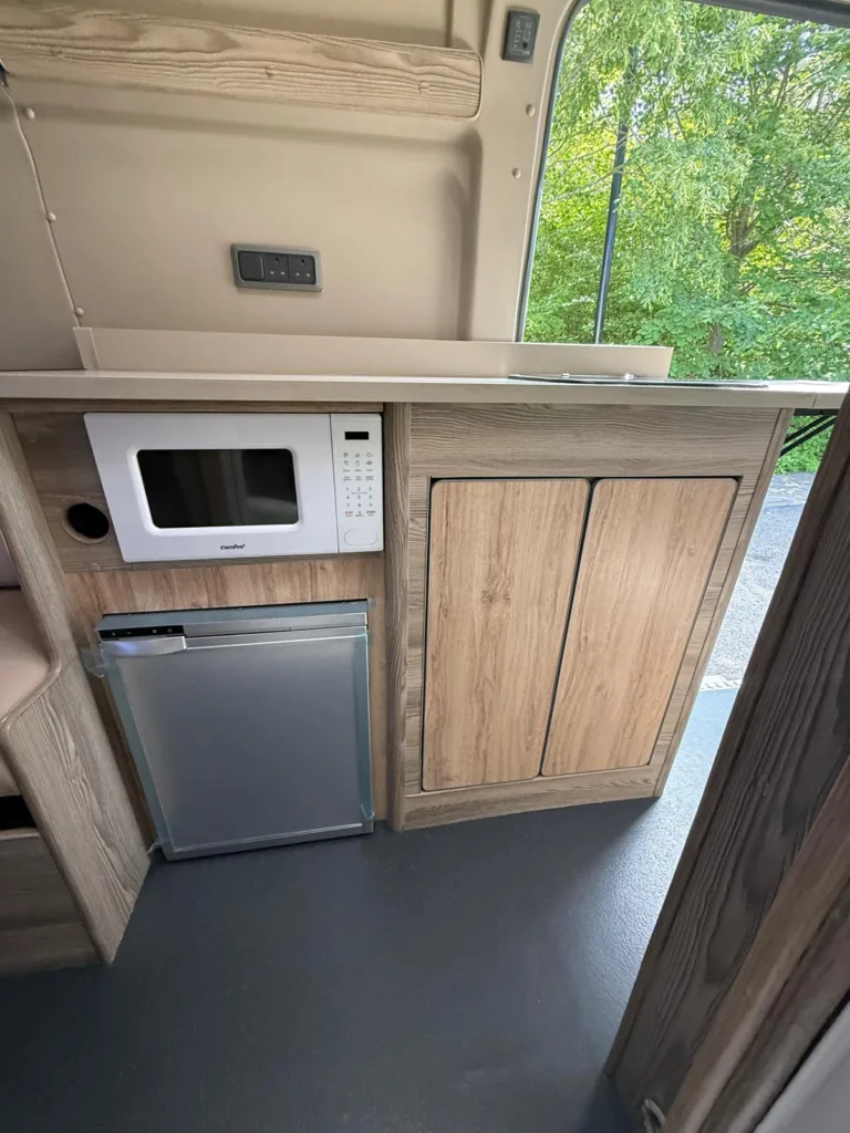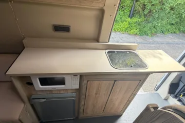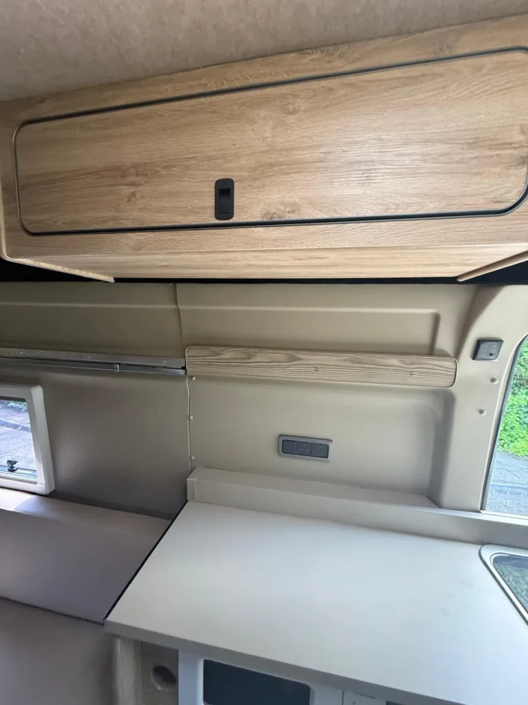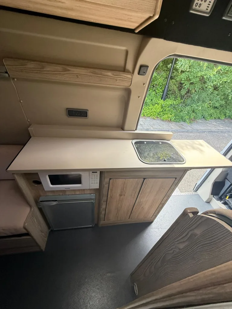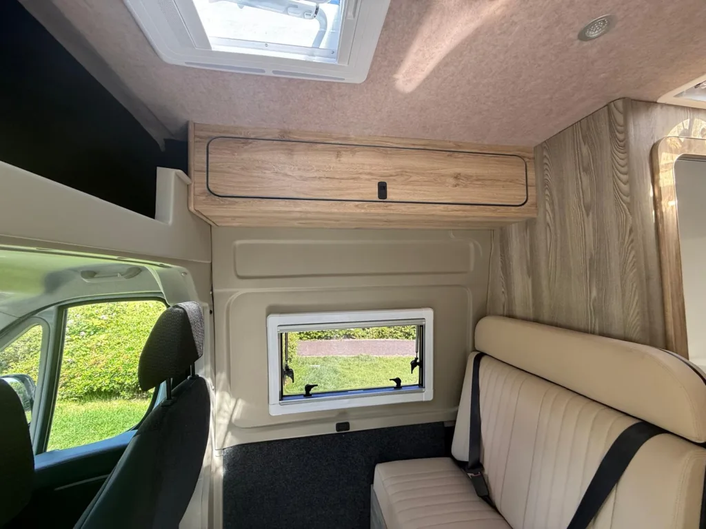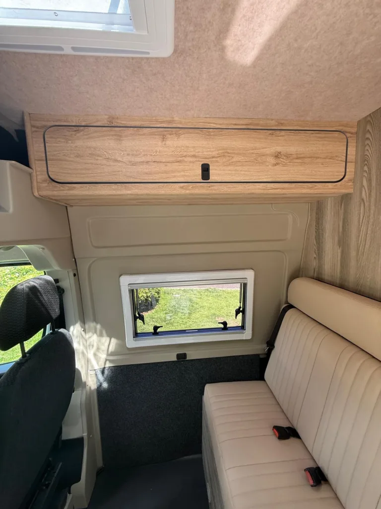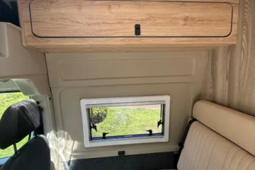 Reverse camera to the rear U shape seating to rear which converts to double bed it has the tinted caravan type windows which all open out over which are double glazed and have child locks on much better than the glass windows! It has a truma d4 boiler which works on diesel on its own or a mix of diesel and 230v or 230v on its own when on a site ,Sargent 12v electrics with charger for when on hook up which will charge leisure batteries! It has 2 agm leisure batteryβs wired in parallel and a 200w solar panel with mttp charge controller! It has a max air fan in the middle of van and a 400x400sky light to front of vehicle! It has a toilet pod with a cassette toilet and sink in and extendable tap if someone wants a shower or use as a wash dry room and rinse things off! Roldoure sliding cassette door , No gas but built in microwave and just use electric appliances when on site or has space if someone wants to add gas! Or an inverter so they donβt need hook up! It has the drip rail light above sliding door which prevents water dripping in to van and is a bright light on the outside, has 12v and 230v sockets it has on board waste and fresh water tanks fitted to underneath of vehicle which makes life more easy instead of jumping extra water barrels about all material is faux leather cram used which is incredibly durable and has the med density foam which is perfect , the sides of u shape lift up also and have storage underneath them and to the front of vehicle above cab there is plenty storage up there to with it being the high top ! It has built in blinds internally and I have the exterior front cab blind as it helps massively and prevents condensation any more info get in touch please ask incase I have missed something!