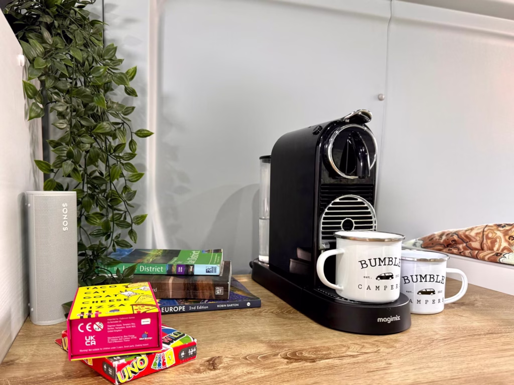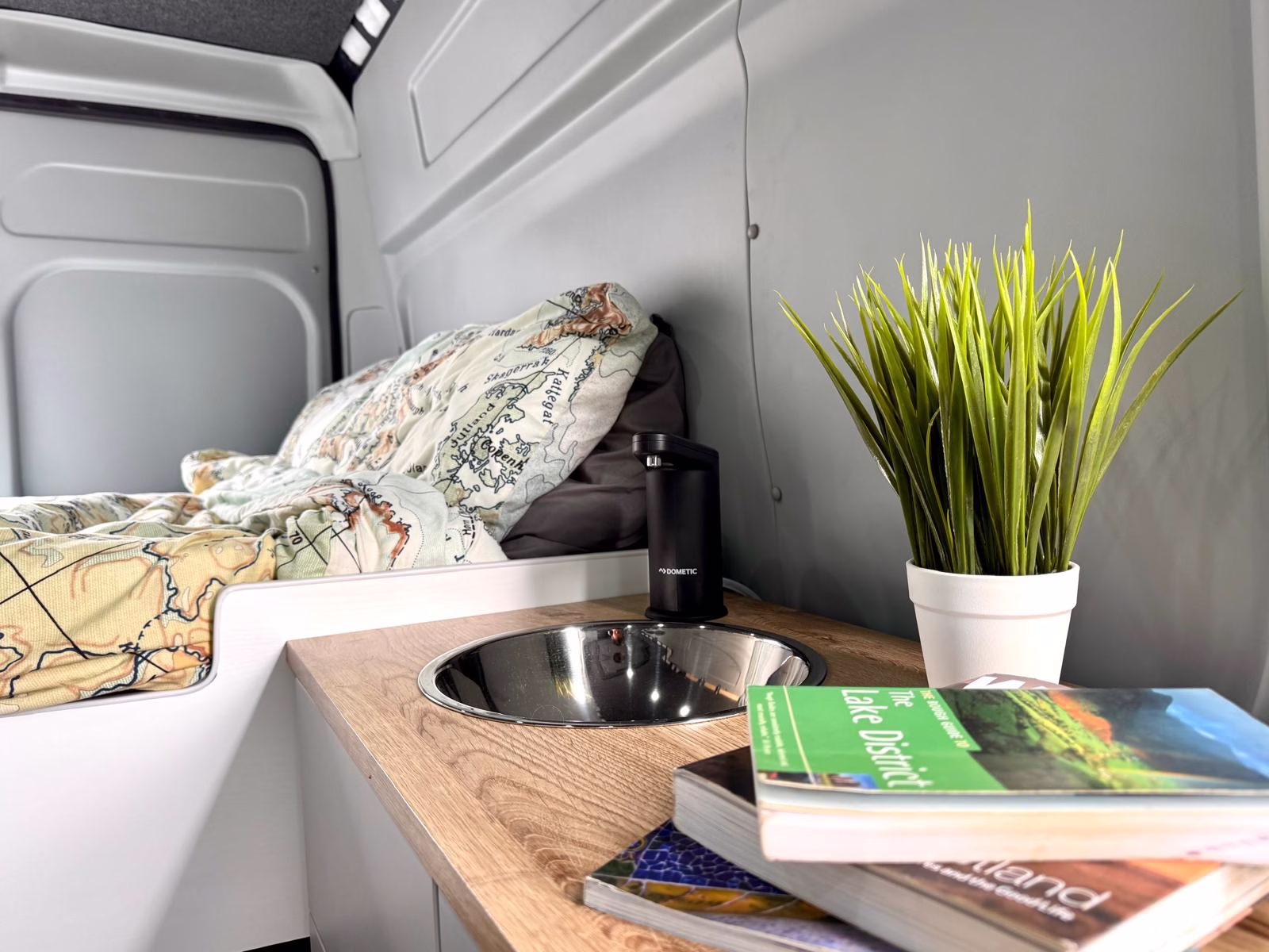 As per the usual Bumble simplistic-ness, we don’t add hot water, fixed gas or shower facilities, and favour storage more! There will be a removable loo, cold water tap, sink and waste, a 26l compressor fridge, a Cadac dual burner stove, a coffee pod machine & an Anker power solution, along with 240v hookup and a diesel heater too. Van wise, two side windows are fitted as standard, with rears added as an option