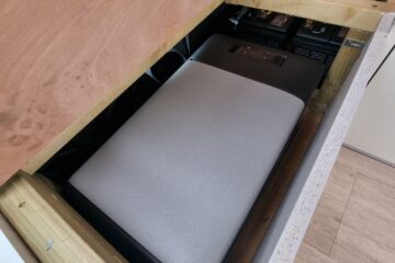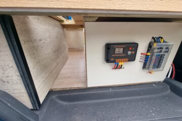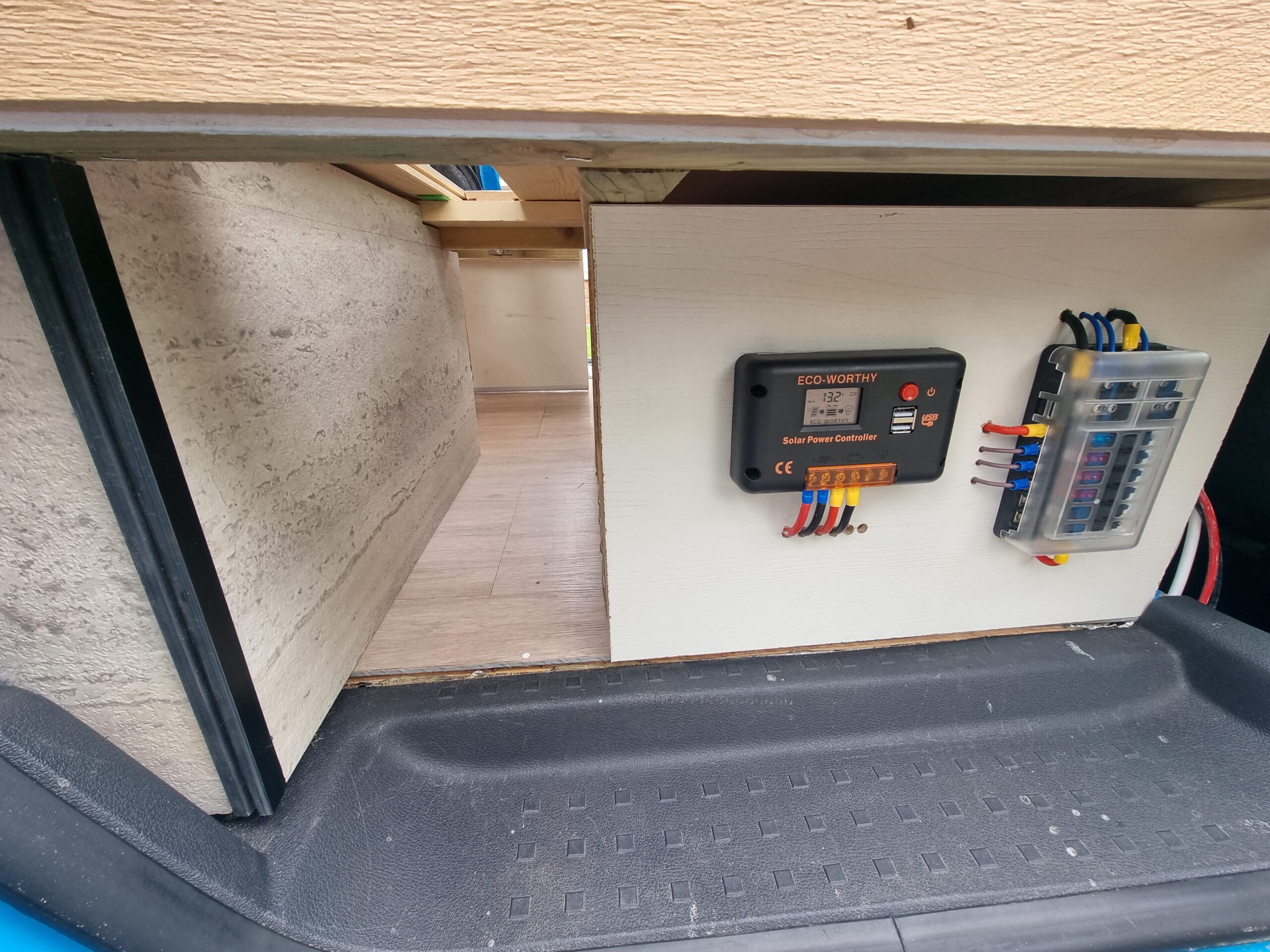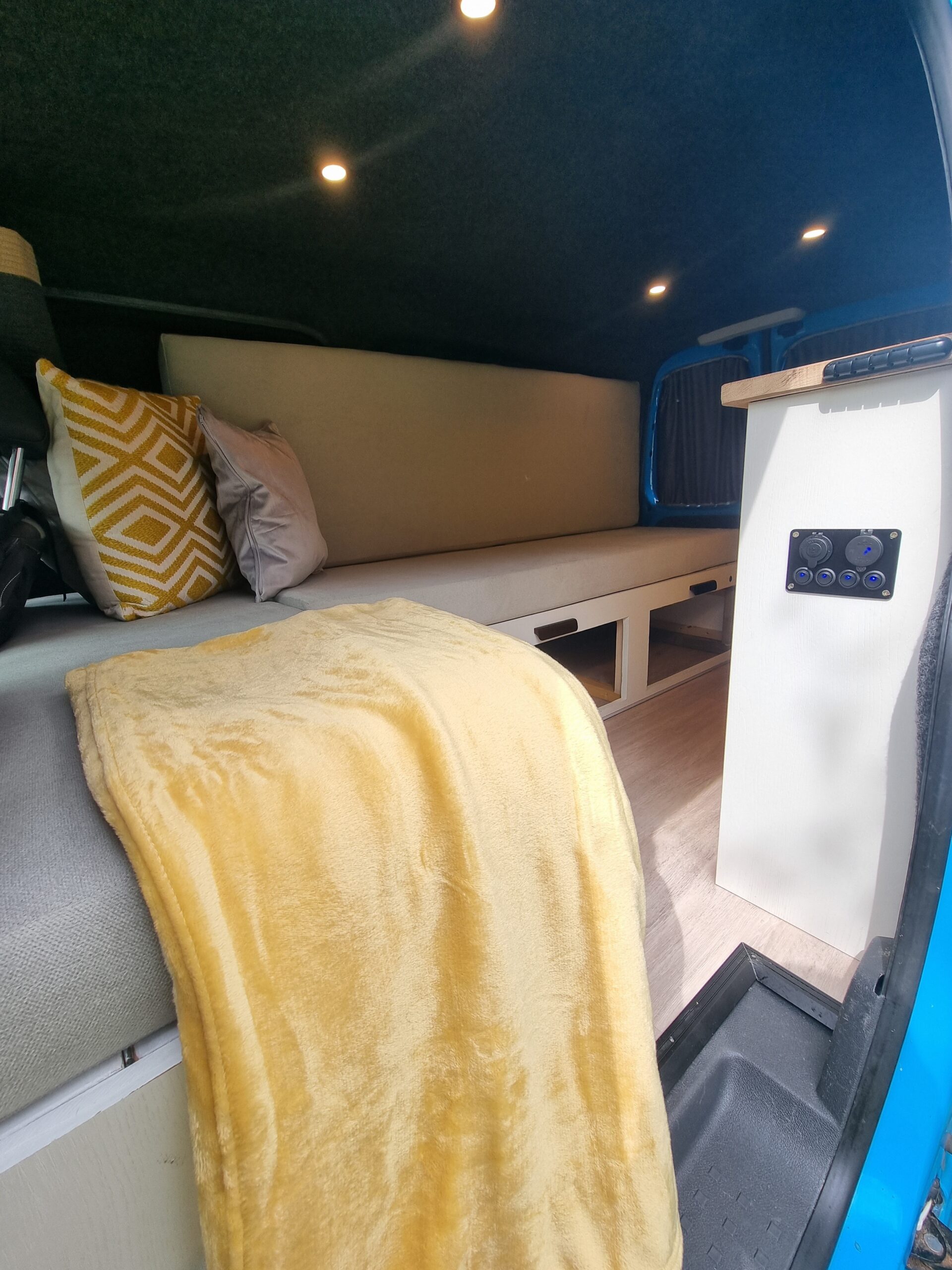 Installed solar panel onto the roof of the van to power, does not have 240v hook up as we didn’t feel it was necessary for a micro camper