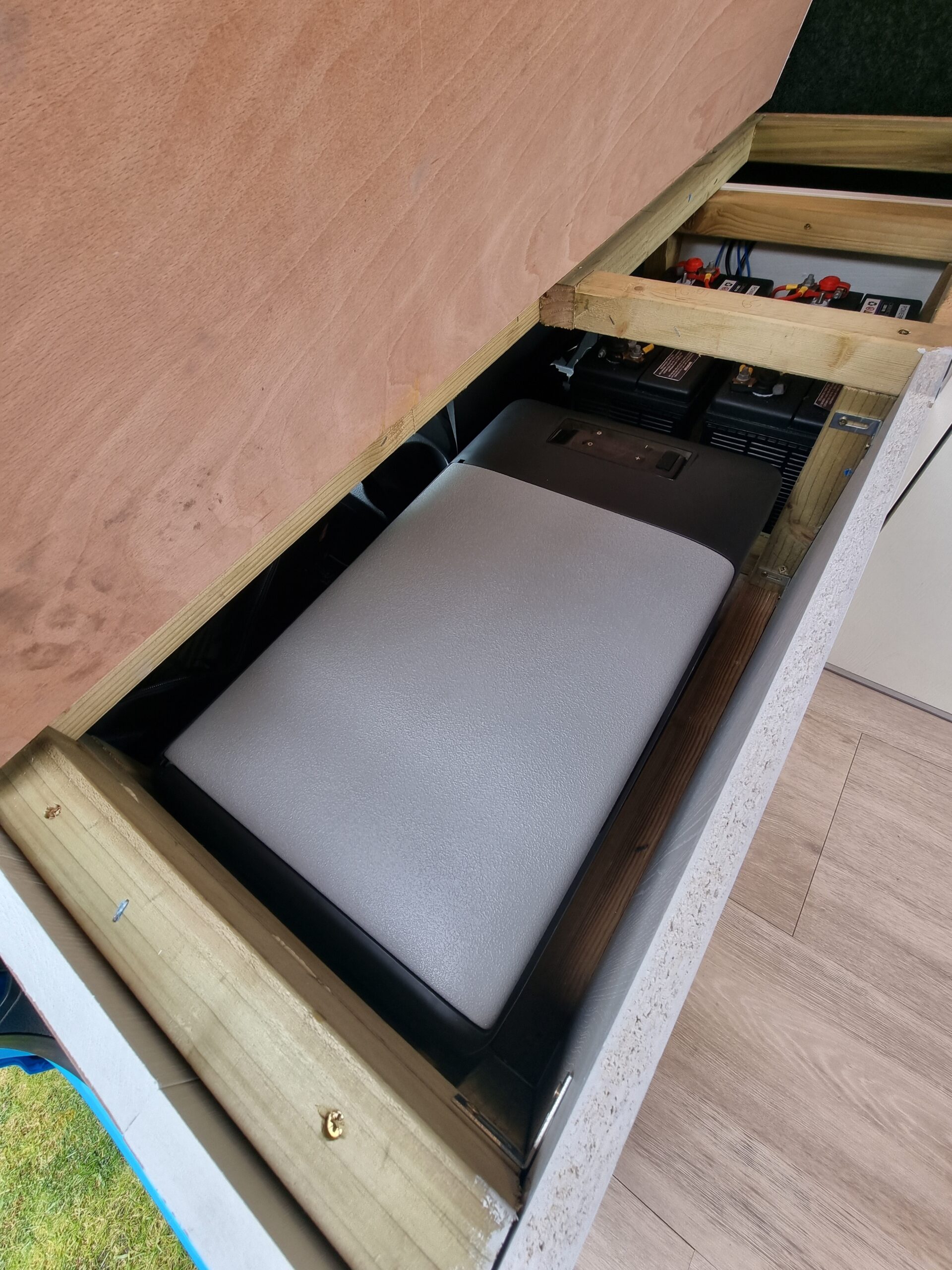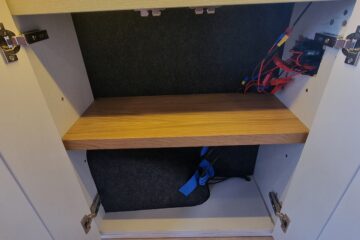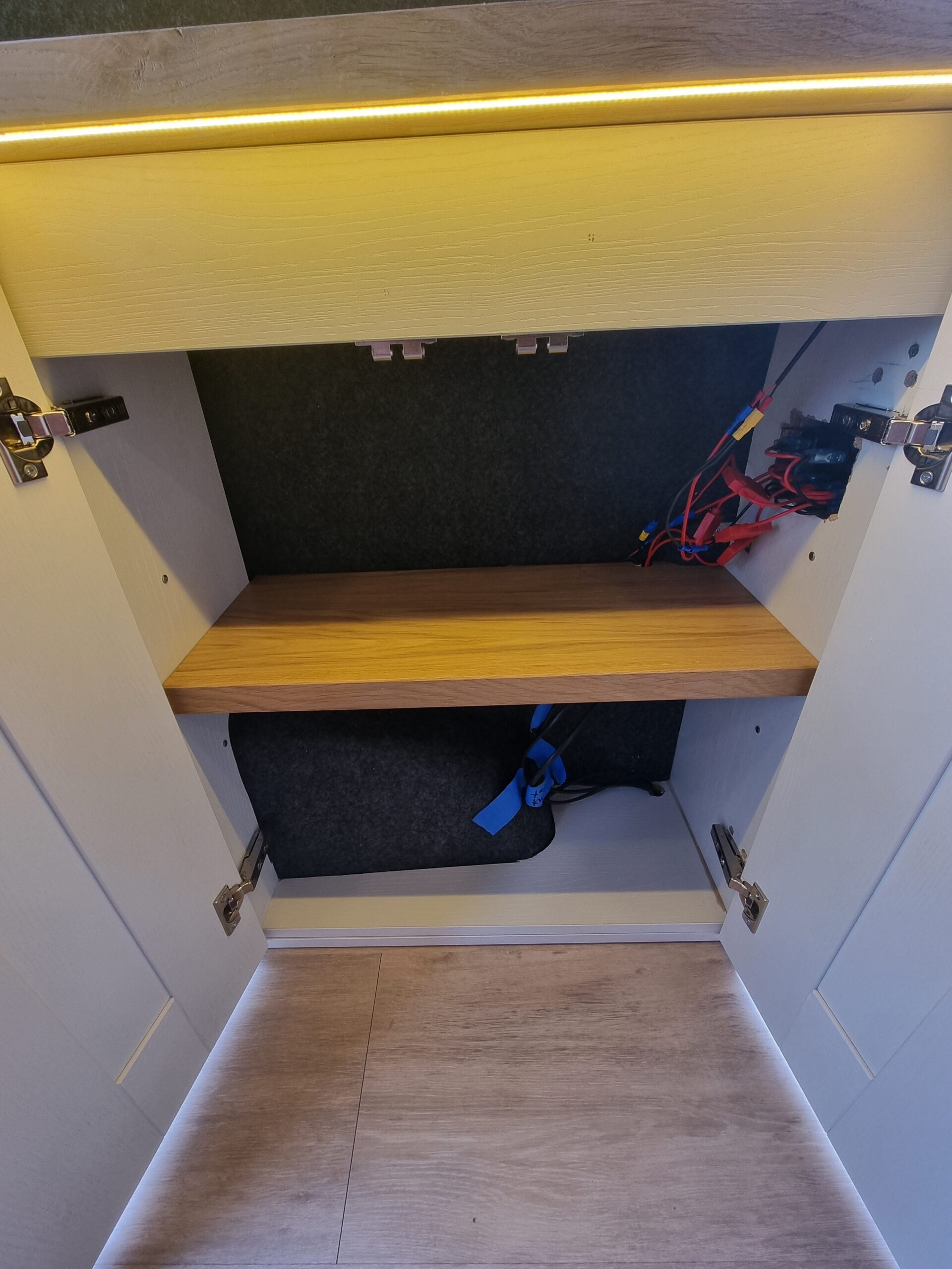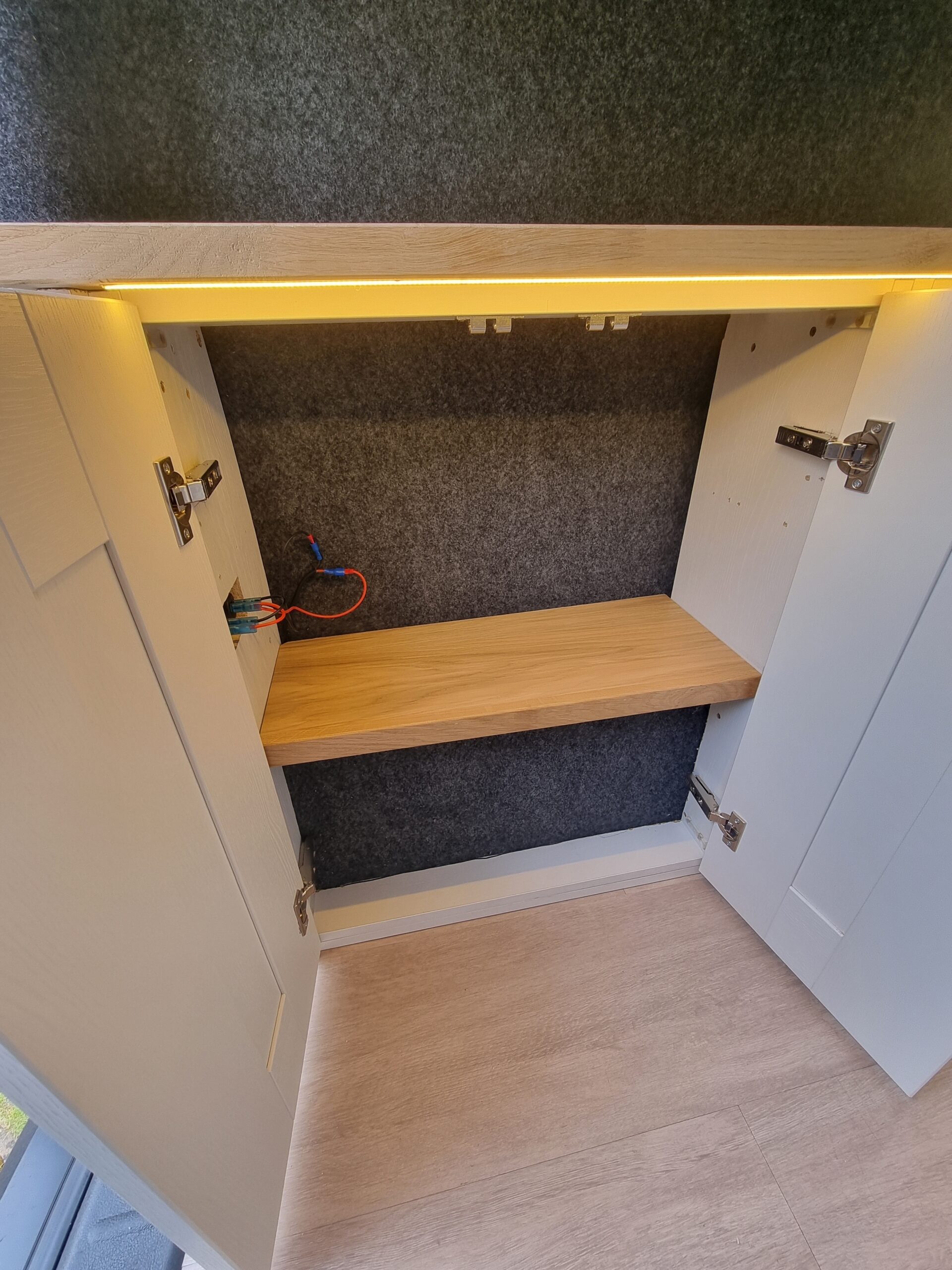 Installed 12v cables to supply the electrics in the structure of the van which power the following. 4 spotlights in ceiling, LED strip light under cabinets and in bulkhead above front seats