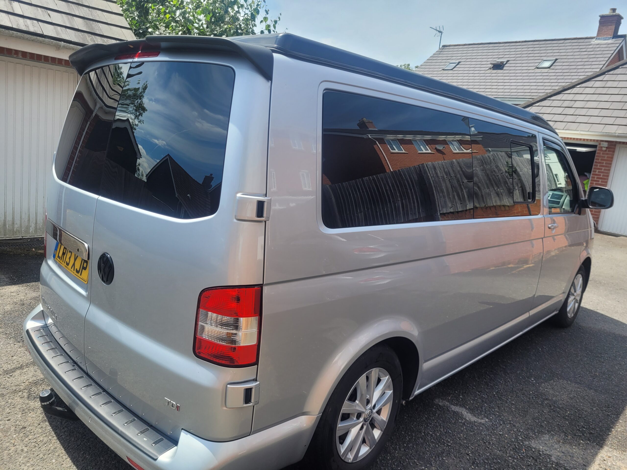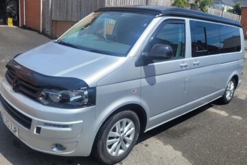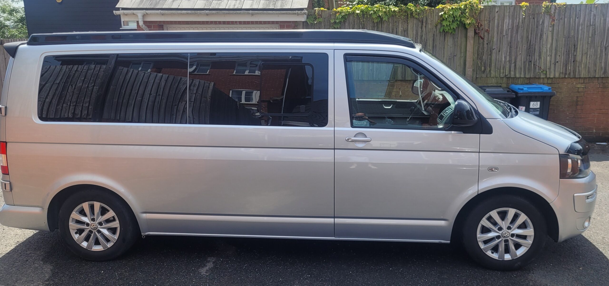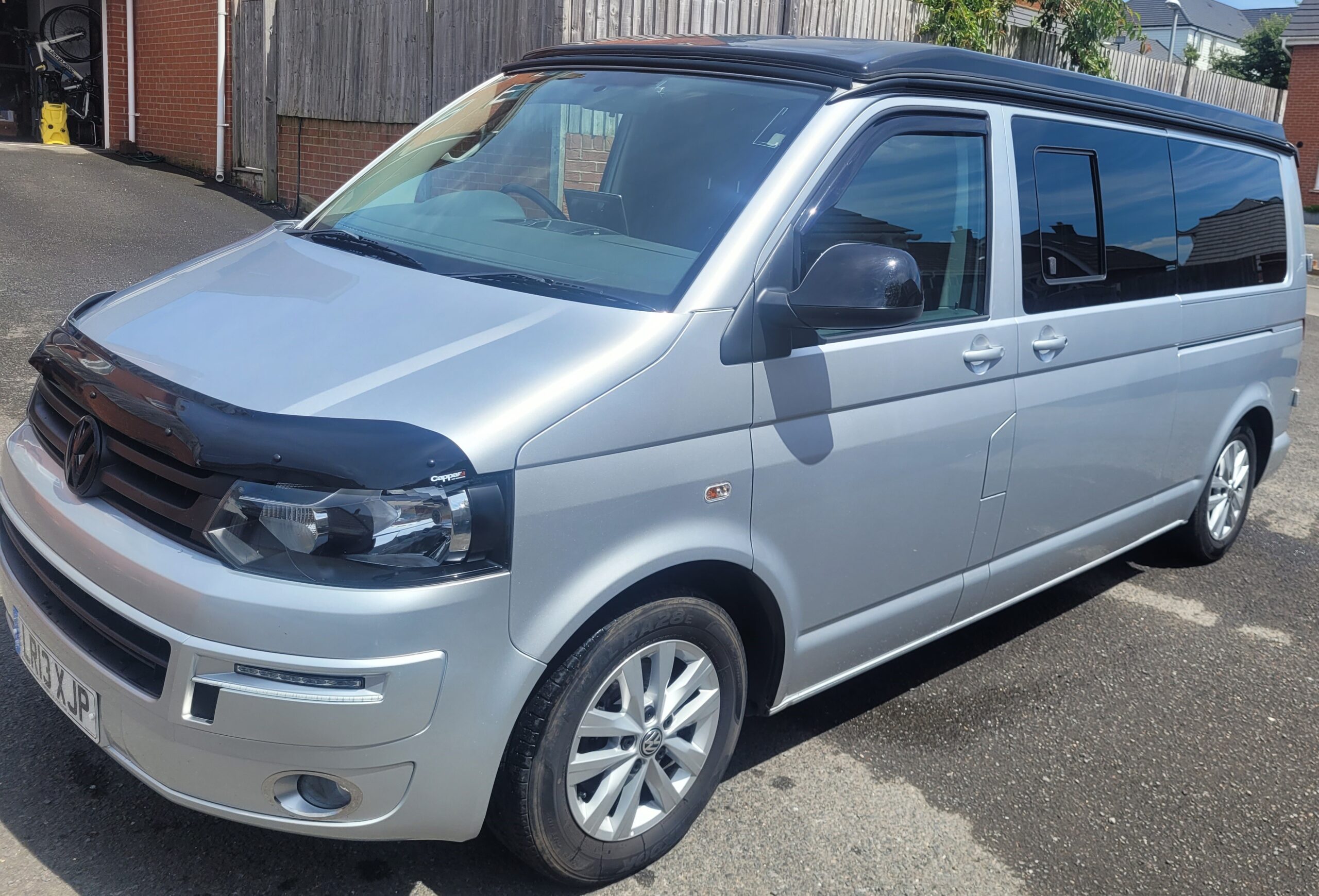 VW T5.1 Campervan, T30 Highline 140 TDI Long Wheelbase Registered 13.04.2013. Air Conditioning, day running lights, electric windows, central locking, upgraded headlights and much more – see below for full spec. Low mileage at 66,000 miles, Full Service History, platinum silver, grey interior, excellent condition inside and out. Full Campervan conversion undertaken in 2020 when I bought the vehicle. New OEM Alloy wheels and tyres fitted in 2020, New Water Pump, Cam Belt and Alternator fitted 2023, 3,000 miles ago. It is an excellent van and has been cherished, large history file, it is a great drive, powerful and smooth, the Long Wheel base means you have enough room at the back for luggage. I am only selling because my family has grown and I am now purchasing a caravan – I will miss it! It’s fully serviced, MOT’d and ready for it’s next adventure. Extended van spec: Alpine Halo 9 inch Multimedia system with full satnav and rear reversing camera, Pioneer rear speakers, Wifi router, Victron 180 w Solar panel with MPPT controller, Leisure Battery and split charge system with cable hook up – you can go off grid for days with the solar set up. Thinkware dashcam, Reimo multi rail fitted, 4 birth large Inflatable Kampa Driveaway Awning and attachment kit- less than 2 years old, Westfalia detachable tow bar and electrics Bilstein Komfort coilovers fitted all round and lowered. Camper conversion spec: Waeco coolmatic Dometic Crx Fridge, Dometic Sink and 2 burner hob, foldable table, Austops full length ‘pop top’ with double mattress Hammond Full width Rock and Roll bed. Swivel captain seat. Next MOT due 12/10/2024, Full service history, Silver, 3 owners, £29,900, No VAT. Happy to email/post additional photos/video. This is a really lovely van sad to see it go..