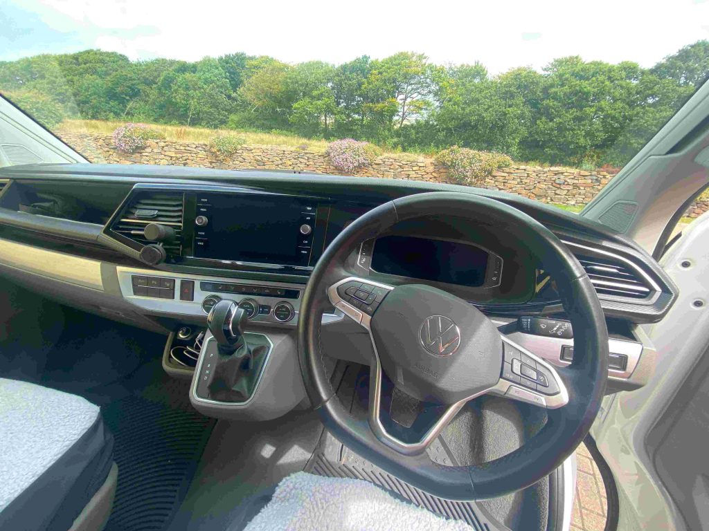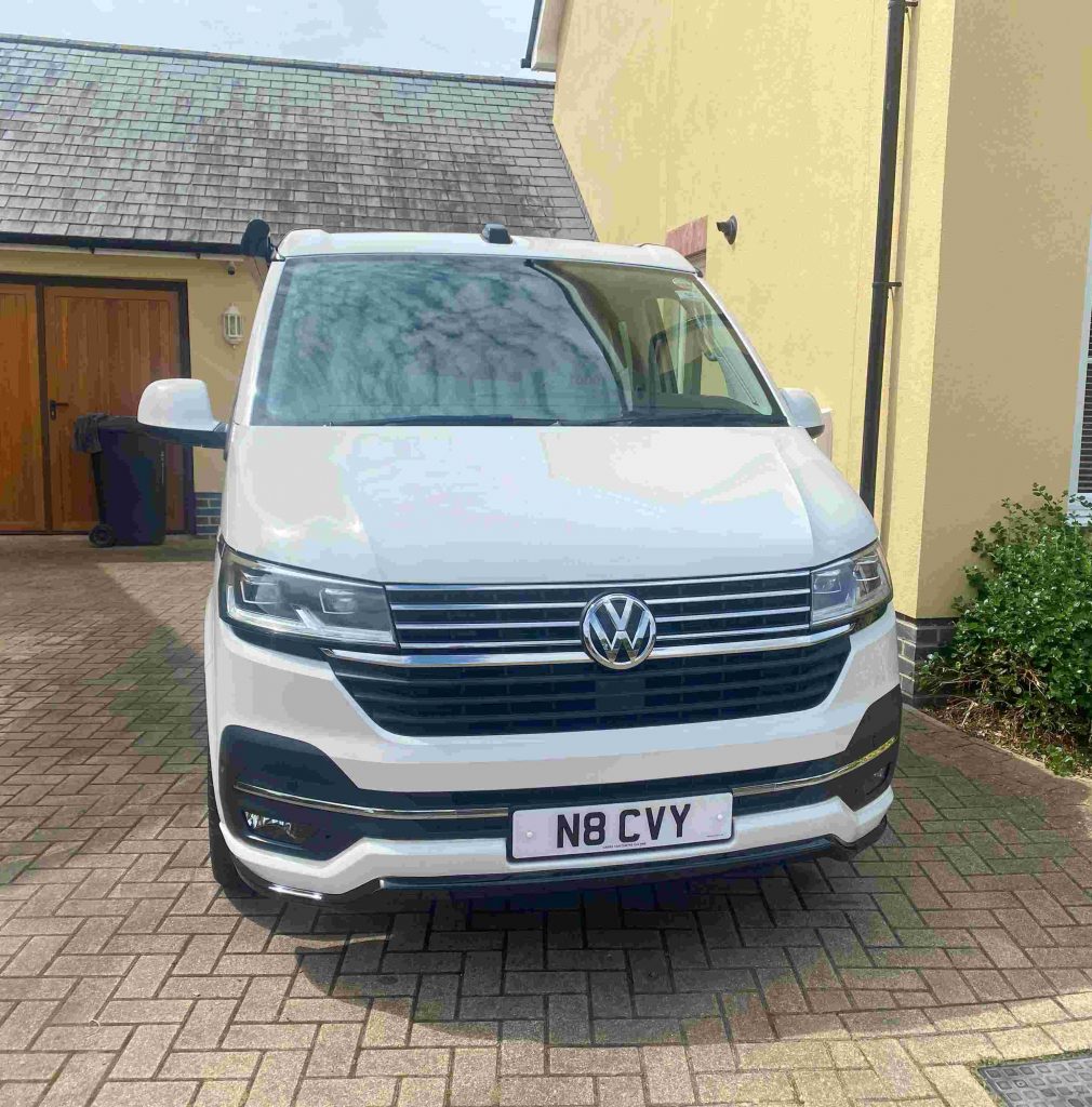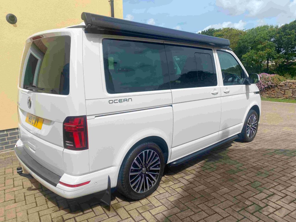 Immaculate Volkswagen California Ocean T6.1 (Nov. 2022) – 2.0 TDI Diesel DSG Automatic (11,800 low mileage) – Candy White With a high specification this VW Cali. Ocean has had one owner and is in outstanding condition throughout, it has been looked after with care and pride. A lovely vehicle which represents excellent value for money and a huge saving versus a new list price with the same spec. Pet free and smoke free. Hob and sink rarely used. In addition to the already impressive standard Ocean specification this vehicle comes with a comprehensive list of VW extras:- Two sets of keys, cupboards in graphite grey, ArtVelour seats-front seats have always had seat covers on, floor covering in stylish wood look, alloy wheels – 18” Palmerston, external shower, acoustic package with heated windscreen, mudflaps, front mud mats-carpet never used, rear bumper and door sill protectors, side bars in black, wind out awning, front spoiler, heated driver and front passenger seats, Scorpion tracker, Detachable Westfalia tow bar, VW Roof Rack, 1 service plan agreement remaining.