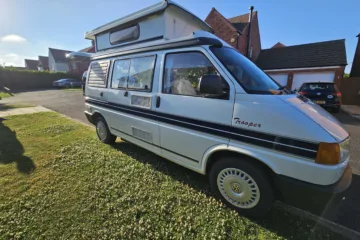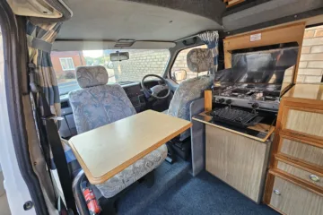 It has a Fridge – Leisure battery- 240v electrics-Hob and Grill – Pull out bed – Swivel front passenger seat ,Elevating roof- A Junior bed is in the pop top .Fiamma side awning and Fiamma tailgate Bike rack .It has a MOT till 22nd April 2026