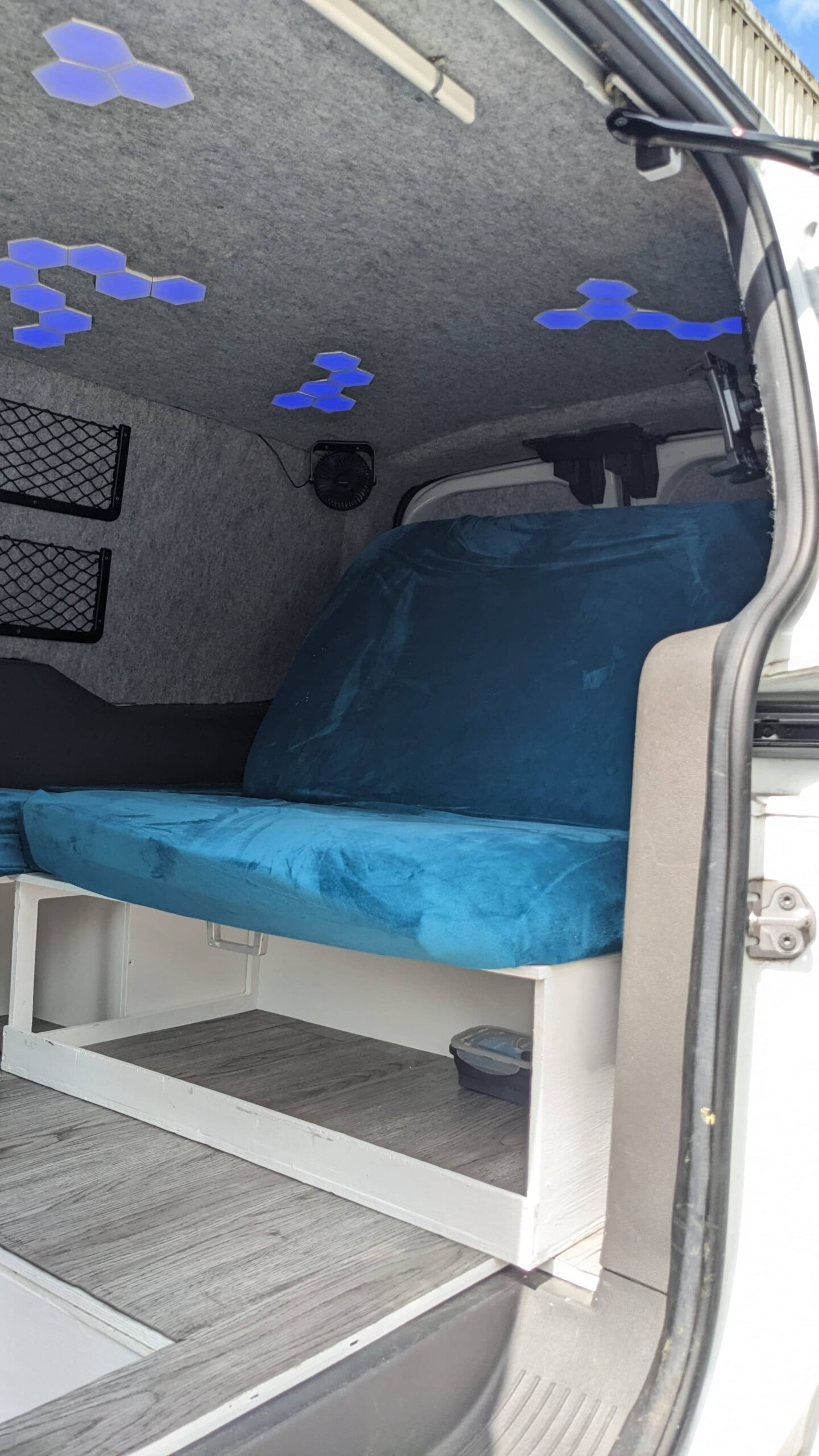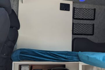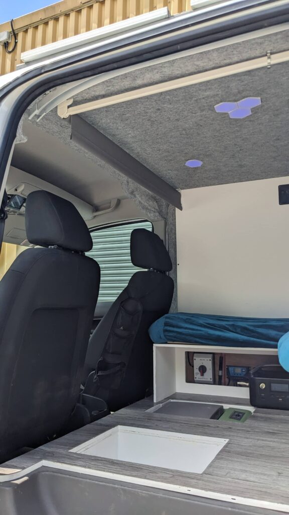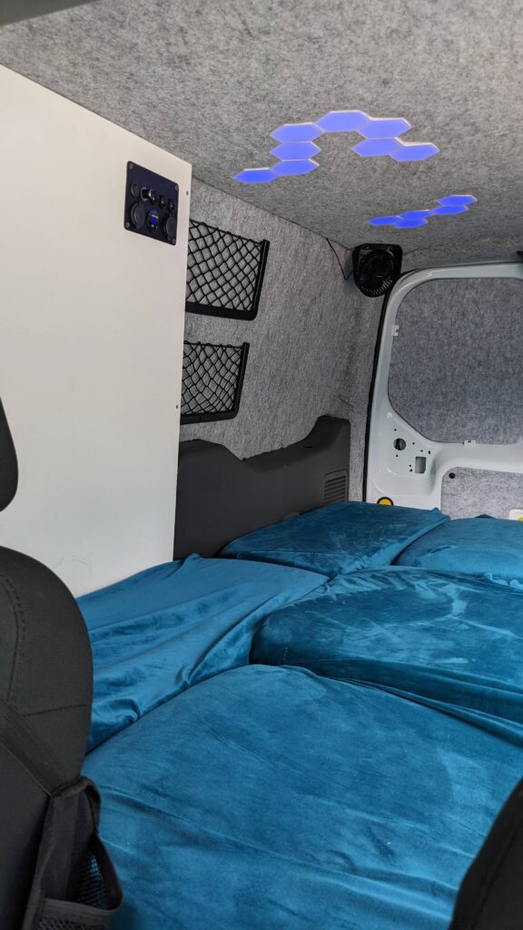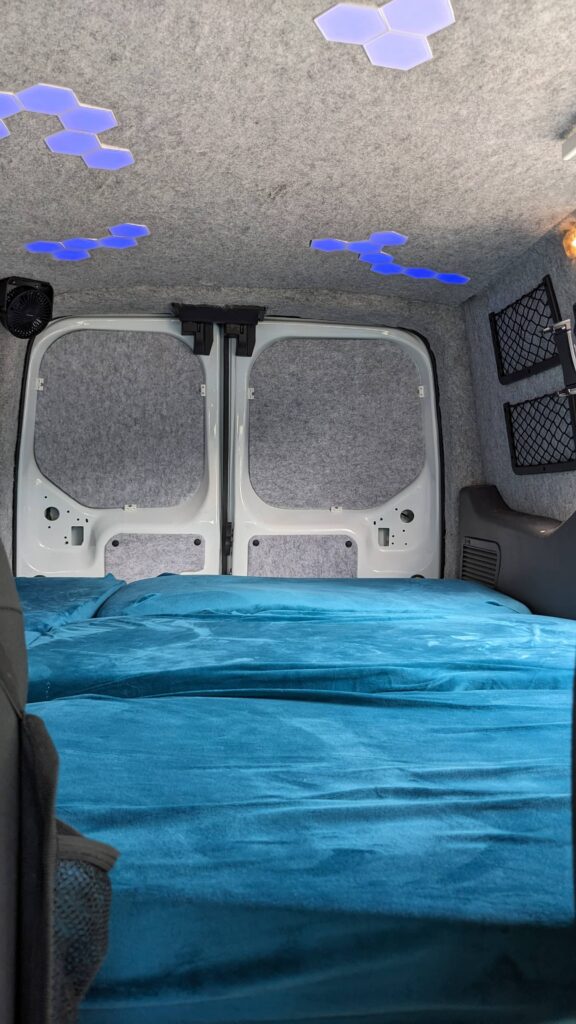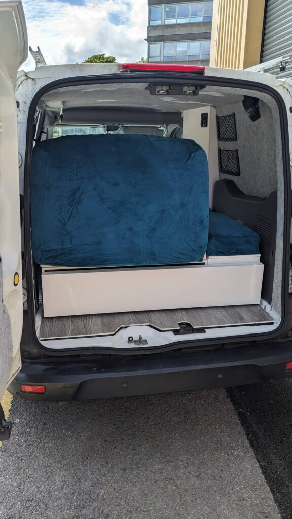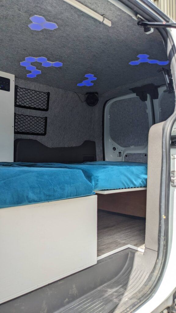 It has a folding bed that allows you to sit inside the van to relax and prep food and then fold it down for 2 people to sleep.