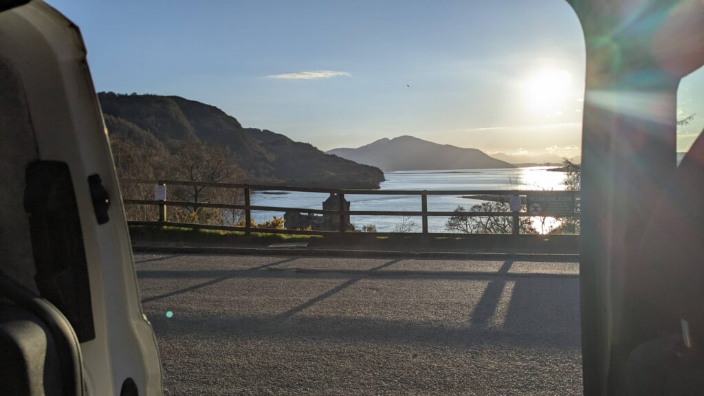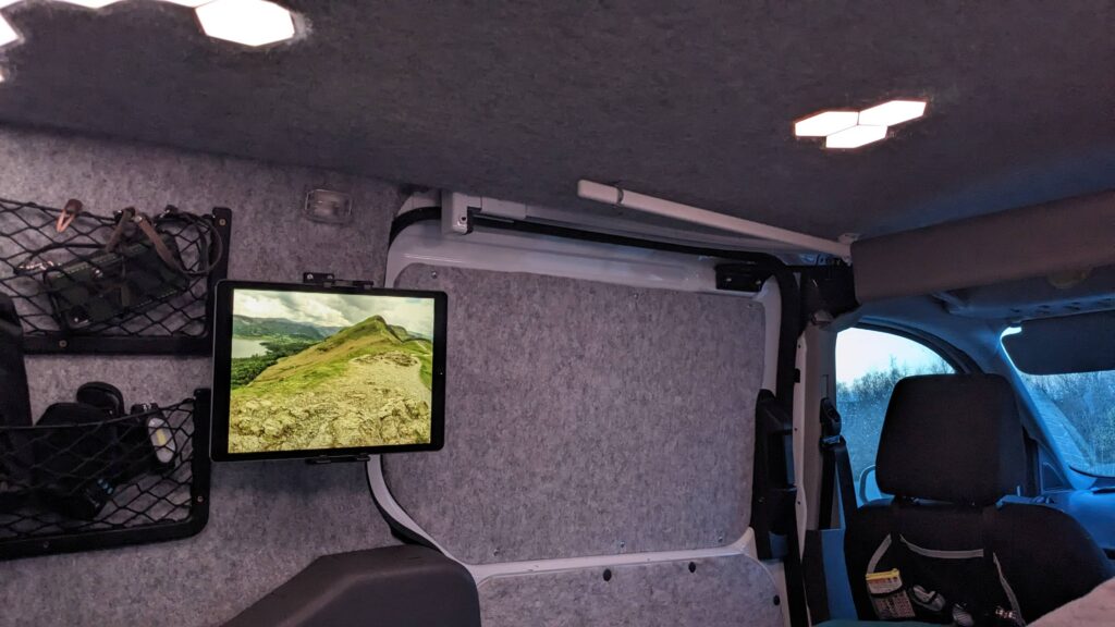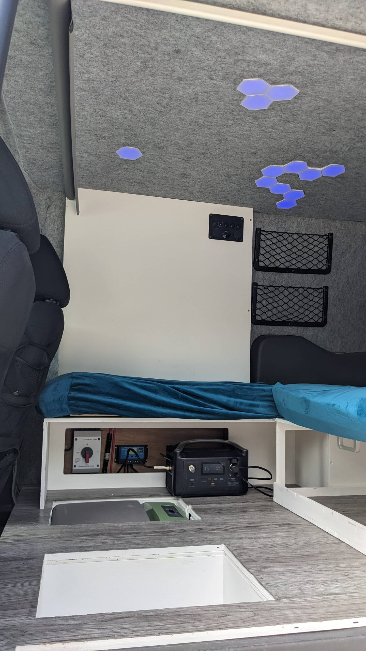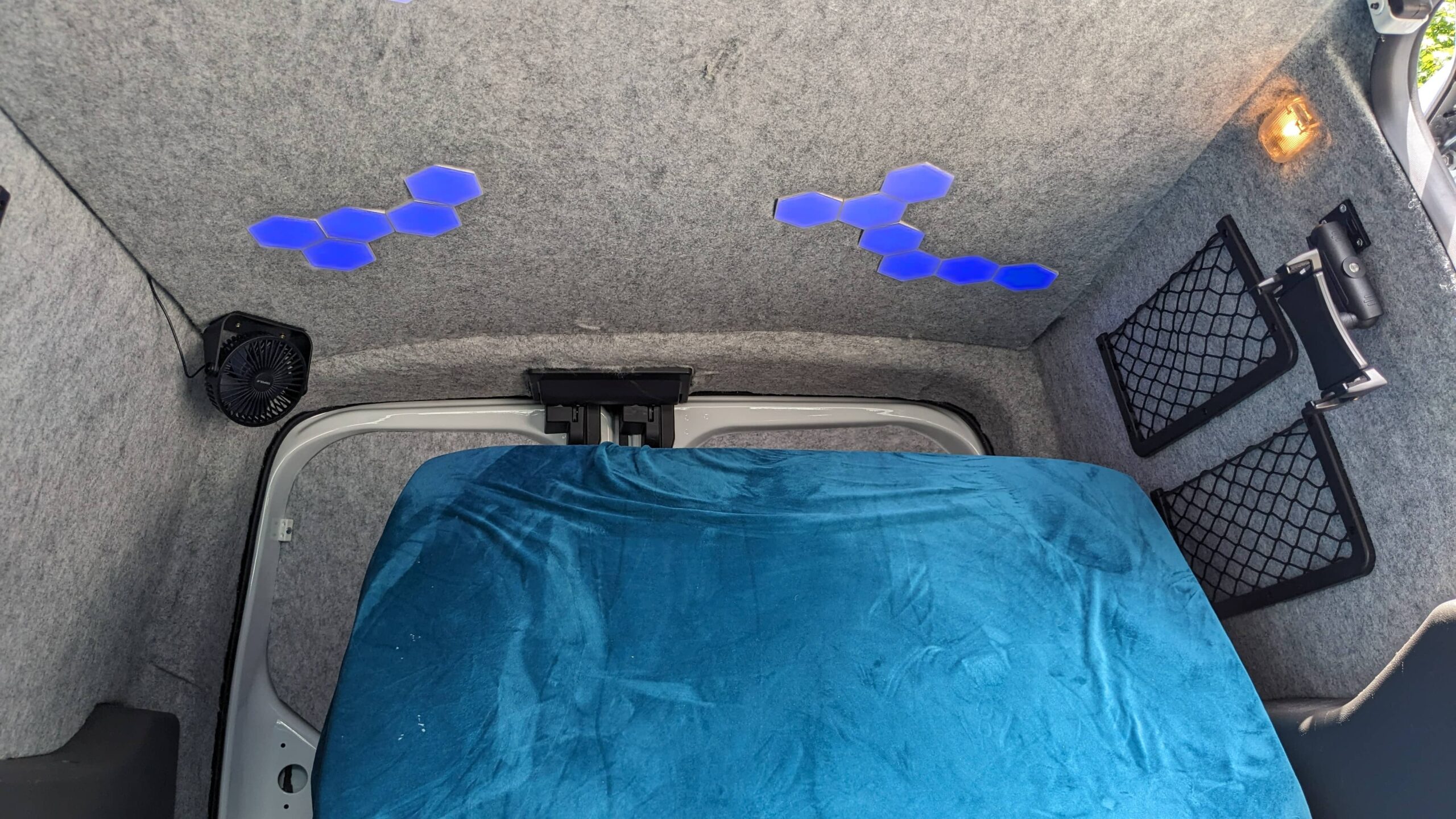 It has a folding bed that allows you to sit inside the van to relax and prep food and then fold it down for 2 people to sleep.