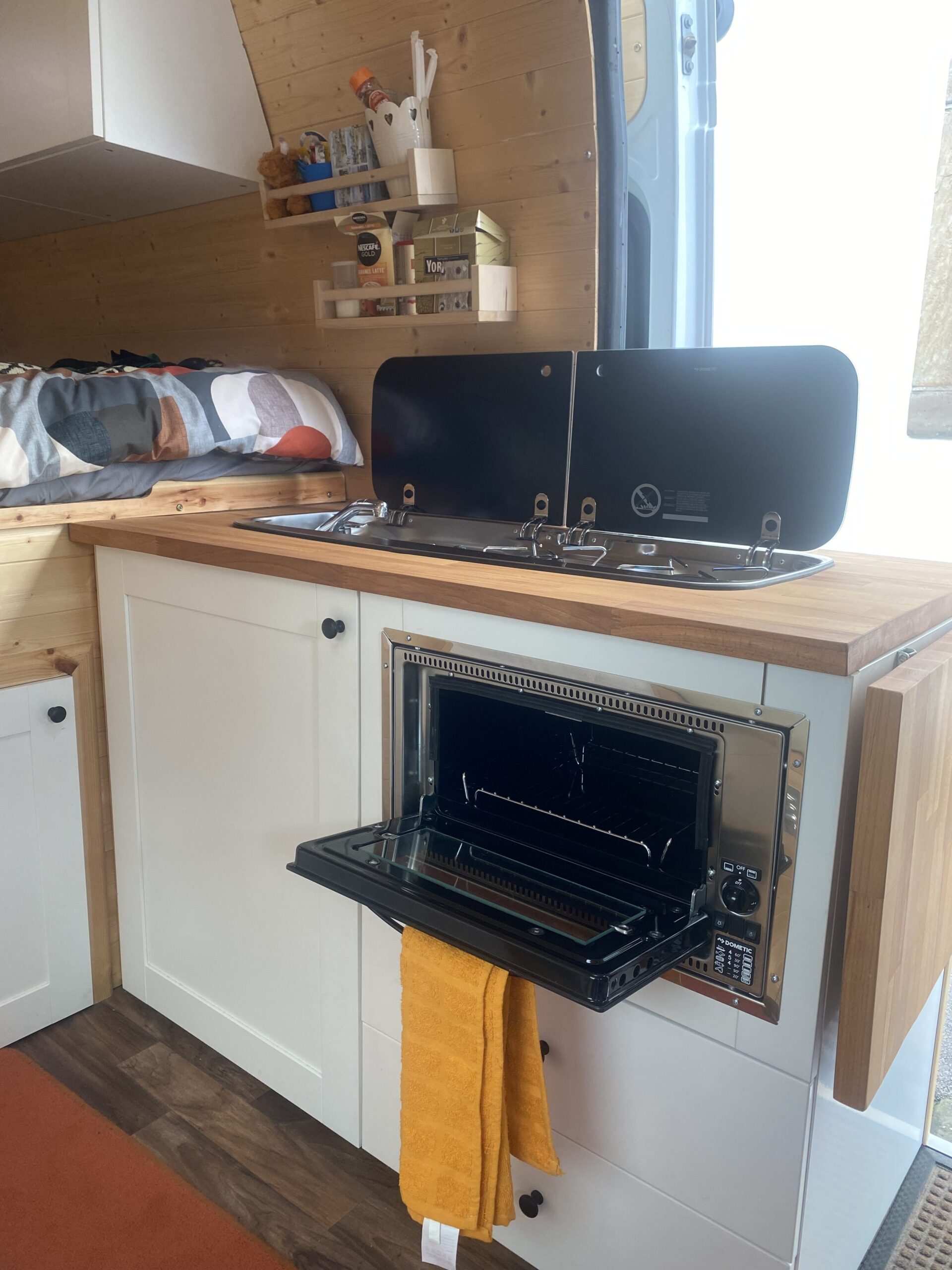 A Dometic double gas hob, sink and built in oven / grill, and Dometic top loading fridge make up the kitchen.