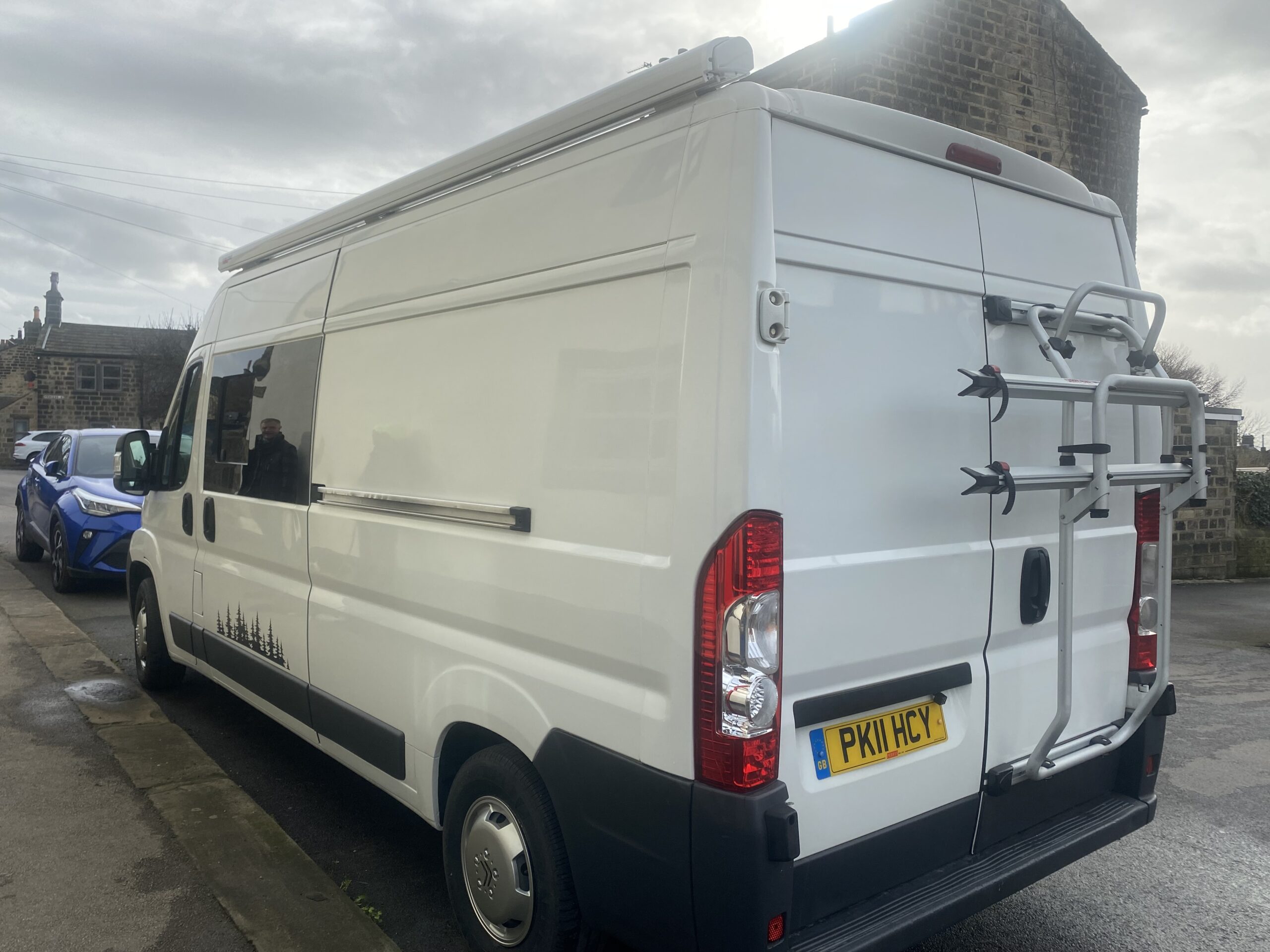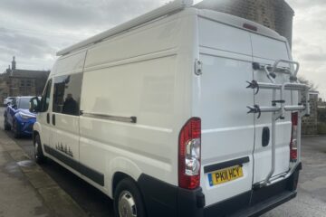 The campervan has two windows and two roof vents to create a light and airy feel, and the side door can be opened up to really let the outside in while you eat, read, or relax. Outside has a large Fiamma F80S awning and Fiamma Bike rack for two bikes.