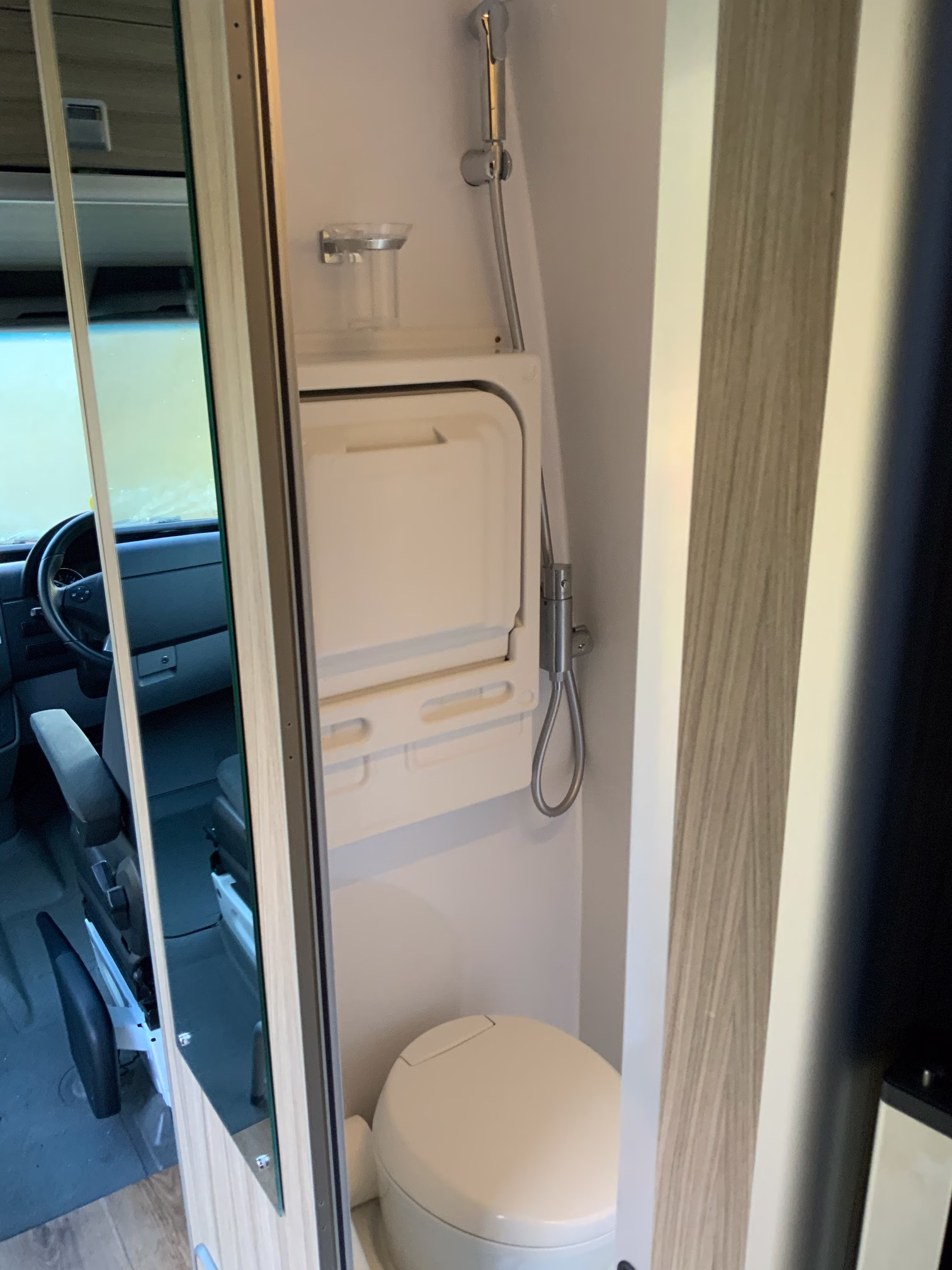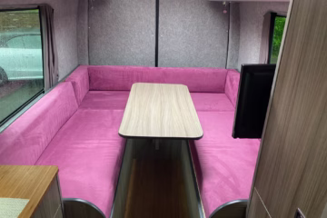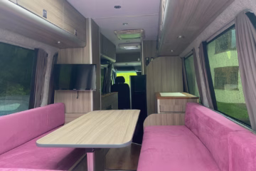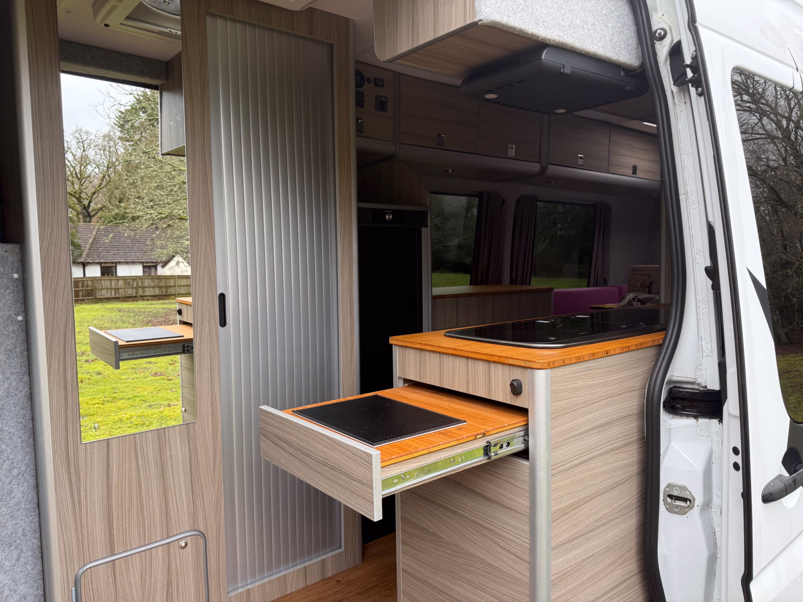 A unique body wrap design, rear air suspension, under slung 25l LPG gas tank, fresh and waste water under body tanks, whale space heater gas, whale water heater gas/electric, gas bbq connector, tow bar, rear camera, 320w solar panel and control system, 4.5m F80 Awning, Dometic 2200 Air conditioning unit, 4G Wifi unit, MaxxFan Deluxe roof vent, Dometic MIDI roof vent. All professionally fitted.