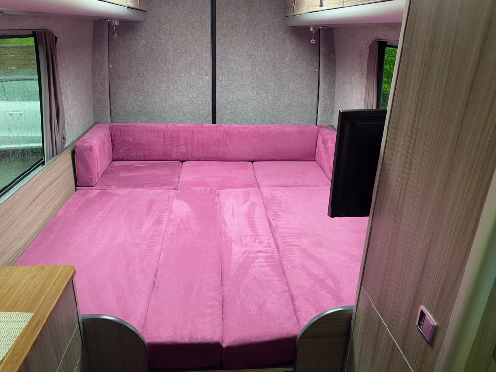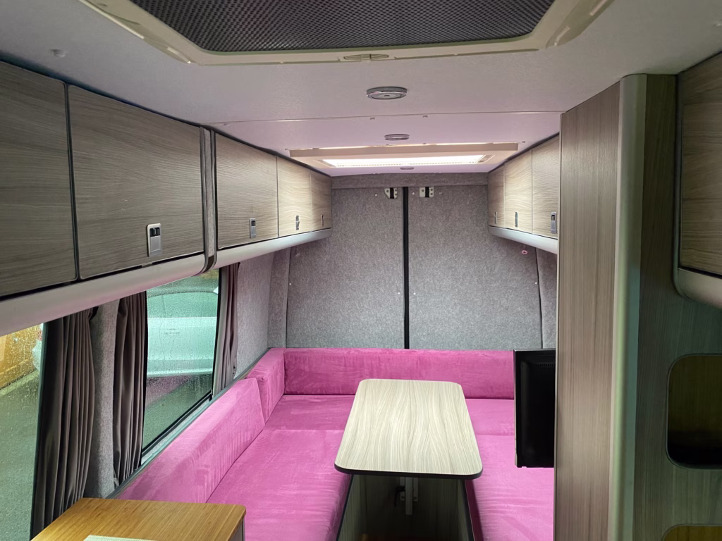 A unique body wrap design, rear air suspension, under slung 25l LPG gas tank, fresh and waste water under body tanks, whale space heater gas, whale water heater gas/electric, gas bbq connector, tow bar, rear camera, 320w solar panel and control system, 4.5m F80 Awning, Dometic 2200 Air conditioning unit, 4G Wifi unit, MaxxFan Deluxe roof vent, Dometic MIDI roof vent. All professionally fitted.