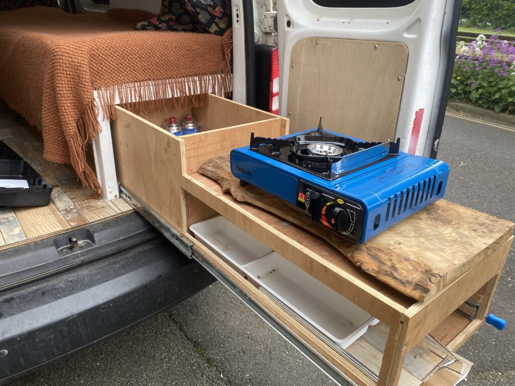**Kitchen on the Go:** Kitchen at the rear including a portable camping stove and a large, removable chopping board.