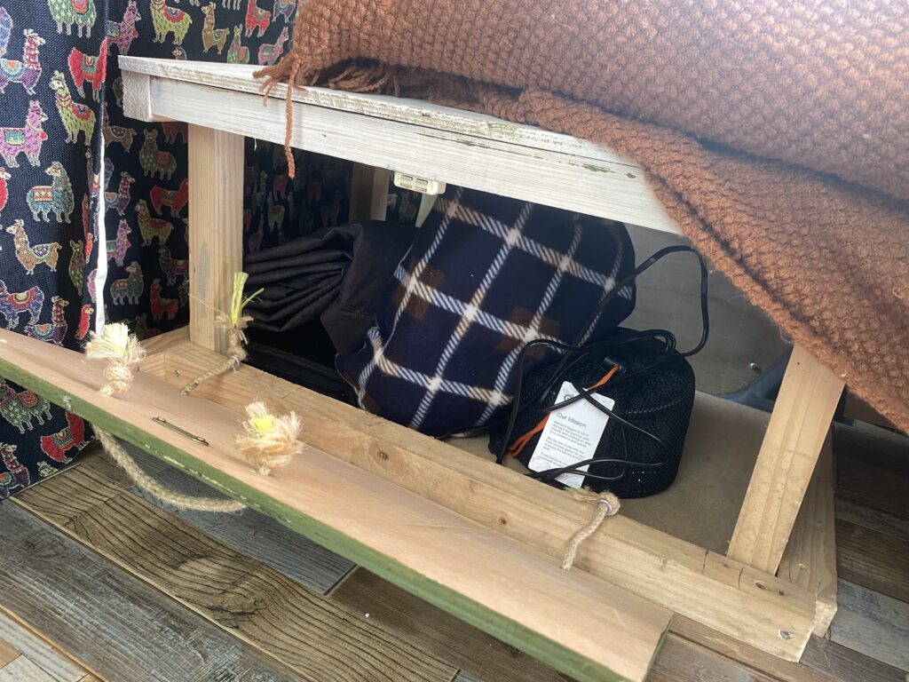 **Comfortable Living:** Single bed setup with the option to modify for a double bed (as in you could re-build with a double-bed if you wanted to), under-bed and cab storage, plus a removable swivel/yacht table. Insulated.