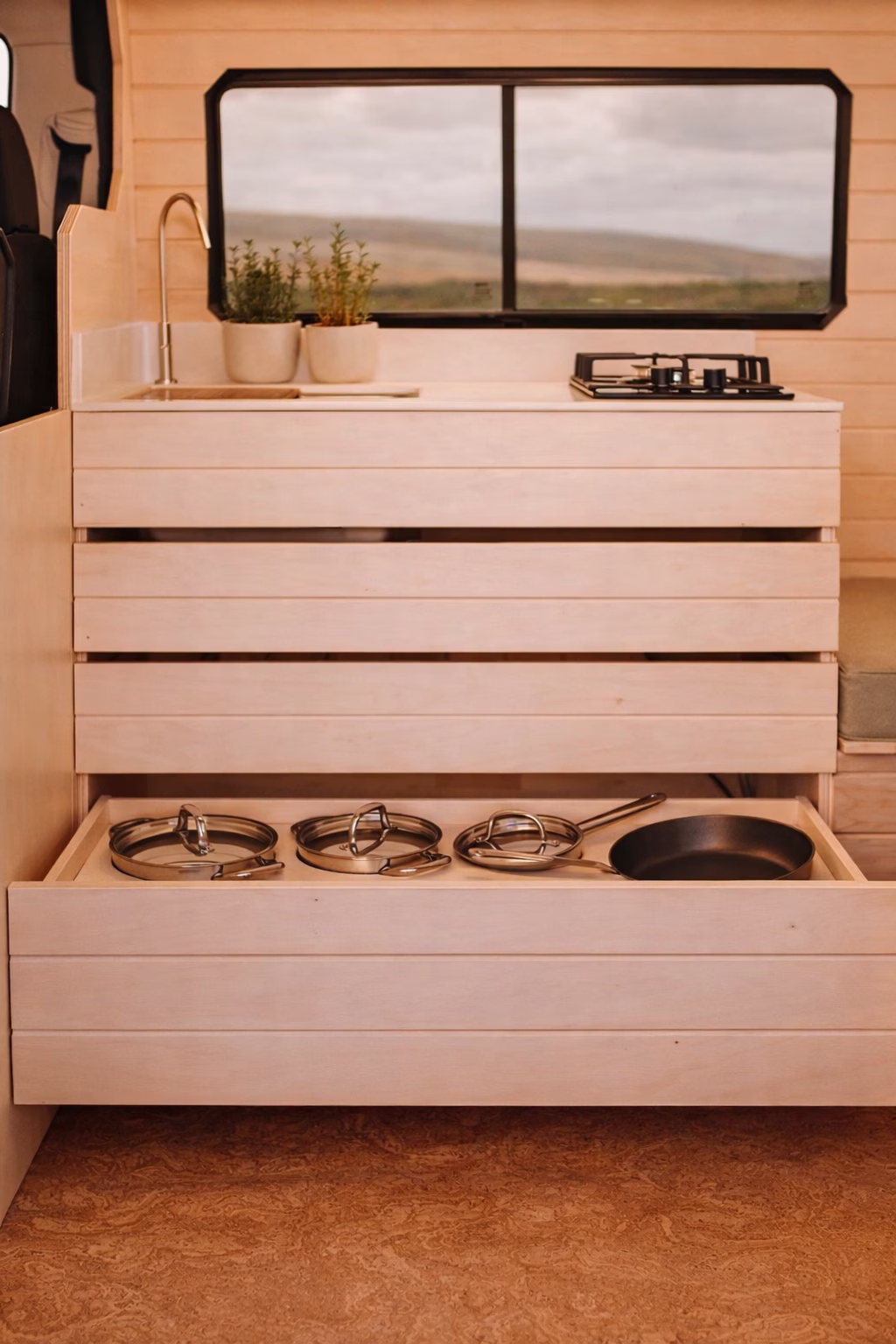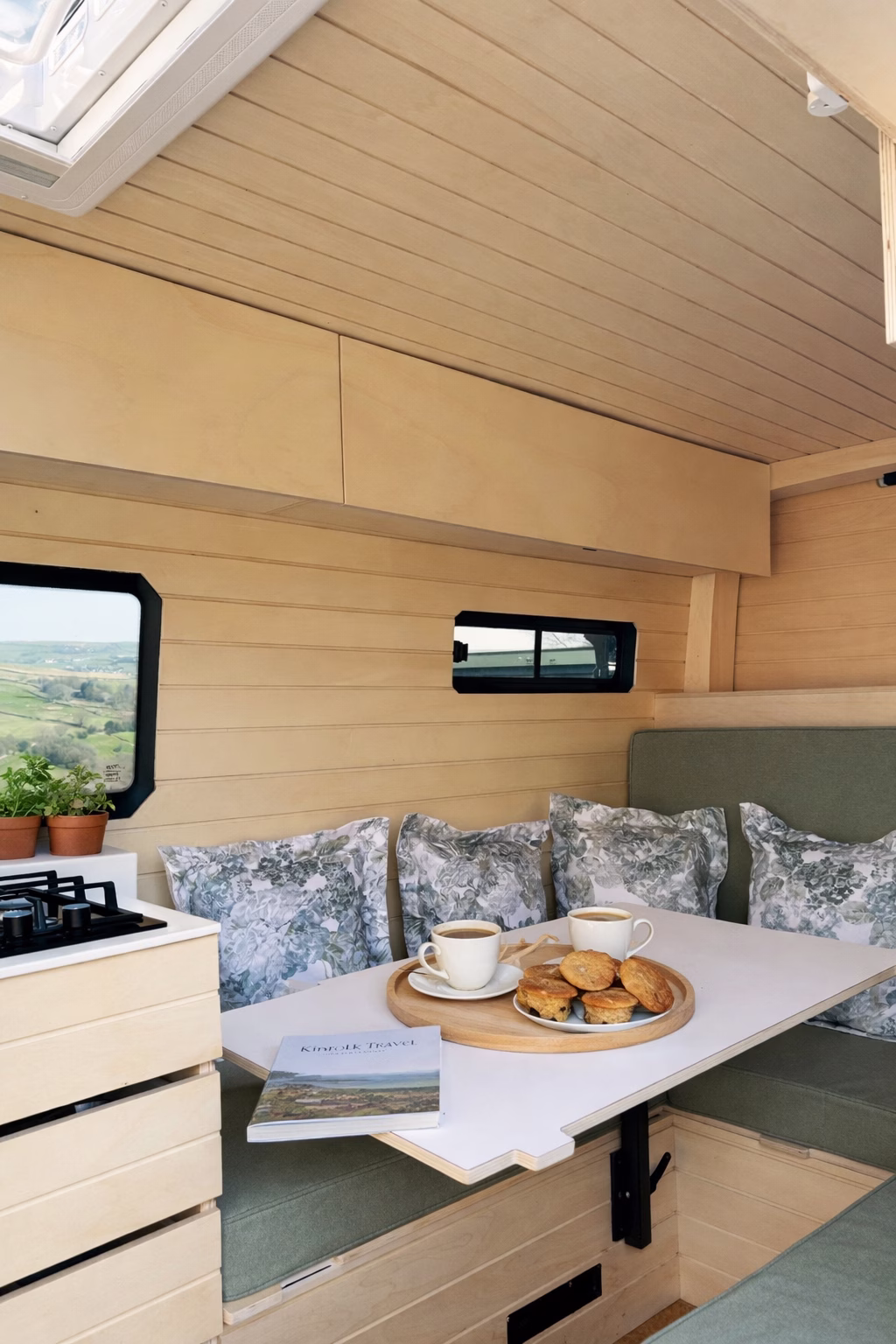Named Sylvana inspired by woodland landscapes and slow travel, the van has been designed to provide a peaceful and practical living space whether you’re exploring the mountains, the coast or quiet countryside.
