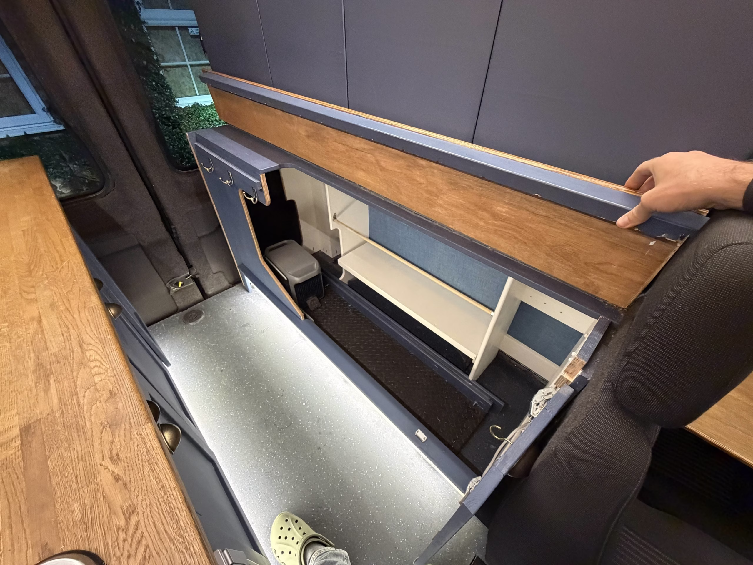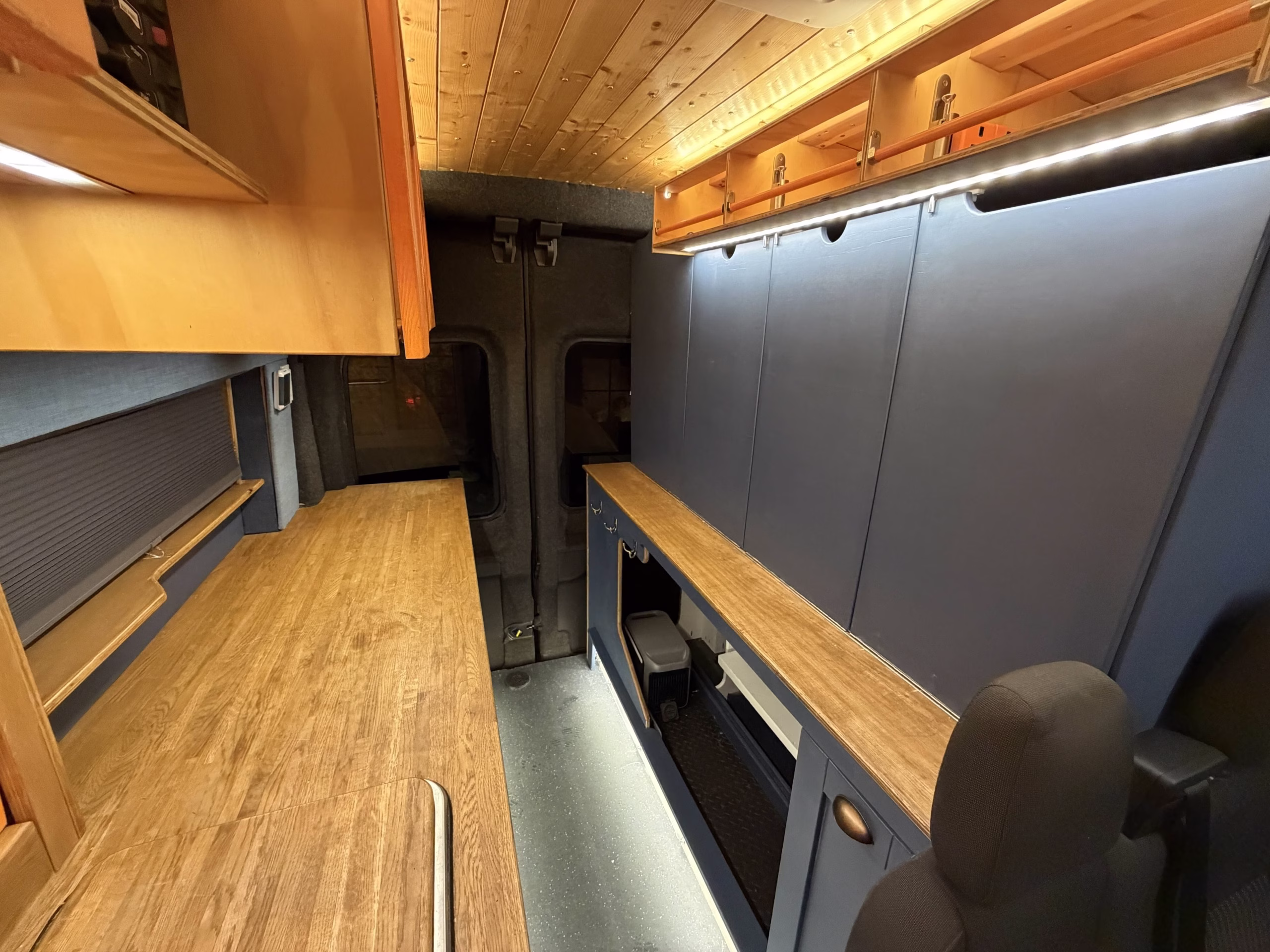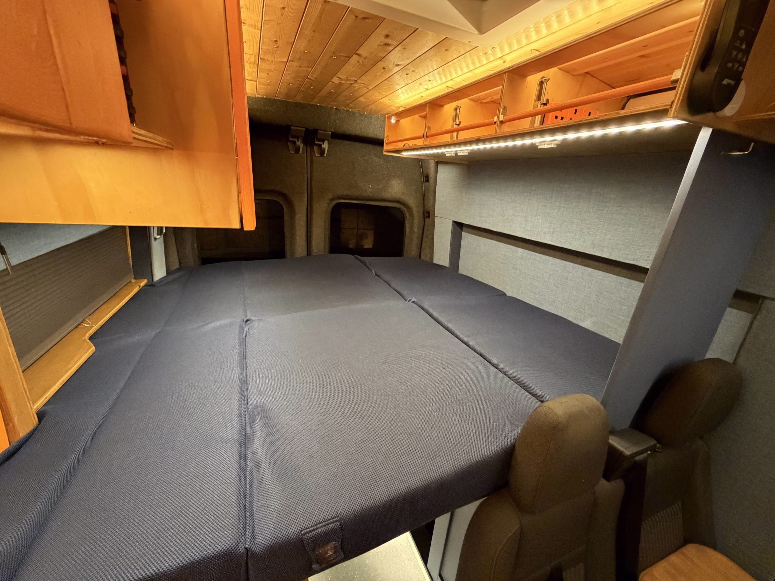massive murphy style fold-down bed 185cmW x 170cm L, the making of the back of the van multipurpose with a huge workbench and bike draw and storage. I sleep lengthways but a shorter person could sleep with ways in thr van