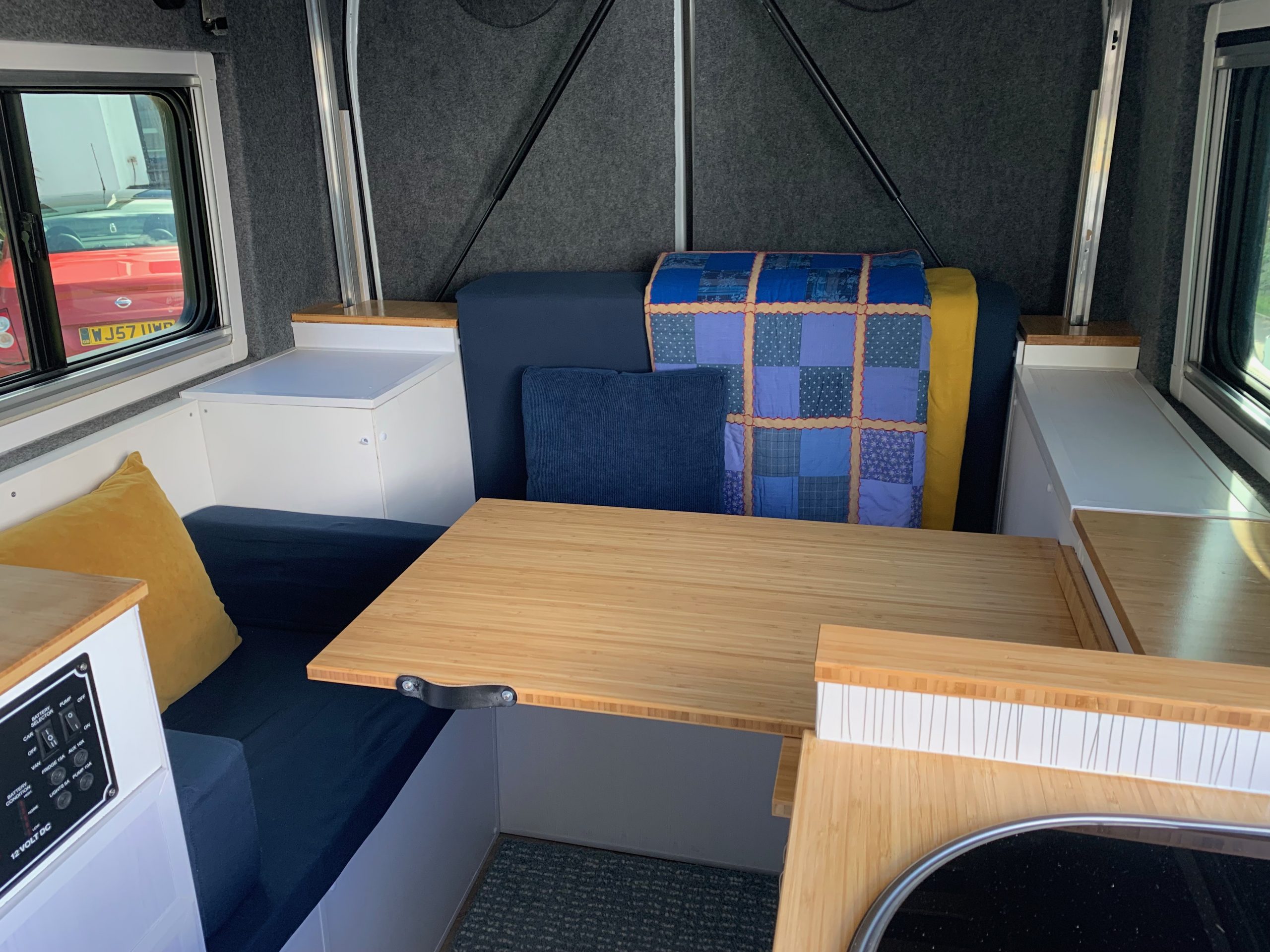 This was the biggest van we could get in our drive and so we needed a way to make a full size bed and enough seating fit in it, hence the gas strut idea, which we are really happy with.