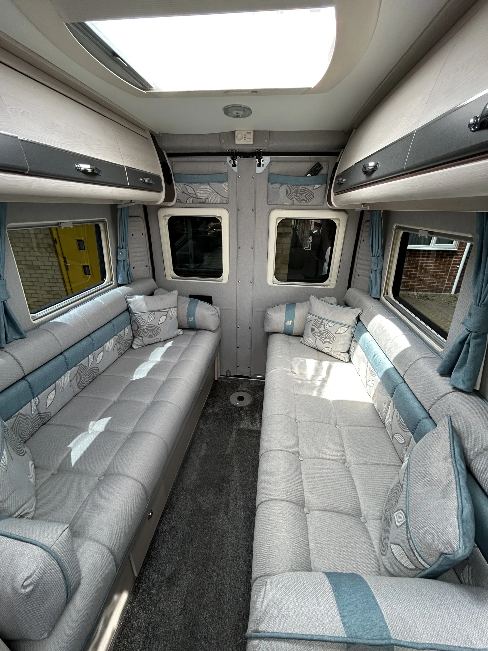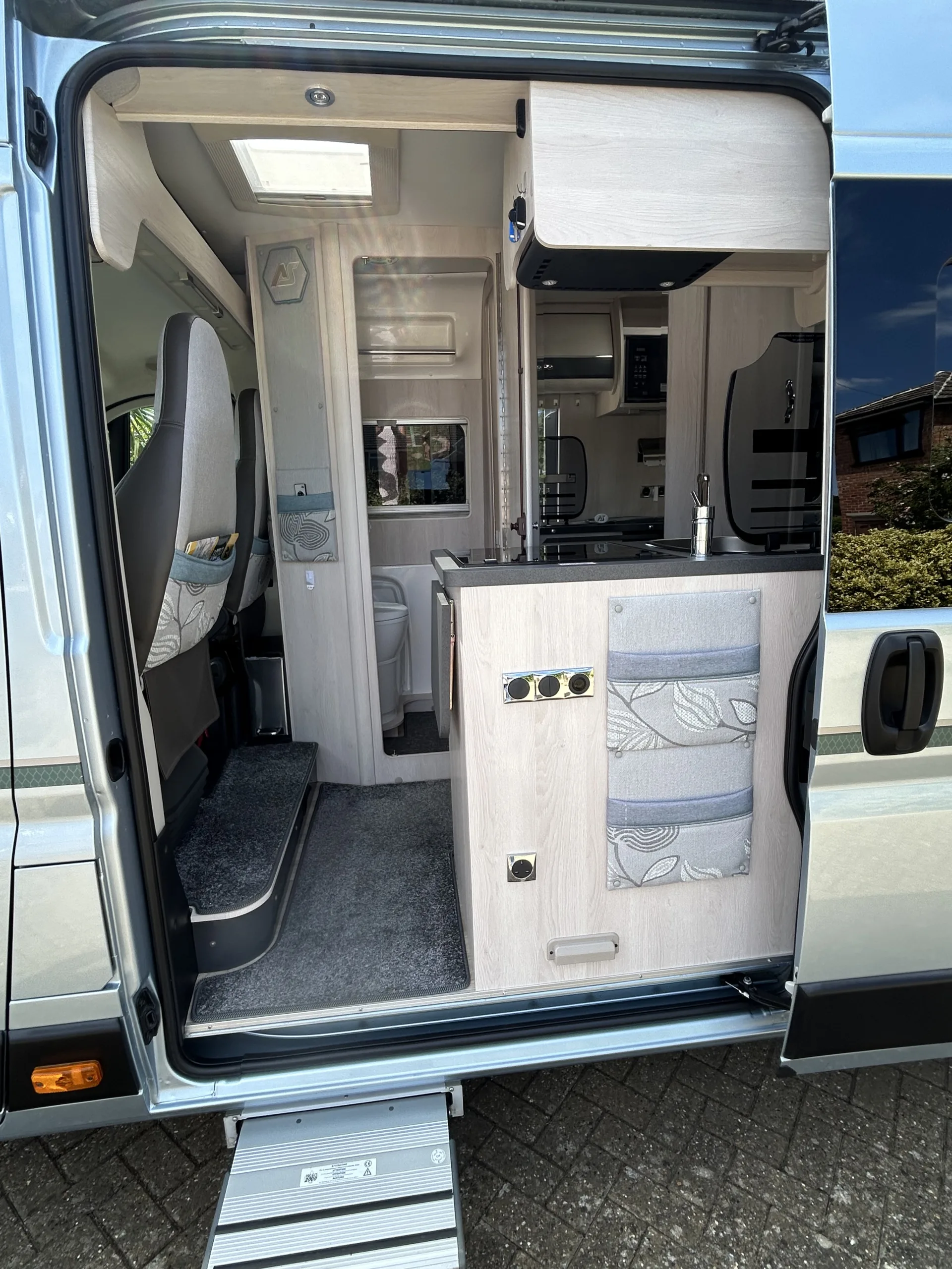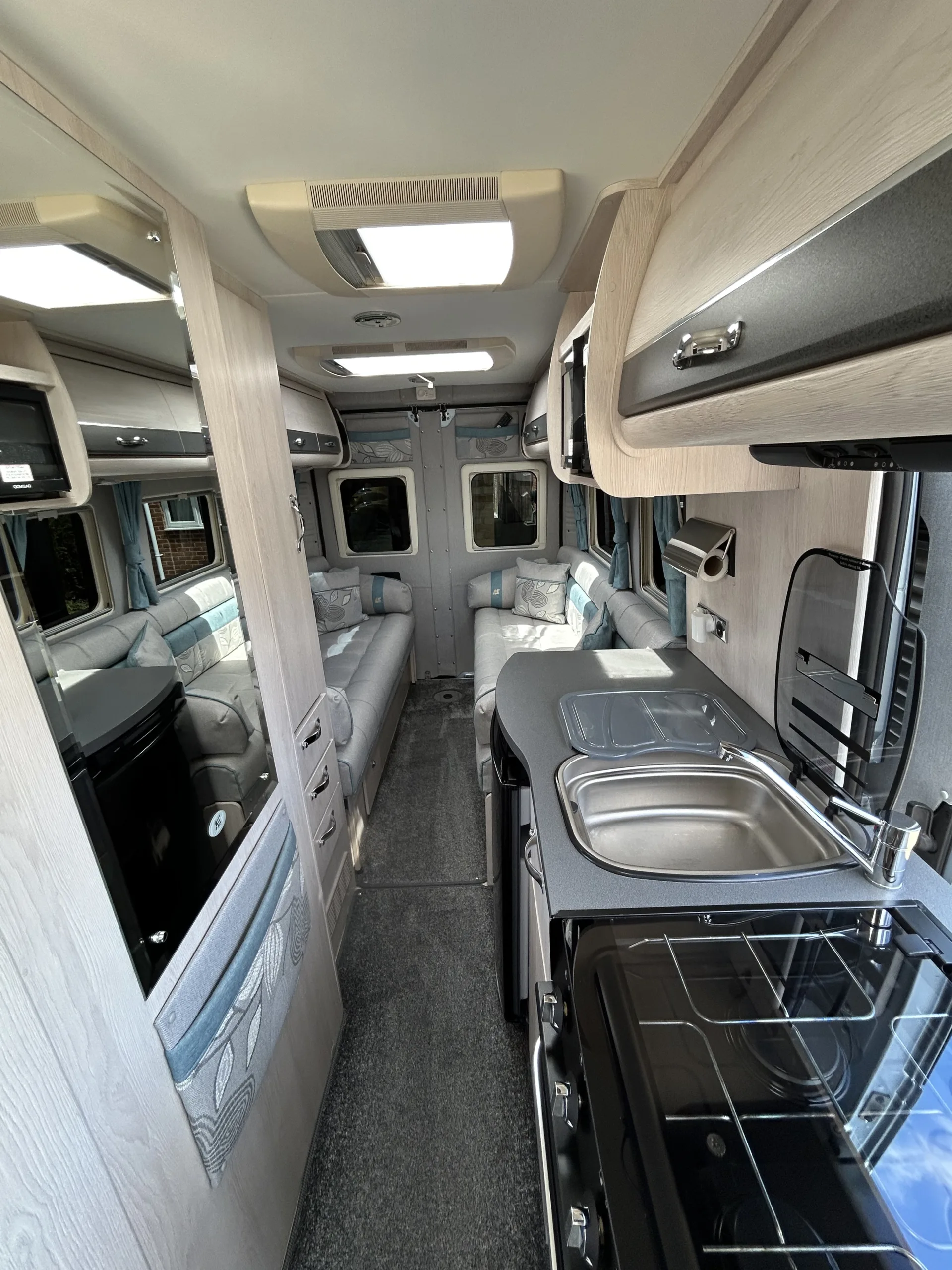 An immaculate 2.3L 2 berth campervan. Mileage 9941. Automatic gearbox. Winter and premium packs. Includes separate shower, toilet, microwave, oven, 3 ring hob, TV, awning, towbar, heating system, fridge and freezer. Hot water, heating and fridge can be run from gas or electric. An under slung LPG gas tank. Serviced – 12/0725. Habitation service – 18/07/25. Rear lounge converts to two single beds or one king size bed.